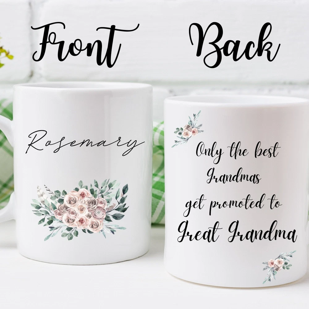Great Grandma Coffee Mug Great Grandma Pregnancy Announcement Personalized Mug Product Details.. This high quality 11oz. ceramic white mug has a premium hard coat that provides crisp and vibrant color reproduction sure to last for years. Perfect for all hot & cold beverages. The highest quality printing possible is used. It will never fade no matter how many times you wash it. Material: 100% Ceramic. Print both sides. Dishwasher and Microwave Safe. High Gloss + Premium White Finish. Printed in the U.S.A. Personalized & Custom. We support personalized and custom mug to add custom, when placing an order, you can add notes to the "order note" in shipping address section. Also you can contact us directly via message. Shipping Info. Ready to ship in 1 to 2 business days, All products are made-to-order and proudly printed in the United States. Shipped by USPS and DHL, You will receive your order in 5-7 days. Replace & Refund. All products are defective during shipping broken, chipped will be replaced free of charge. You are not satisfied with the product, we will refund 100% money to you. If any other issues arise, please do not hesitate to message, we would be more than happy to assist you.