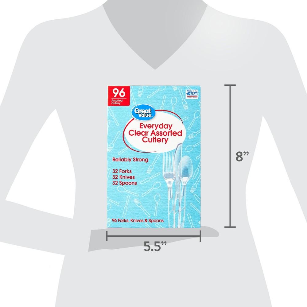 This clear cutlery set from Great Value is perfect for any occasion, whether it's a party, everyday use, brunch, or holiday celebration. With 96 pieces, you'll have plenty of utensils to serve your guests. The plastic material ensures durability and the recyclable symbol on the product package code makes it a great choice for those who want to be environmentally conscious. The set includes a variety of utensils, making it a versatile addition to your tableware collection. The clear color adds a touch of elegance to any table setting. This product is made in the United States and is disposable, making it a convenient option for any event.