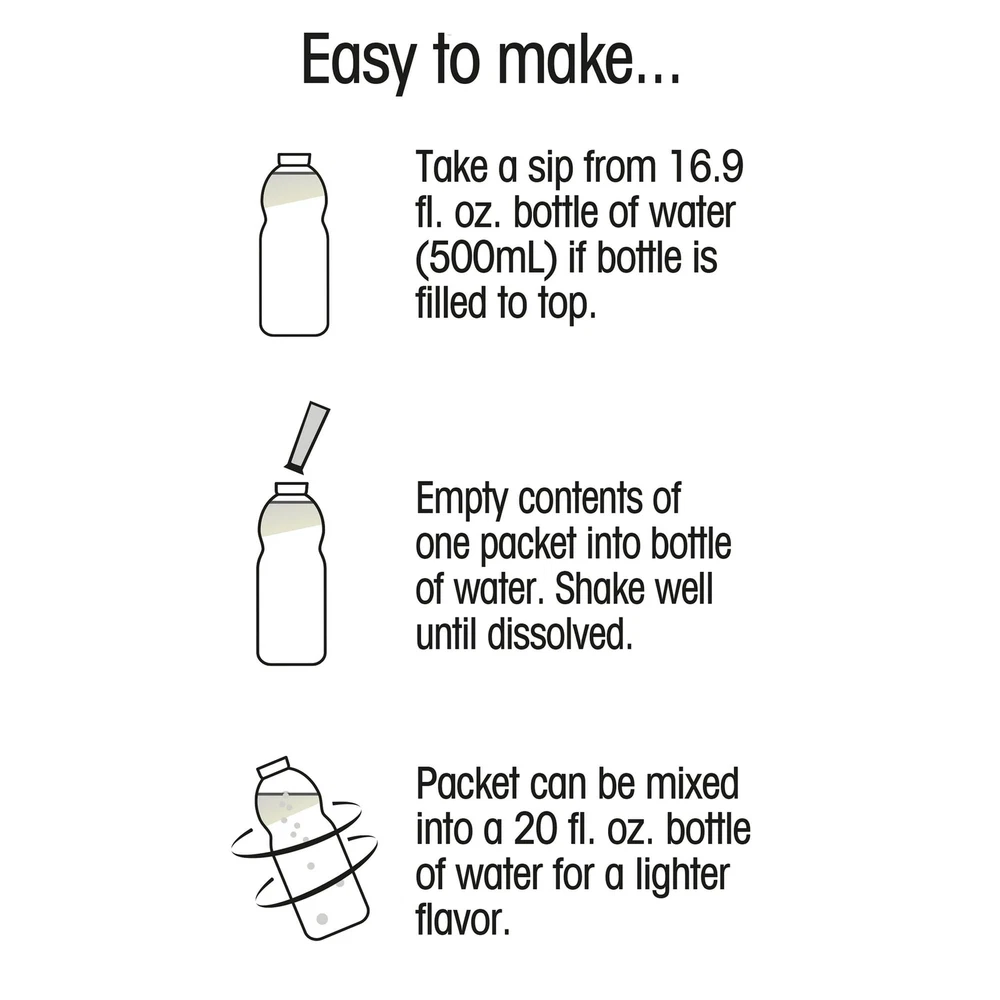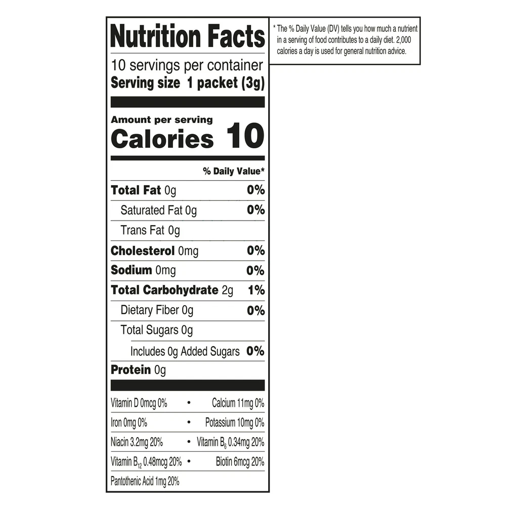 Product details Each box of Great Value Cherry Slush Energy contains 10 Singles To Go and is a naturally and artificially flavored, low calorie drink mix containing zero sugar, and is gluten free and Kosher. High in 5 B Vitamins. Contains 120mg Caffeine Per Serving. Contains 120mg Caffeine Per Serving. Zero Sugar, Low Calorie, Kosher and Gluten Free Drink Mix. Each serving is high in five B Vitamins. Easy to Make SIP from a full bottle of water to make room for powder. POUR one stick into a 16.9 fl. oz. bottle of water or a large glass of water. SHAKE bottle or mix well until powder dissolves.
