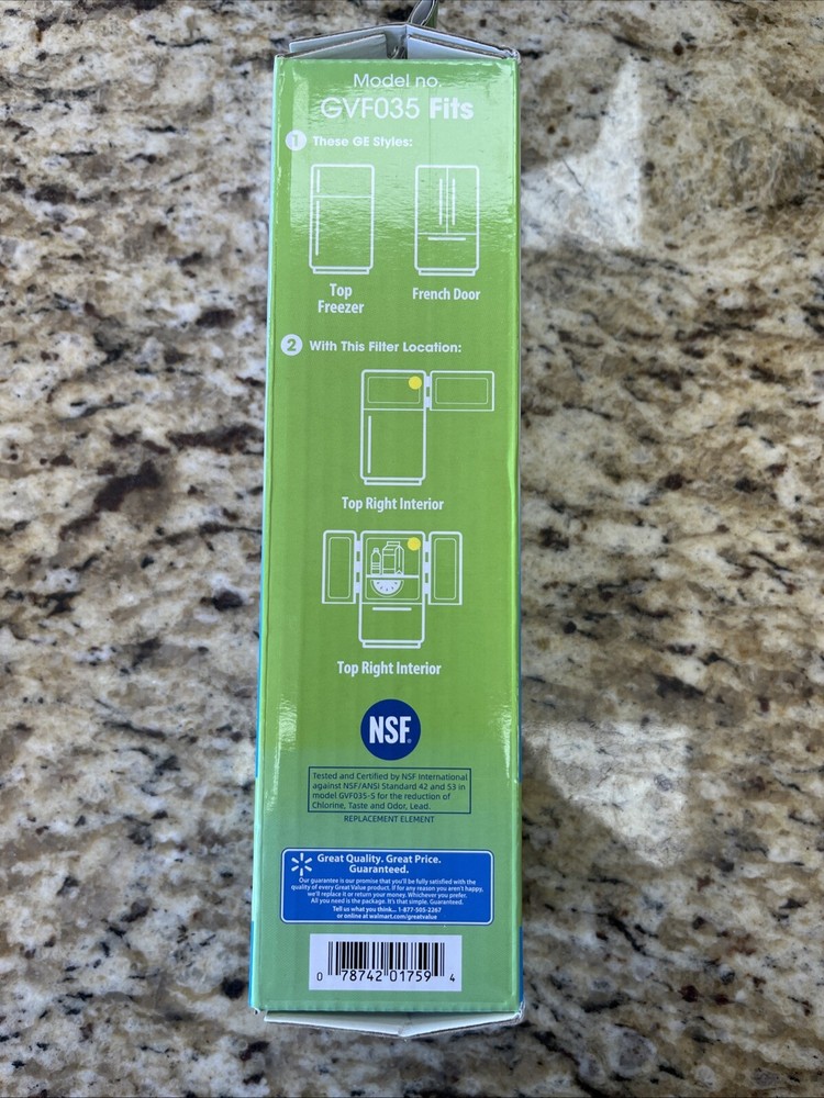 Great Value Refrigerator Filter Model No. GVF035 is a white plastic replacement filter designed for GE and Kenmore refrigerators. This refrigerator filter is specifically designed to remove lead contamination from your drinking water. It comes as a single pack and is a cost-effective option for ensuring clean and safe water for your household.