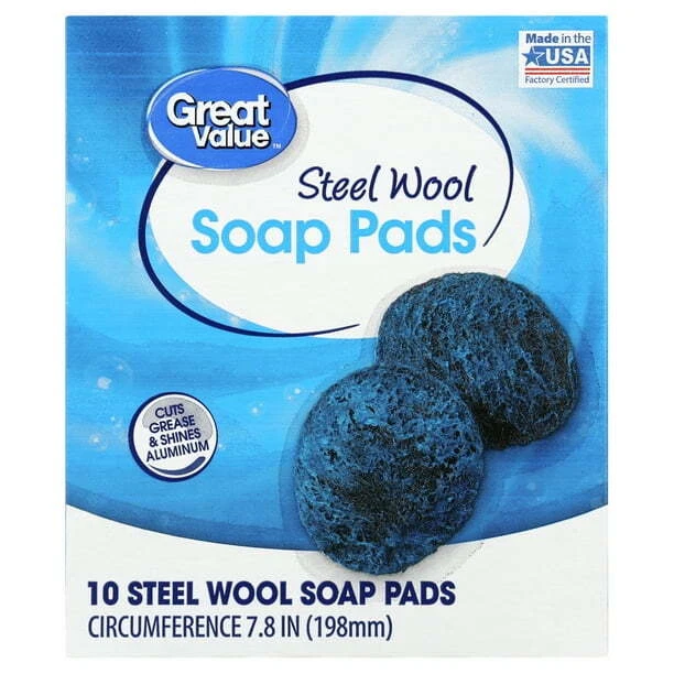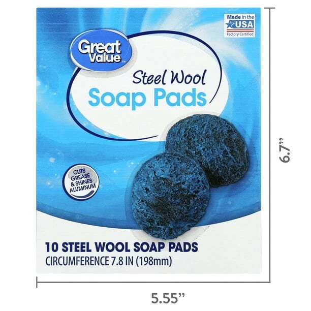 Great Value Steel Wool Soap Pads are an all-purpose cleaning product designed for kitchen use. The pack includes 10 pad, each made with steel wool and soap for effective cleaning. These pads are a great value option for tackling tough messes and stains in the kitchen.