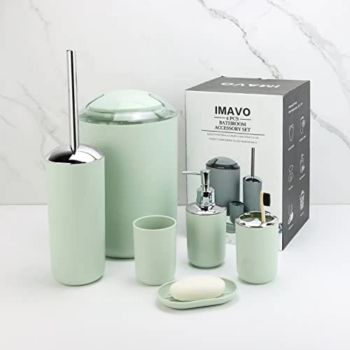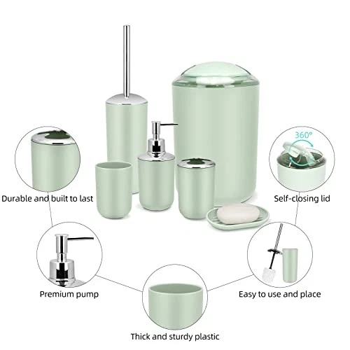 Return Policy Fast Delivery Trusted seller Bathroom Accessories Set,Green Bathroom Set,7 Pieces Bathroom Accessory Set,Tray,Toilet Brush,Trash Can for Bathroom Décor and Housewarming Gifts Product Description Plastic Complete Bathroom Accessory Set:Featuring a Toothbrush Holder,Toothbrush Cup,Soap Dispenser,Soap Dish,Trash Can,Toilet Brush & Holder,our bathroom accessories set ensures a unified and stylish bathroom aesthetic. Durable Design:Our Grey bathroom accessories set crafted from Durable and cleanable plastic, it effortlessly withstands daily wear and tear, ensuring long-lasting use. Space-Saving Design:Maximize your bathroom space with our compact and cleverly designed grey bathroom accessories set.Whether you have a small powder room or a spacious master bathroom, our bathroom accessories set offers smart storage solutions without taking up unnecessary space. Vibrant and Stylish:Add a pop of color and style to your bathroom with our vibrant and modern bathroom accessories set. they effortlessly enhance the aesthetics of your space while providing practical functionality. Versatile & Nice Gift:Our bathroom accessories set is a perfect fit for any space, whether it's your home bathroom, dorm, hotel, or RV. Its modern design effortlessly complements any bathroom, making it an ideal present for housewarmings or new homes.Whether it's for your family, friends, colleagues, or customers, this bathroom accessories set makes the nice gift. Shipping Returns Payment Shipping Shipping is FREE to all addresses other than APO/PO boxes in the lower 48 states. All our stock ships from US-based warehouses. Shipped via USPS or UPS (depending on location and package weight) Unless stated otherwise, all orders will ship within 24-72 hours of your payment being processed. Check our feedback to see the great reviews of FAST shipping we offer. Returns Seller does not accept returns Payment We currently accept payment via eBay managed payments only. Once payment is cleared, we will dispatch your shipment within 1-3 business days. Please refer to the "Shipping" tab for more information regarding shipping speed to your destination.