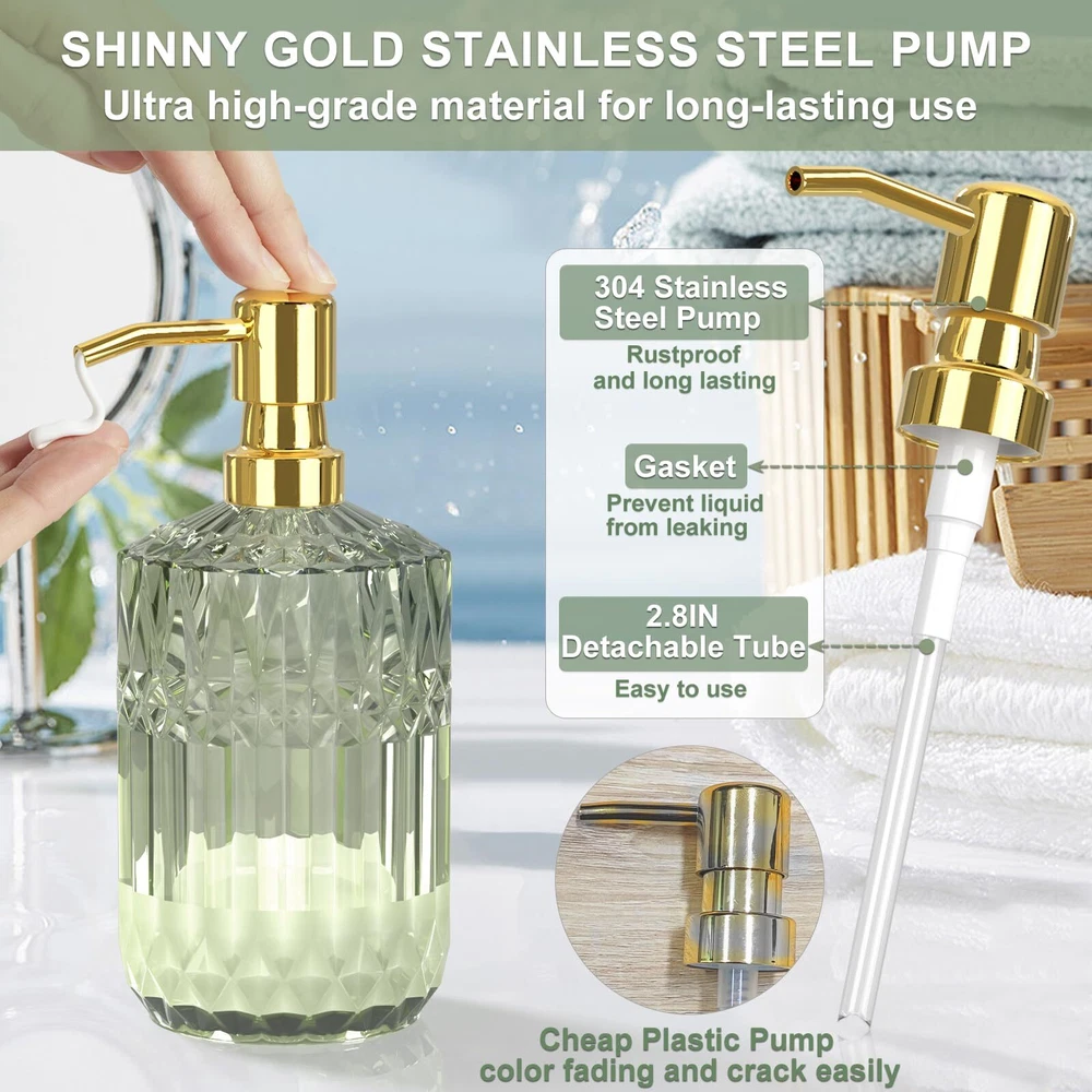 【WONDERFUL BATHROOM STORAGE SOLUTION】Do you want to an elegant and elevating storage solution for bathroom countertops? Our green bathroom accessories include a soap dispenser and toothbrush holder, soap dish, tumbler, and cotton swab jar, perfect for storing your toiletries or cosmetics, and keeping your bathroom counter fully organized and neatly . 【DURABLE HEAVY CUT GLASS】Unlike other fragile ceramic and inferior plastic bathroom accessories on the market, this set is made from high-quality glass material, which is sturdy and resistant to cracks and chips, even with daily use. It also has an easy-to-clean surface, making it simple to maintain and keep looking like new. 【STYLISH BATHROOM SET WITH UNIQUE DESIGN】This green bathroom decor features a unique design that is both stylish and functional. The green soap dispenser is suitable for hand soap, dish soap, conditioner, lotion, etc. The cotton swab jar comes with a lid that effectively prevents dust and water stains from entering, keeping cotton swabs, and cotton balls clean. The glass material and green color add a touch of sophistication to any bathroom decor. 【DECORATIONS FOR HOME OR BATHROOM】The bathroom set is versatile and can fit various styles from traditional to contemporary. It's suitable for modern, rustic, farmhouse and western styles, making it ideal for use in the bedroom, bathroom, kitchen decor, etc. It also can be a great christmas bathroom decor with green. 【ELEGANT GIFT SET FOR ANY OCCASION】This bathroom accessories set is not only a valuable addition to any home, but also a perfect gift for any occasion. It's an excellent choice for housewarming&new home gift, wedding gift, birthday gift, mother’s day gift, valentine’s day gift, Christmas gift, etc. 【PACKAGING UPGRADE&No BREAKING】Adopting high-quality pearl cotton internal packaging to reduce the risk of transportation breakage. Refuse to break the lid! PLEASE ATTENTION! After receiving the item, please open the packaging and check if the glass is broken. If so, please feel free to us and we will make it right immediately. Thanks for your patience. 【WARM TIPS】 Due to the strong or weak reflection of light in the bathroom, it may cause certain color differences in glass bathroom accessories. The brighter the light, the brighter the color of glass products. The weaker the light, the darker the color of the glass products.