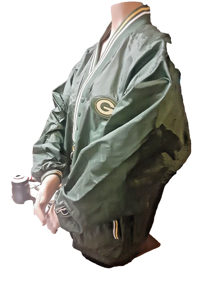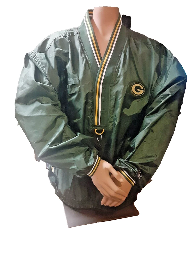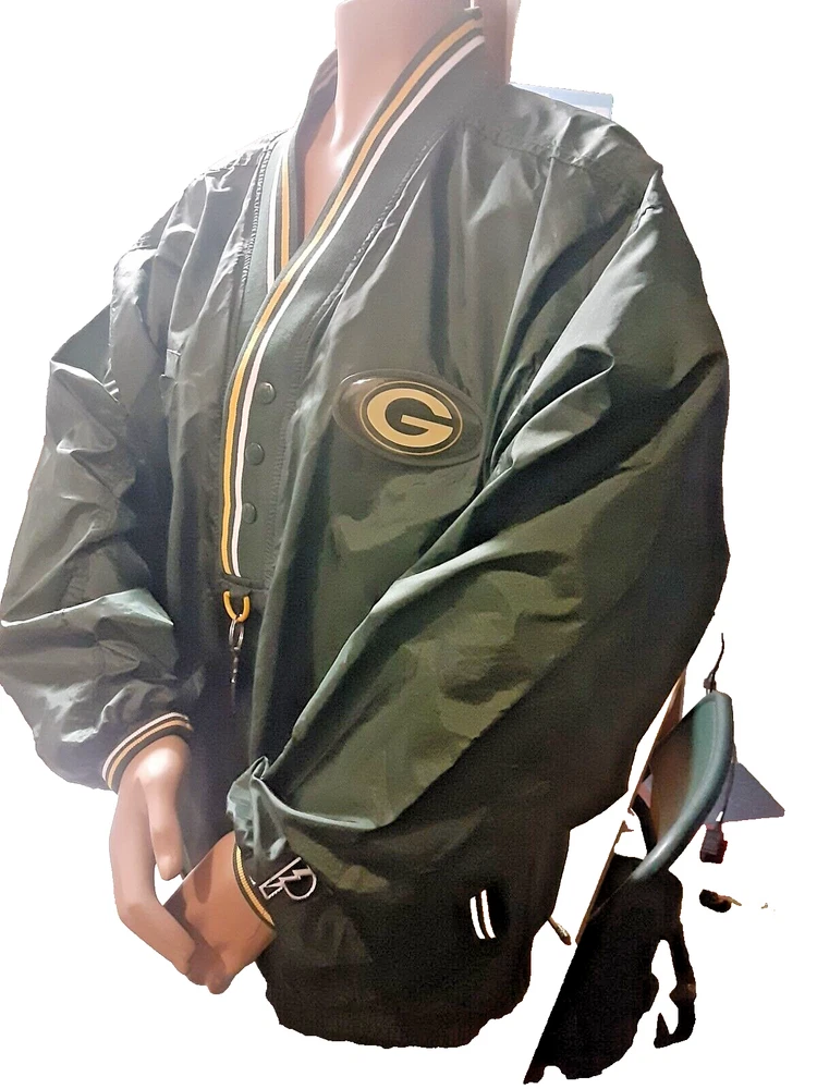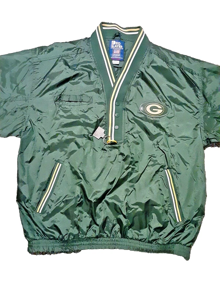 Show off your love for the Green Bay Packers with this officially licensed Pro Player jersey. Featuring a classic V-neckline and long sleeves, this windbreaker style jersey is perfect for any football fan. The snap closure and nylon fabric make it easy to wear and comfortable for all-day wear. This size L jersey is designed for men and has a regular fit. The green and yellow color combination is perfect for any Packers game day outfit. Made in Korea, this jersey is a must-have for any NFL fan's collection.