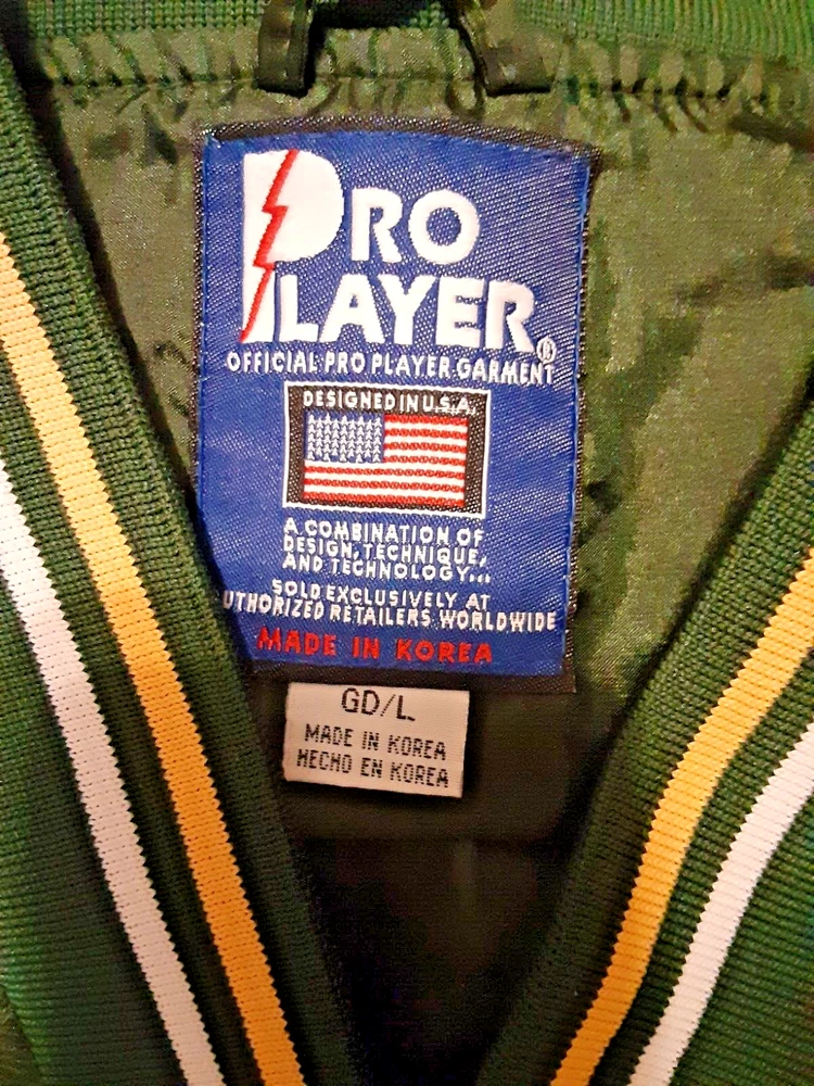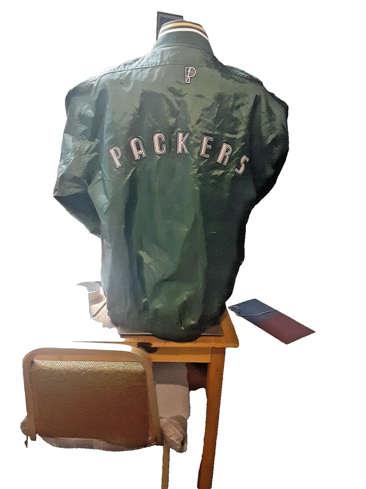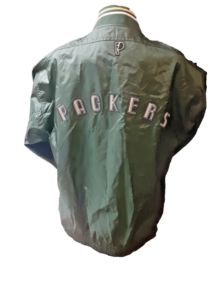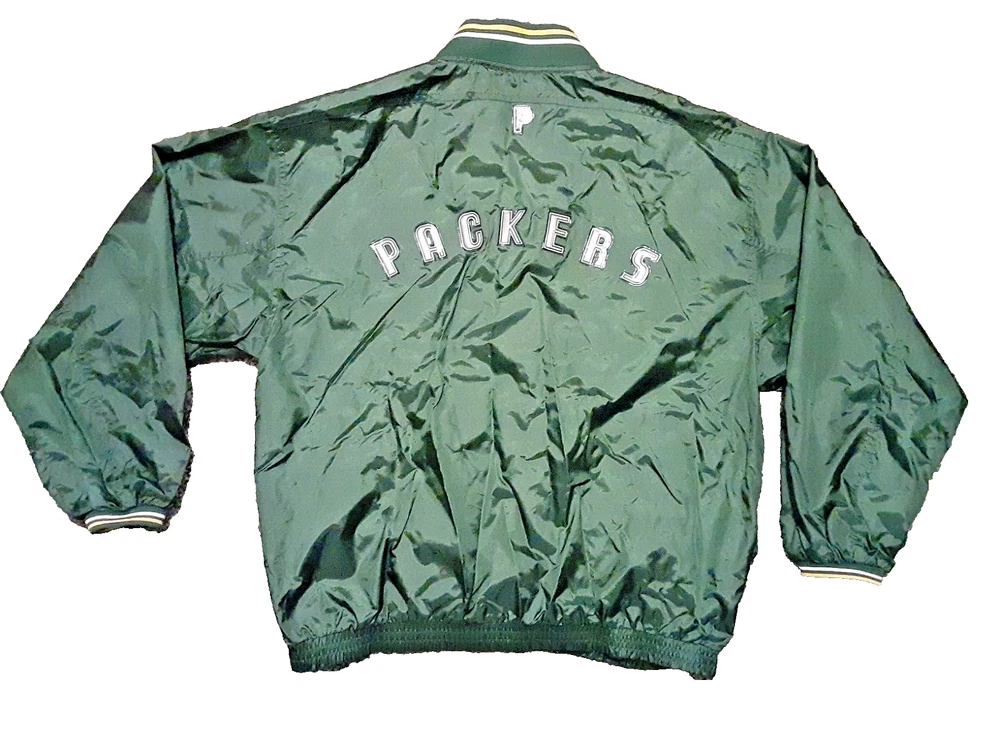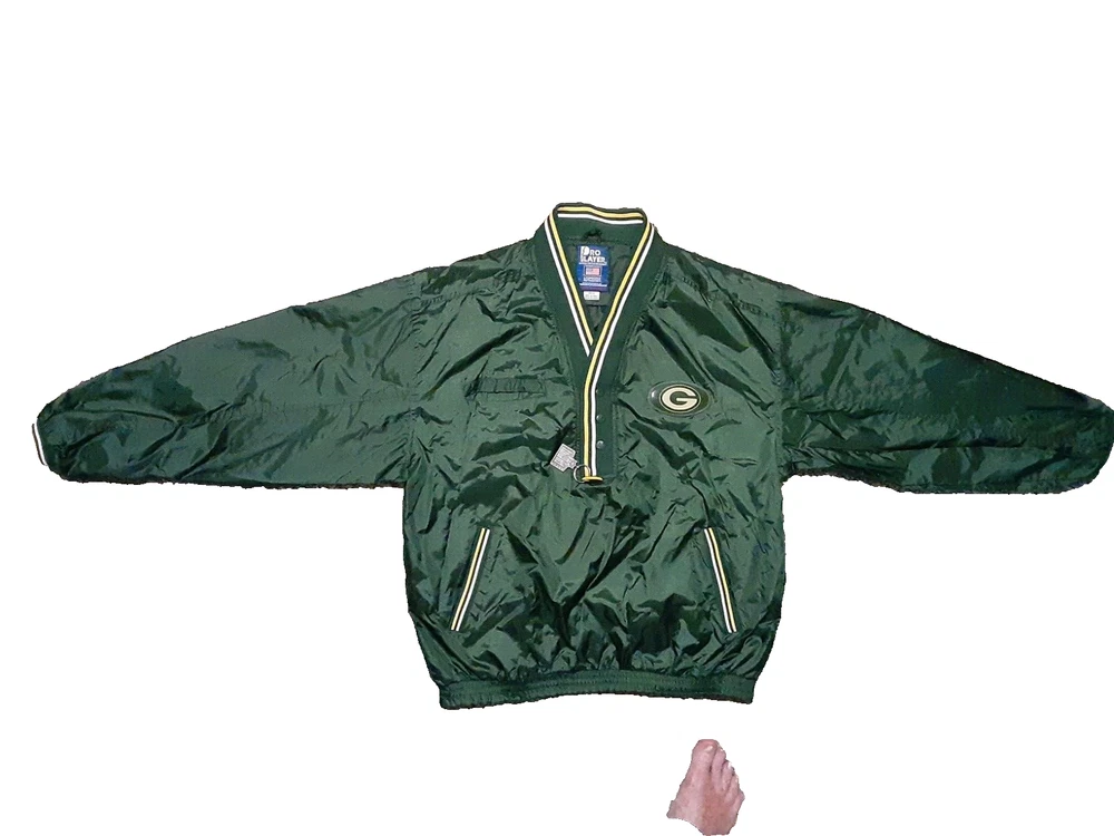 Show off your love for the Green Bay Packers with this officially licensed Pro Player jersey. Featuring a classic V-neckline and long sleeves, this windbreaker style jersey is perfect for any football fan. The snap closure and nylon fabric make it easy to wear and comfortable for all-day wear. This size L jersey is designed for men and has a regular fit. The green and yellow color combination is perfect for any Packers game day outfit. Made in Korea, this jersey is a must-have for any NFL fan's collection.