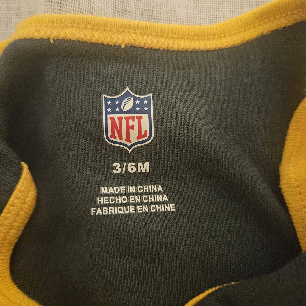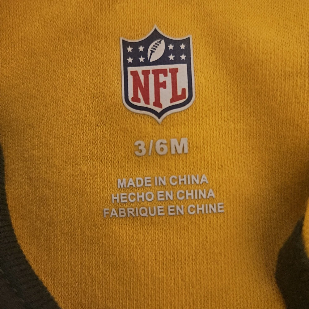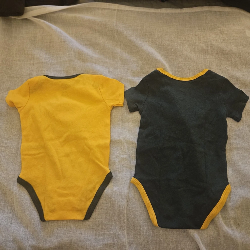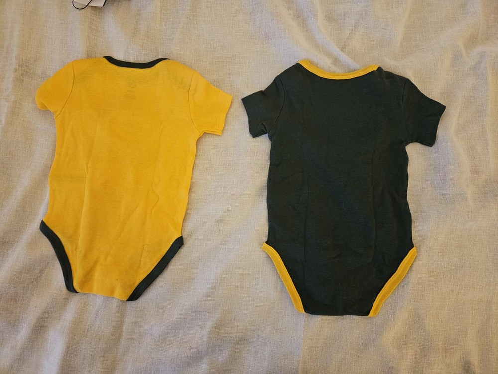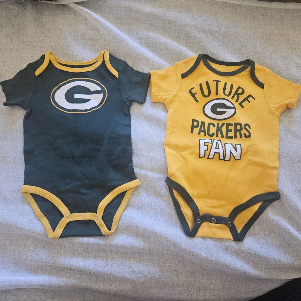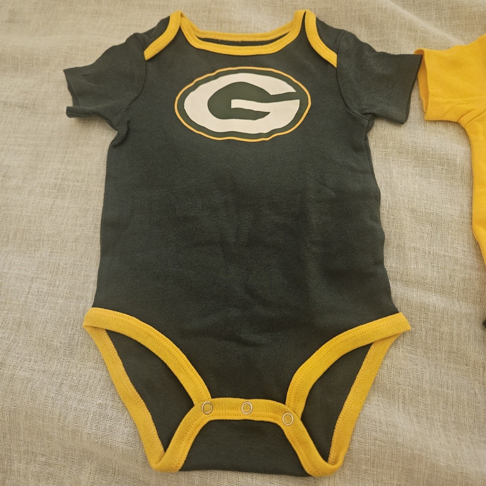 The Green Bay Packers NFL One Piece is a stylish and comfortable outfit for baby boys or girls aged 3 to 6 months. Made from 100% cotton, this short-sleeve features a snap closure and comes in a solid green color with the iconic Green Bay Packers logo. Perfect for casual or activewear occasions, this one-piece set includes 2 different designs in green and yellow, making it a versatile addition to any little fan's wardrobe. The cute and trendy design, along with the high-quality material, make this onesie a perfect choice for any young football enthusiast.