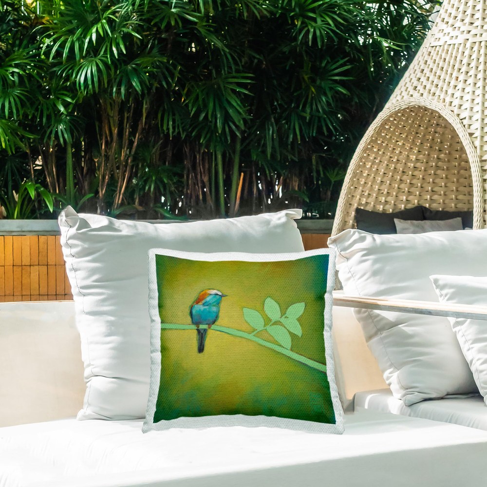 Update your outdoor living space with ’ Decorative Outdoor Printed Pillow in a wide variety of colors, styles, and trends. The printing process makes the ink part of the fabric for greater outdoor durability. Quick-dry pillows arrive with inserts already zipped inside their case. Ideal for outdoor couches, chairs, loungers and benches. Pillow cases printed in the USA. Dimensions: 18 x 18 Inches, Including Filling Insert Decorative outdoor pillows are a great and easy way to decorate your outdoor living space, adding both a decorative accent and comfort. Pillows arrive with insert already zipped inside and ready to fluff. Casing and filling insert are both made of quick-dry soft polyester material. The printing process makes the ink part of the fabric for greater outdoor durability. To wash remove filling insert from casing using invisible zipper. Clean pillow case separately, machine wash on delicate with cold water and mild detergent. For best quality hang dry. Pillow insert is spot clean only. Artwork Relates To: Animal, Bird, Finch, Canary, Beak, Modern, Abstract Design by Stacy Daguiar