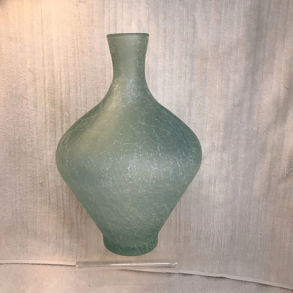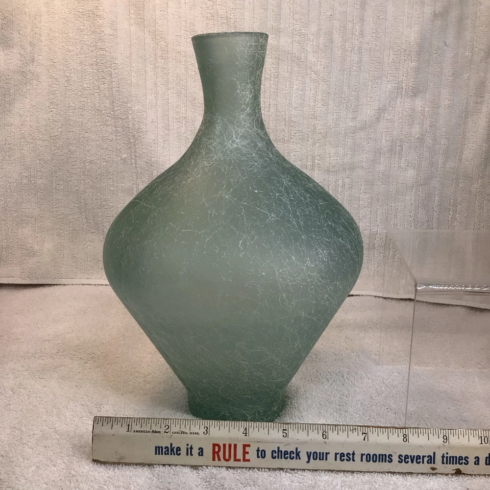 This is an unmarked Mid-Century Modern (MCM) vase made of green crackle glass. The crackle glass production style gives it a unique and eye-catching textured appearance. Perfect for adding a touch of retro charm to any decor, this vase would certainly stand out as a decorative piece in a home or office setting. Unknown age or origin. In great condition, no chips or cracks. Please look at the pictures closely, as this is the item that you will receive.
