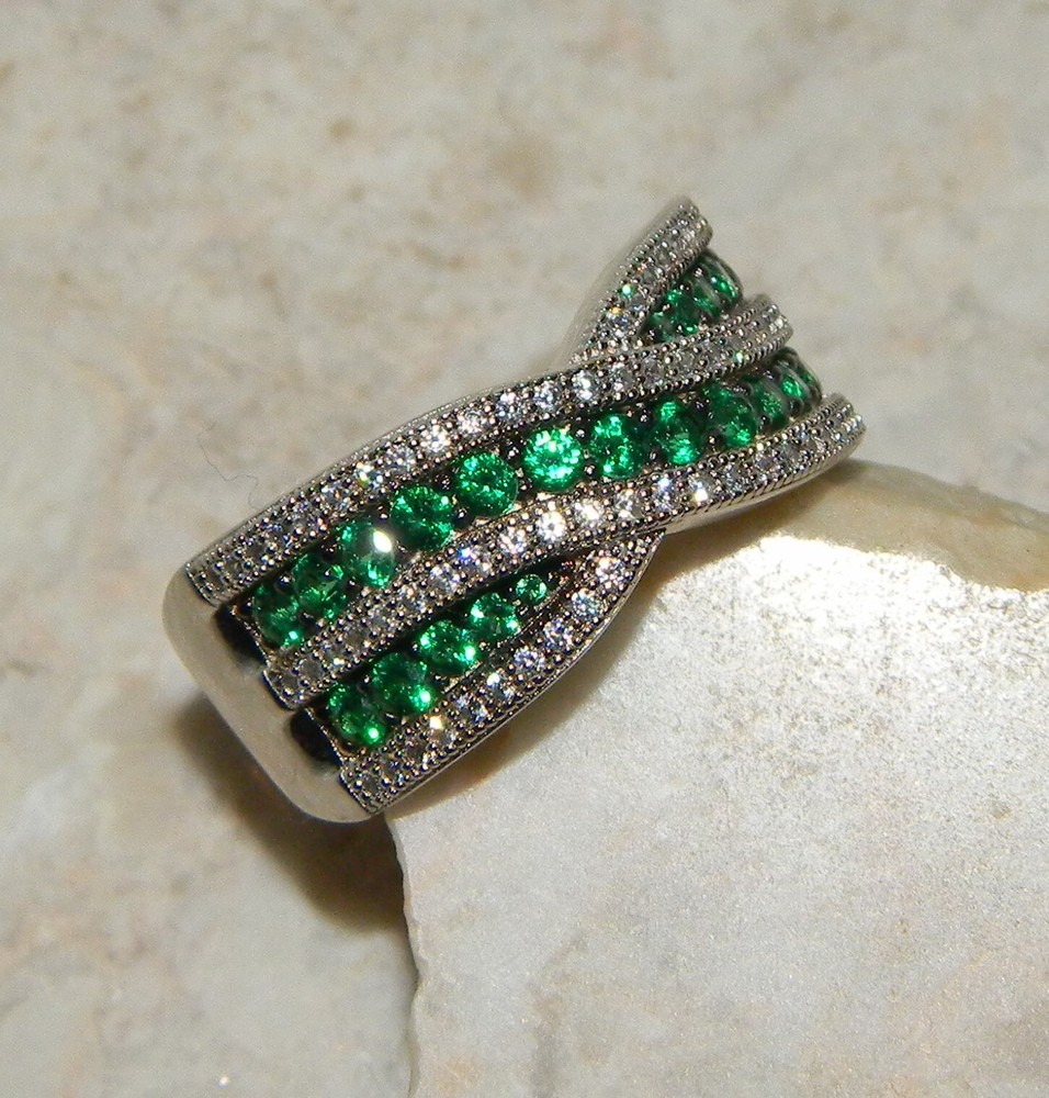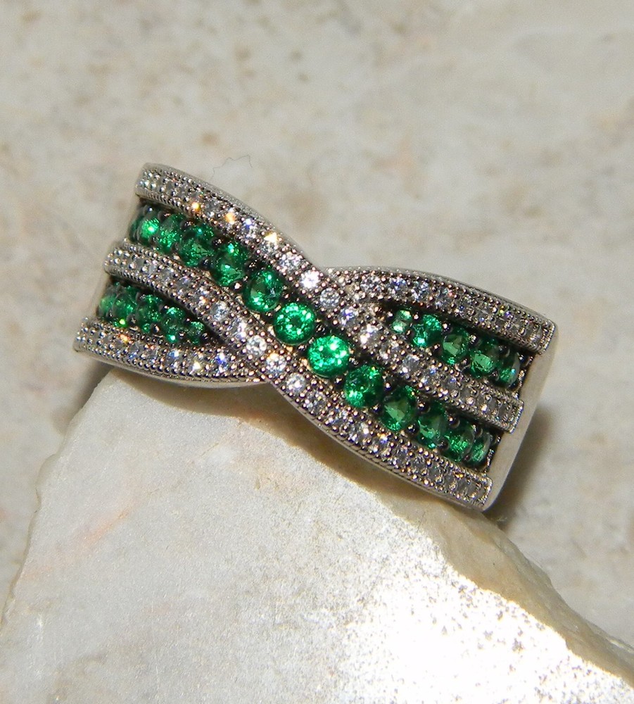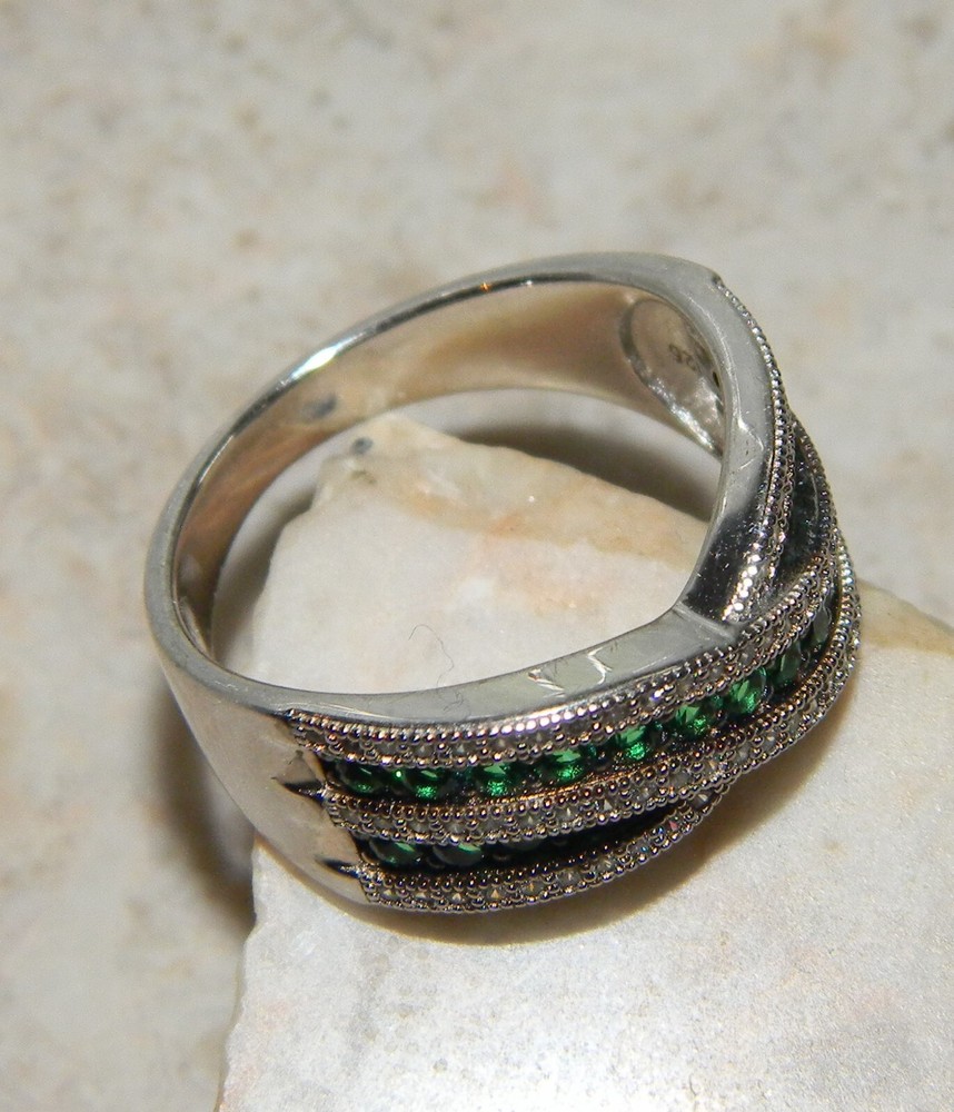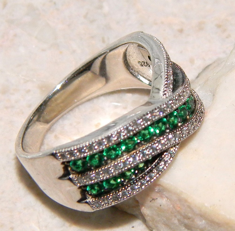 Item Type: Ring Weight: 5g Size: 8 Material ; Silver Main stone: chrome diopside quartz, white topaz Other stones: ---- Dimension: 2/8 by 7/8 inch Stamp / Mark: Condition: New Main color: green