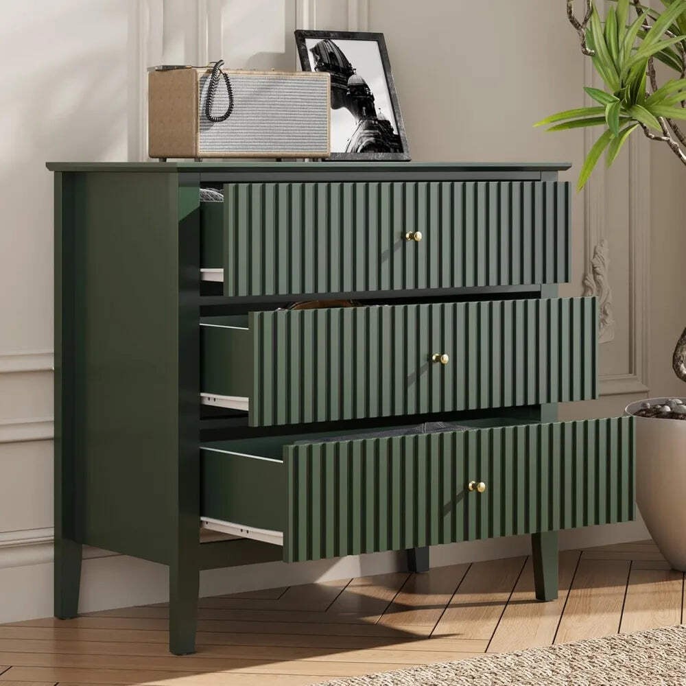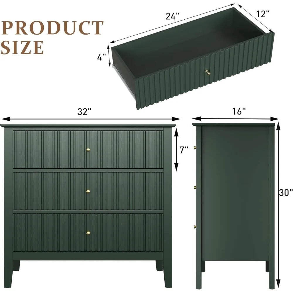 Green Fluted 3 Drawer Dresser Modern Wood Chest for Bedroom Living Room
