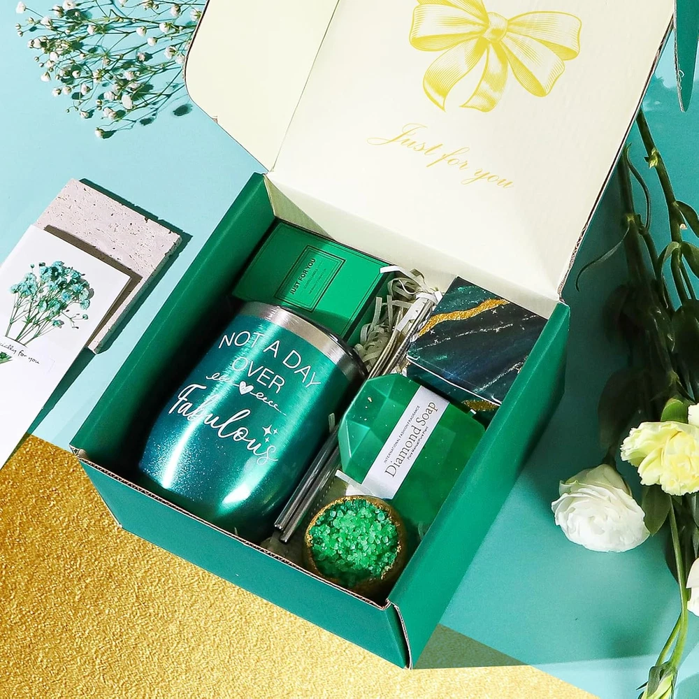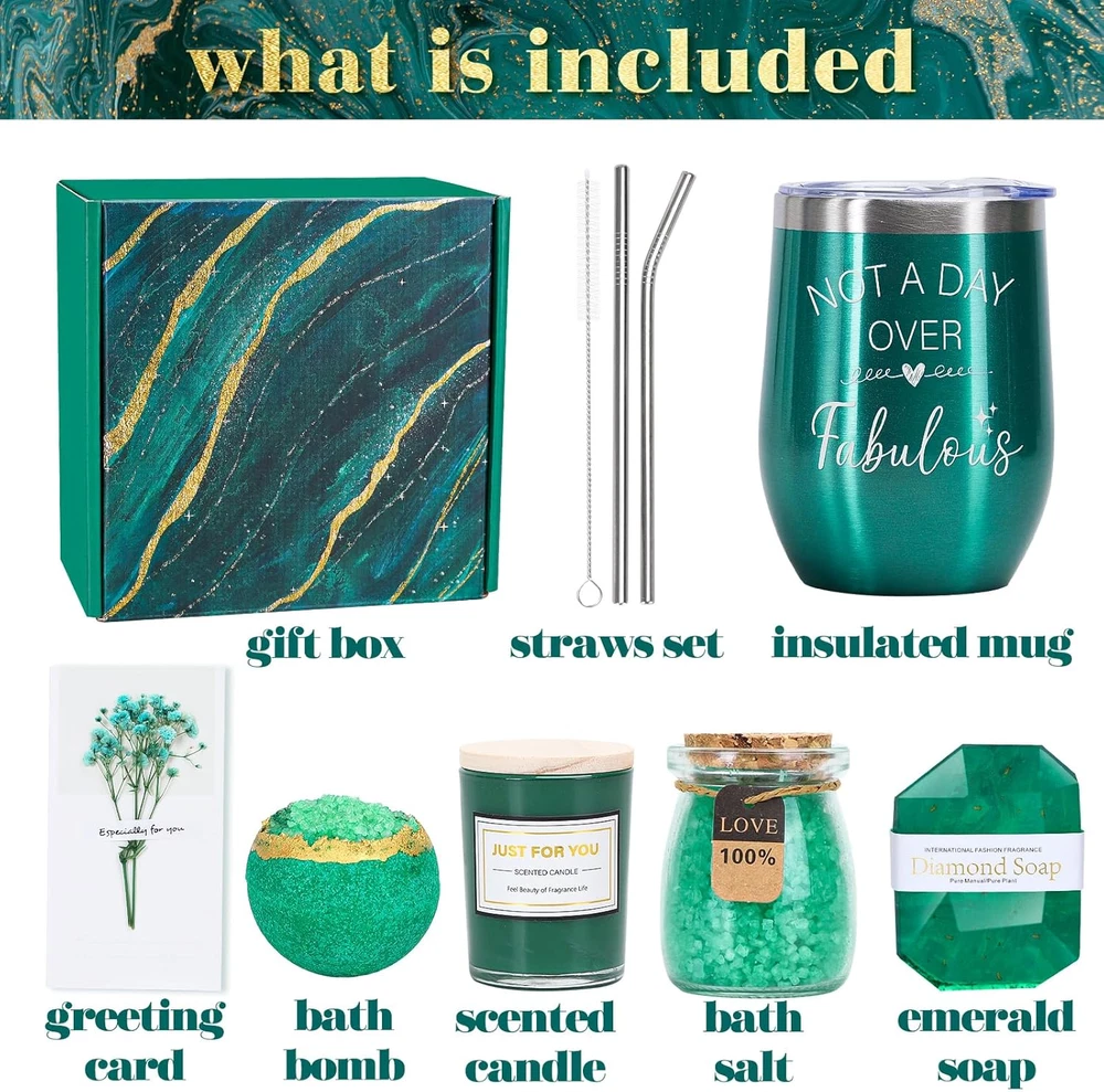 Store New Arrivals Add to Favorite View Feedback Contact Green Gifts for Women, Emerald Green Gift Basket for Mom from Daughter Son, Luxury Relaxing Spa Self Care Gifts, 30Th 40Th 50Th 60Th Unique Birthday Christmas Valentines Day Description Item model number WCG01 Unit Count 1.0 Count Capacity 12 ounces Color Green Material Stainless Steel Country of Origin China Item Weight 2.38 pounds Finish Type Smooth Package Dimensions 7.64 x 7.56 x 4.41 inches Timeless Elegance: Emeralds are often associated with love, rebirth, and fertility, making them a meaningful and symbolic gift for a woman. The vibrant green color of this gift basket represents growth and harmony, making it a beautiful representation of a mother's nurturing and supportive nature. Gifting the woman with this gift basket demonstrates thoughtfulness and a desire to give her something truly special and extraordinary. Relaxation and Pampering: The green spa gift basket offers a luxurious and indulgent experience, allowing her to unwind and enjoy some well-deserved relaxation. There are a variety of spa treats: from the exquisite bath bomb and body salt to scented candle and luxurious gem soap, to a gorgeous stainless steel wine mug, this spa gift basket includes a range of high-quality products that will make the woman feel truly pampered. Stress Relief Gift Box: The soothing and calming nature of spa products can help alleviate stress and promote a sense of tranquility, making it a thoughtful and beneficial gift for any mom. The spa gift basket encourages self-care and wellness, reminding your mom to take time for herself and prioritize her own well-being. Bring this Emerald Gift Basket for her with your thoughtfulness and gratitude. Personalized Gifting Experience: Elevate your gift-giving with a luxury emerald gold care package designed to stand out from the traditional pink-themed gift boxes, perfect for women who seek nobleness. This unique and elegant gift is sure to bring a smile to her face on her birthday or other festivals. The wine tumbler featuring the quote "NOT A DAY OVER FABULOUS" adds a personal touch for her. You can also write your heartfelt message on the greeting card with dry flowers. Elegant Gifts for Women for Any Occasion - WECURATED luxurious emerald gift basket suitable for any women, a meticulously selected assortment of tranquility and beauty, ideal for any occasion such as birthdays, Mother's Day, Valentine's Day, Christmas, and Anniversaries. This thoughtfully curated collection of green vibe goodies symbolizes vitality and care, promising unforgettable unboxing moments for the special women in your life. Product Description Perfect Pampering Gift For Women Or That Special Lady - At Home Spa Kit Make her feel like a pampered queen. The refreshing scent will invigorate her senses and make her feel like she’s getting the full spa treatment right at home. Soothing aromas are perfect for rest & relaxation. It’s exactly what she needs & it’s perfect for any occasion. The Blend of Tranquility and Beauty Infused with a refreshing ocean fragrance to relax the mind while nourishing, repairing and promoting smooth skin. A great spa gift basket makes for a great time for a relaxing break! Hand Packed with Love - Ready-to-Gift Box WHAT'S INSIDE THIS CARE PACKAGE? 12oz Insulated Mug (Not a Day over Fablous) Stainless Steel Straws Set Scented Candle (White Jasmine & Mint) Bath Salt (The Taste of Ocean) Bath Bomb (The Taste of Ocean) Emerald Soap Floral Greeting Card (Especially for you) Exquisite Gift box (7''x7''x4'') CLEAN Step up the beauty routine with this deluxe spa basket. It includes everything you need to spoil yourself from head to toe. Looking and feeling great is effortless when you have everything you need to fortify your skin with moisture. Take a relaxing bath using our salts. Envelop yourself in the sensual scents of ocean. WORTHY The 8-in-1 Gift Basket is a luxury and worthy set. Pamper her with a 12oz insulated stainless steel tumbler, white jasmine mint scented candle, handmade soap, a luxurious ocean bath bomb and bath salt - all aimed at providing a relaxing spa experience. ATTAINABLE As a gift expert, we believe that everyone is entitled to their best gift. That's why we've worked hard to keep our prices low and our efficacy high. Additionally, each of our formulas is crafted to cater to all types and ages. VERSATILE GIFT IDEAS FOR HER - Comes in a beautiful and elegant glitter gift box, no need to repackage. Simply send it as a thoughtful and special gift basket. - Suitable for all occasions including birthday gifts, self care gifts, care package for women, thinking of you gifts, thank you gifts, relaxing spa gift baskets. - Perfect as a gift for your mom, daughter, best friend BFF, coworker, sister, girlfriend, wife, mother, aunt, grandmother or any woman, whether it’s a Birthday, Anniversay, Mother’s Day, Thanksgiving, Christmas, or just to express your love during the holidays or send hugs during difficult times. ABOUT US We offer the best prices around on high quality products. Our E-store includes media such as books, movies, music and games while offering electronics, toys, sporting apparel, clothing, tools, general home, garden items and more. SHIPPING We are always working hard to ensure your package arrives as soon as possible. Please understand that some factors like weather, high postal traffic, and the performance of shipping companies are outside of our control. We offer free shipping to the lower 48 states and ship within 1 business day of payment, usually sooner. P.O. Boxes are accepted, so please feel free to provide either a physical address or a P.O. Box. We do not offer shipping outside of the continental USA. We only ship to states within the continental United States. RETURNS We offer a 30-Day Return Policy on items which you are not completely satisfied with. You have the option for a full-refund or an exchange of the item. No returns are available on items 