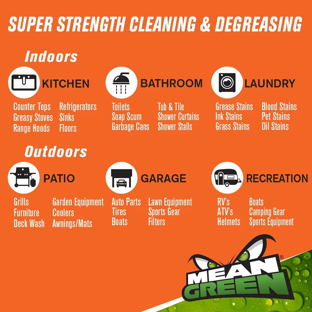 Mean Green Industrial General Purpose Cleaner Spray- 3385680, Gallon: Is a powerful formula designed to eliminate dirt, grease, grim oils and other various residues on water safe surfaces. for a wide range of cleaning apply applications. This product is also NSF register for use as a general cleaner in food processing facilities. Non-Toxic, contains no acid, bleach or ammonia. On Jan 14, 2025 at 19:58:55 PST, seller added the following information: