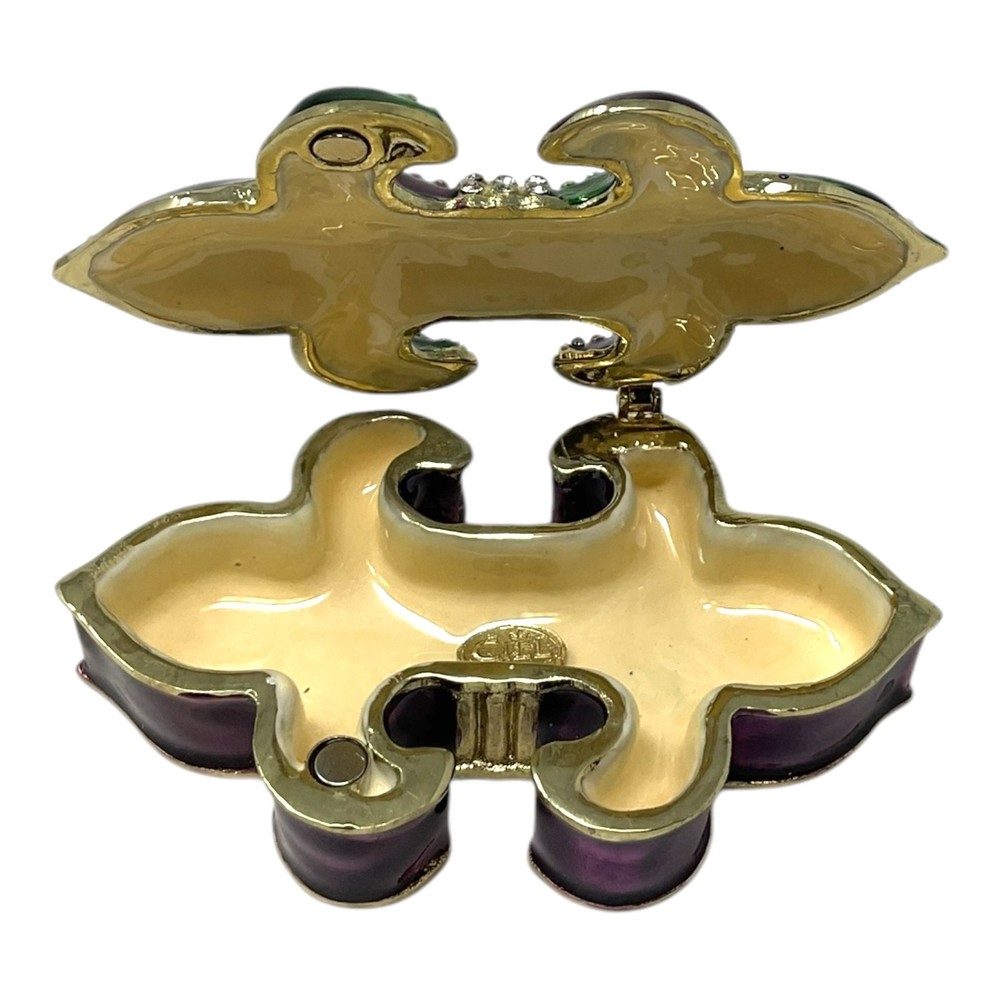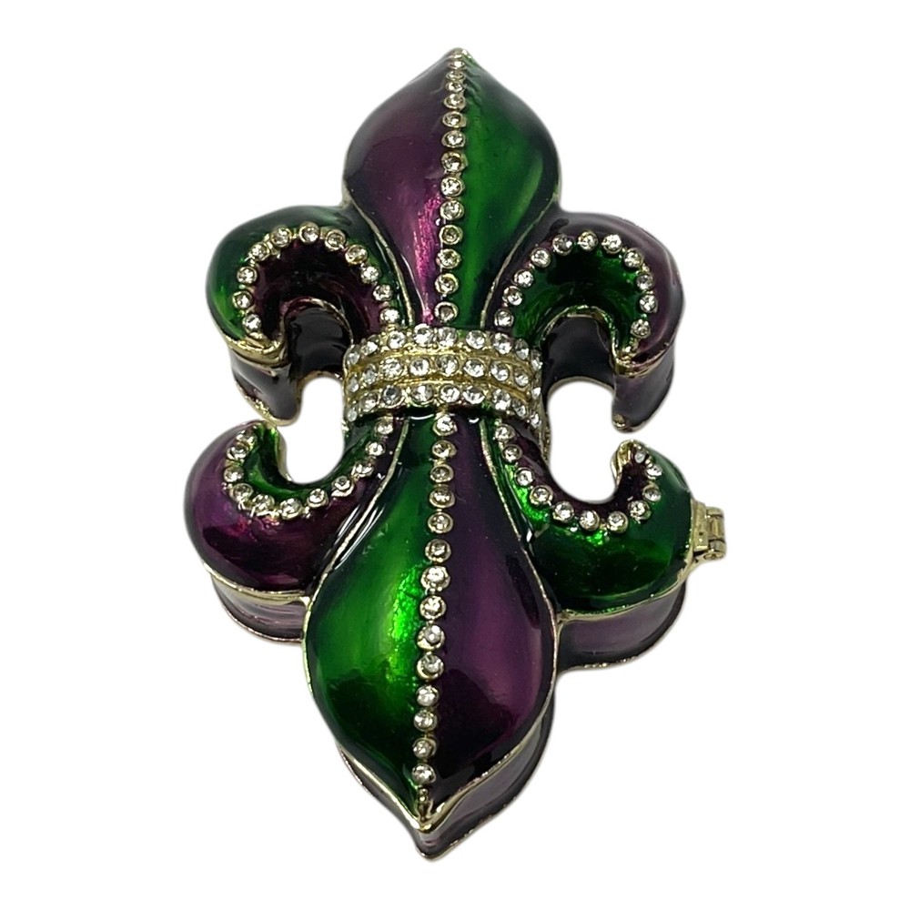 Green Purple French Fleur De Lis Jeweled Crystal Jewelry Trinket Box PRODUCT DESCRIPTION Green and Purple Fleur De Lis Trinket Box Decorated with crystals Made from a glossy enamel Approximately 1 inch tall and 3.5 inches long (3 x 9 cm) Includes original manufactures box and packaging © Copyright . All rights reserved.