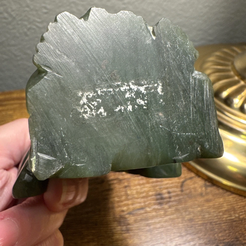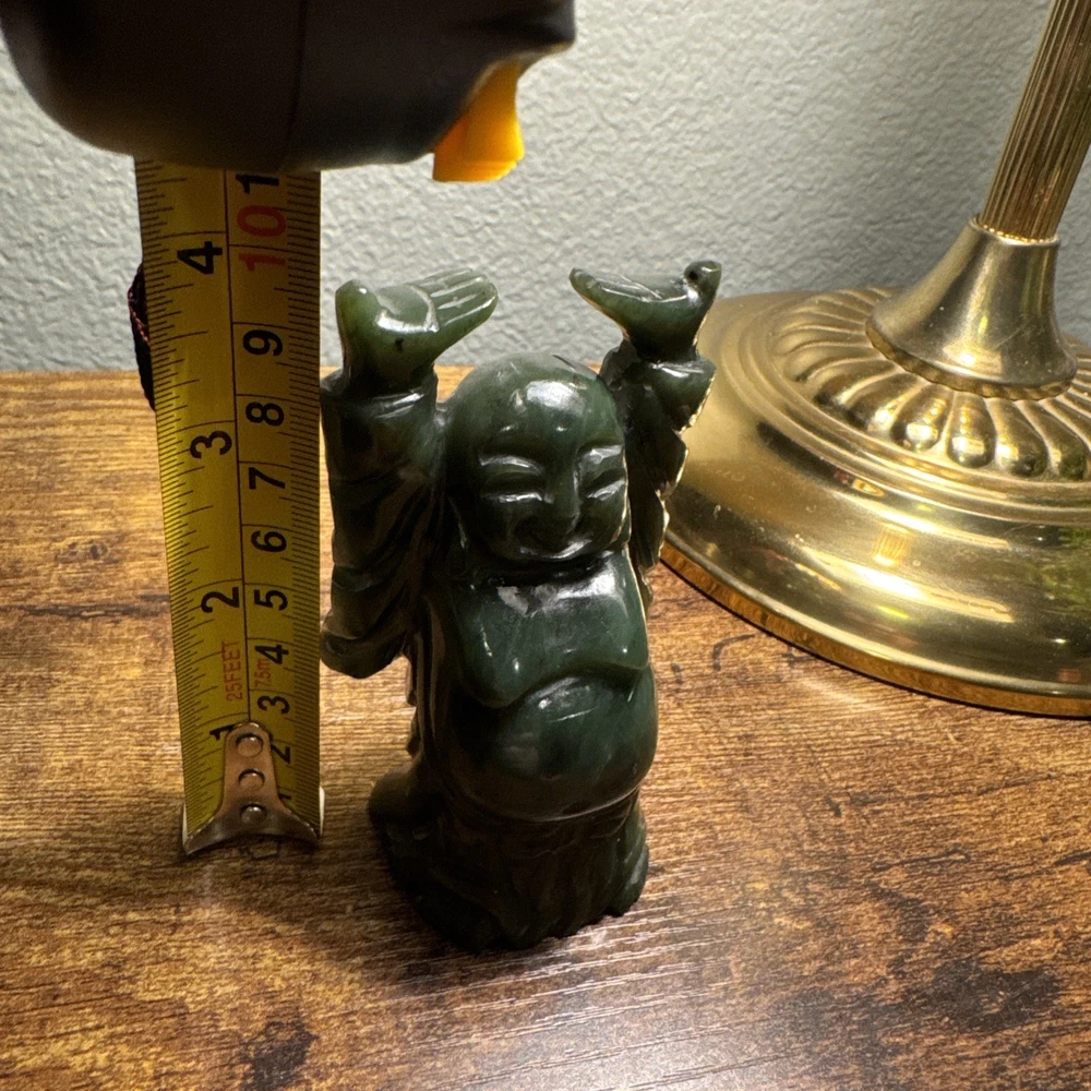 Just under 4” tall, heavy little statue of laughing Buddha The Green Stone is a highly valued gemstone in Chinese culture, symbolizing purity, wisdom, compassion, courage, and modesty. The green color itself represents growth, harmony, balance, and renewal. A green Laughing Buddha is believed to foster family harmony and personal growth.