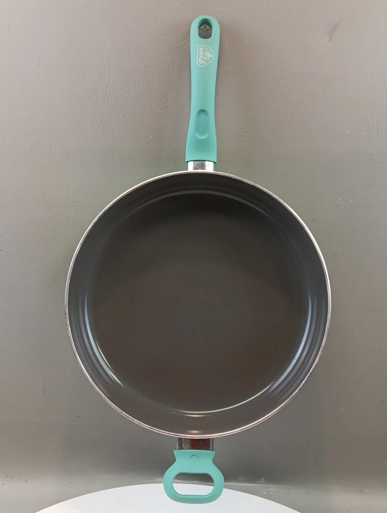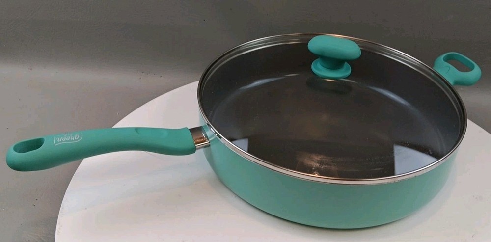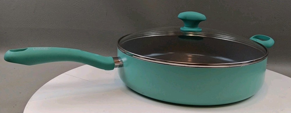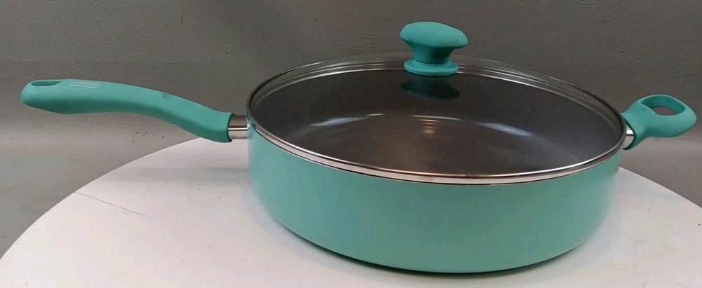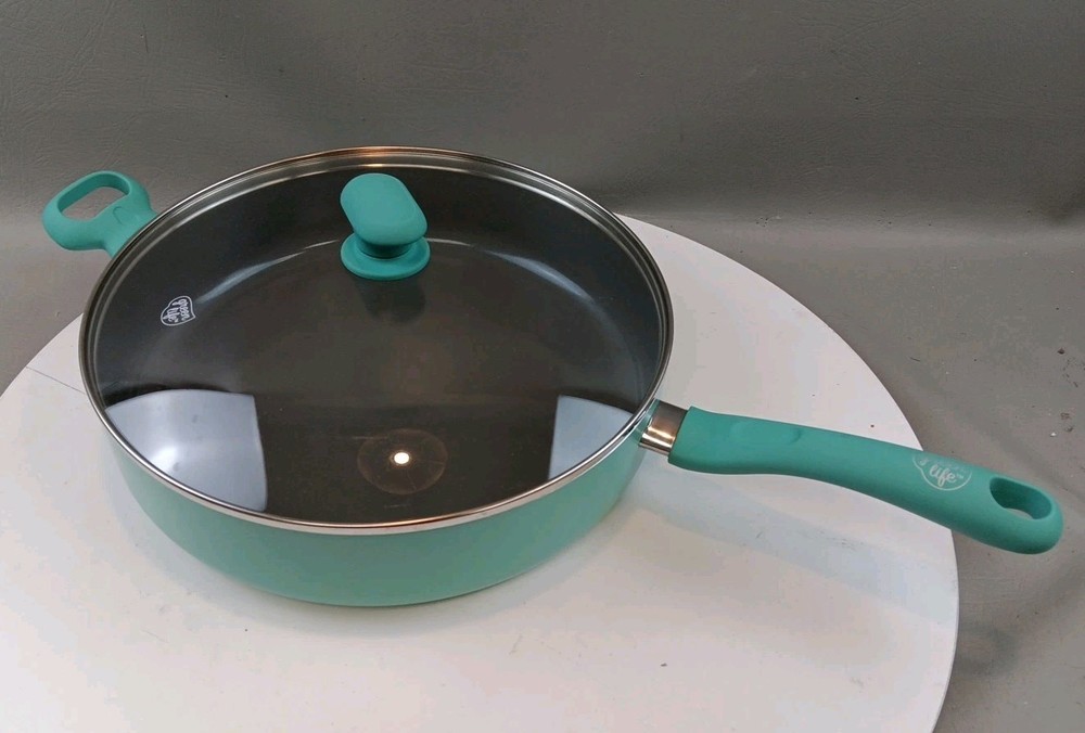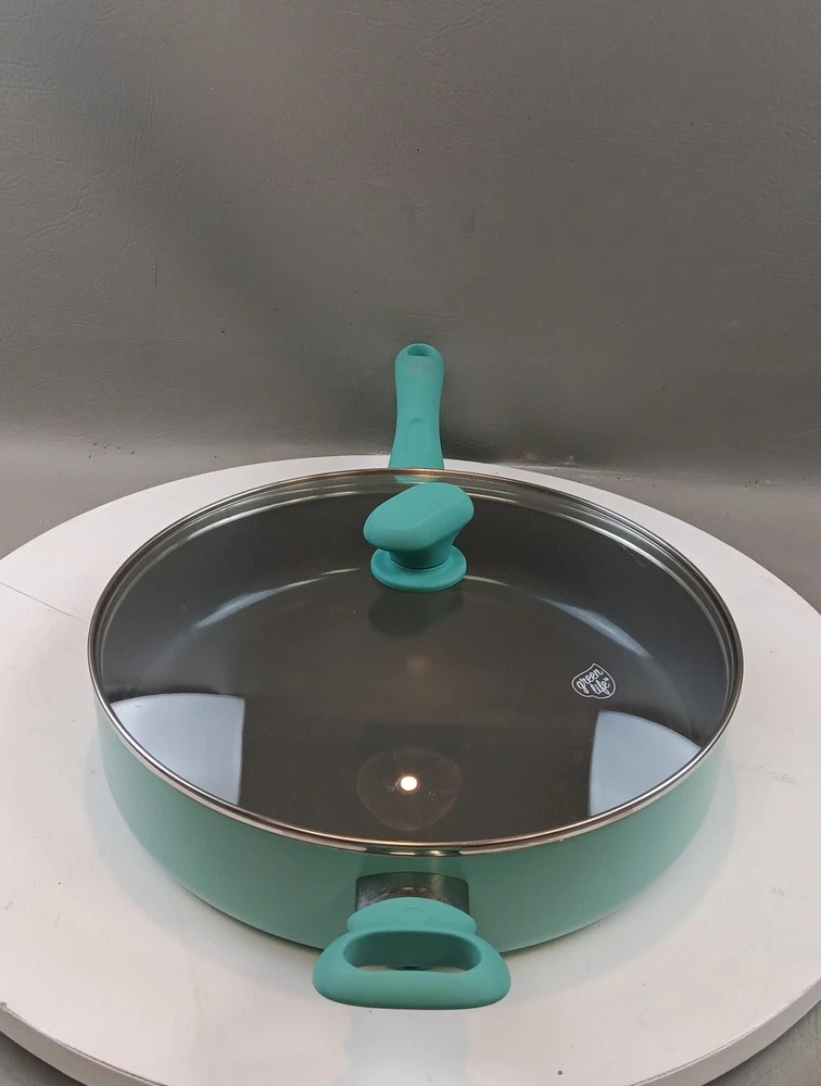 The GreenLife Skillet Fry Pan is a two-piece set that includes a 12" skillet with a soft grip handle and lid. Made with ceramic, PFAS-free nonstick material, and bakelite handles, this frying pan is designed for healthy cooking. Its flattened-cylindrical shape and turquoise color add a stylish touch to any kitchen. With a weight of 5.15 pounds, this GreenLife skillet is durable and perfect for everyday use.