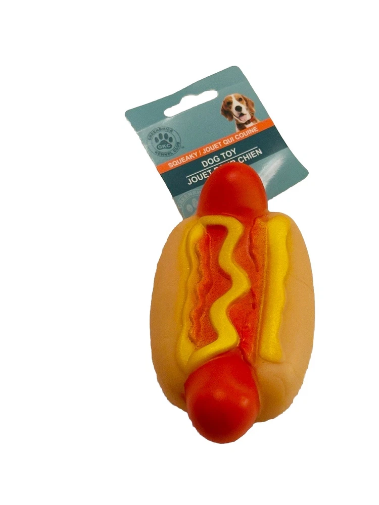 This Greenbrier Kennel Club (GKC) Hot Dog Shaped Squeaky Dog Toy is the perfect addition to your furry friend's toy collection. Made of durable vinyl material and manufactured in China, this chew toy is designed to keep your dog entertained for hours. With its unique hot dog shape and squeaky feature, this toy is sure to make your dog go wild. Perfect for dogs of all sizes and ages, this Greenbrier Kennel Club toy is a must-have for any pet owner looking to provide their furry friend with endless fun.