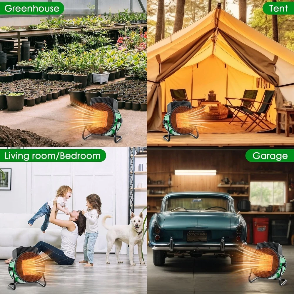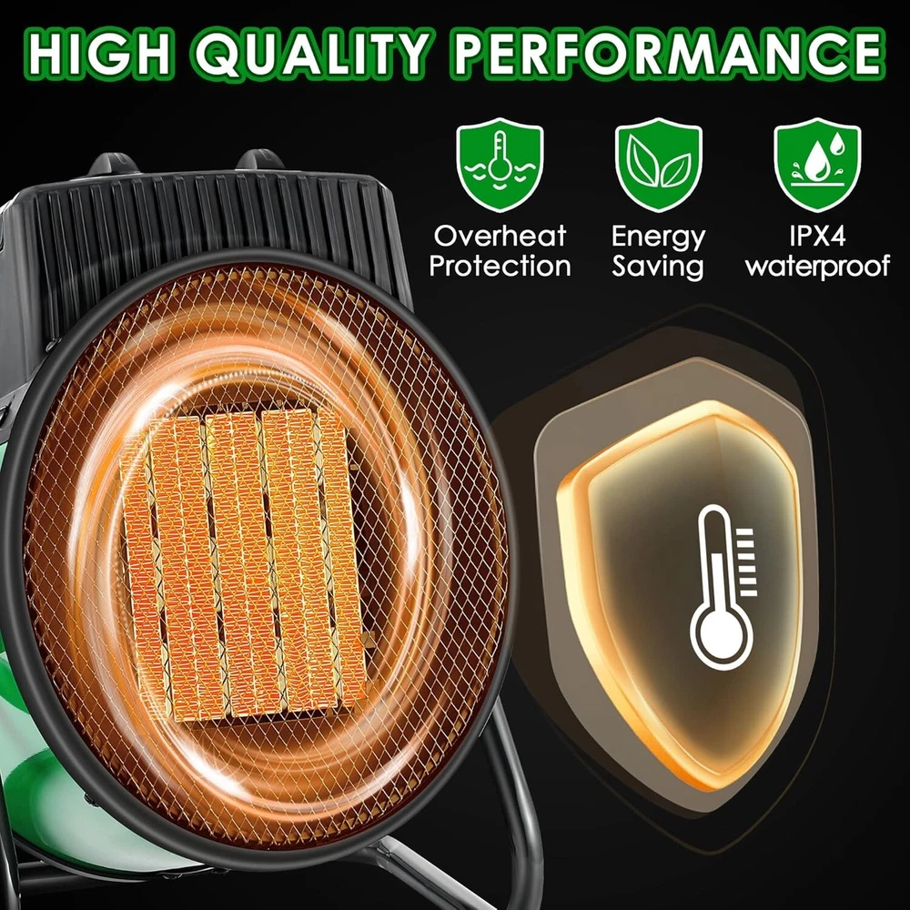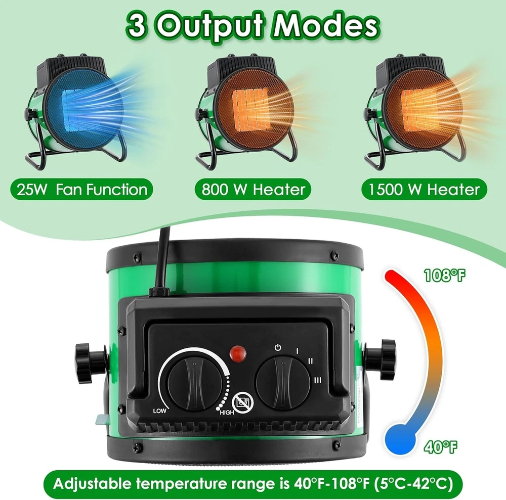 Greenhouse Heating Kit: package include 1 x 110V greenhouse heater fan(1500W heating, 800W heating, 25W cooling); 1 x 1800W digital heat thermostat, temperature range of 40°F-108°F (5°C-42°C); 1 x additional thermohygrometer (temperature range: 10°C-50°C, humidity range: 10-99 percent); 1 x user manual 3 Output Modes for Accurate Climate Control: this greenhouse heater has 3 output modes: 25W Fan / 800W Heat / 1500W Heat, adjustable temperature range is 40°F-108°F (5°C-42°C), suitable for 120 sq. ft. Spaces; You can adjust the temperature according to plant growing conditions or other different needs Smart Thermostat Overheat Protection: the waterproof temperature probe can sense changes in surrounding room temperature, and the temperature controller accurately controls the temperature range you set; Greenhouse heater will stop when the set temperature is reached and start heating when it is 2 degrees fahrenheit below the set temperature Quality and Safety: the greenhouse heater is made of quality flame retardant materials, utilizes PTC ceramic heating, IPX4 waterproof rating; Rapid cooling: safeguard against accidental burns or shutdown, enhanced durability and safety User Friendly Design, Convenient Operation: the electric greenhouse heater is equipped with a high power copper motor for efficiency and low energy consumption, smooth and quiet performance; Additional temperature and humidity monitors enable real time indoor climate monitoring; The handle and base are non slip and easy to move, and the air outlet angle can be adjusted freely Note: 1. If applied in an environment with a lot of dust or feathers, it needs to be cleaned regularly. 2. When the product is applied continuously for 48 hours, it can be powered off for about 30 minutes to give the internal heating wire a rest, which can extend the service life