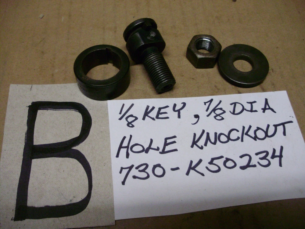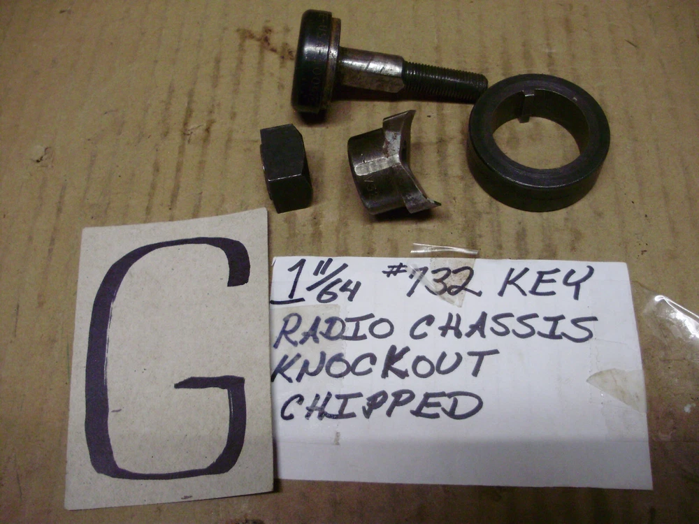 For sale are used Greenlee knockouts. All seem to be in good condition except one which has a chip. You can see it in the picture. --A) 735 Conduit Knockout Set, 1/2, 3/4, 1", --B) 1/8 Key 7/8 Dia Hole Knockout 730-K50234, --C) 3/4 Dia Hole Knockout 5003999, --D) 1-1/4, 1-1/2", Knockout Set, --E) 1-1/4" Knockout, AV127, AV128, No Bolt, --G) 1-11/64, 732 Key Radio Chasis Knockout, **CHIPPED**, --K) 1/2 Conduit Knockout, 5014722, 5004006 If you have any questions just ask.