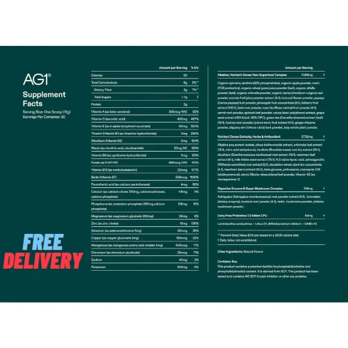 AG1 is a research-backed daily health supplement that combines a multivitamin, probiotic, and superfood blend into a single scoop, providing essential daily nutritional coverage and gut health support. Suitable for a wide range of diets and lifestyles (paleo, keto, vegan, vegetarian, etc.), it is gluten-free, dairy-free, and contains no artificial ingredients, GMOs, or animal byproducts. AG1 supports whole-body health by promoting gut health, digestive regularity, energy, and immune function. It is third-party tested for purity and free from banned substances. With a refreshing pineapple and vanilla taste, 91% of users find it better than expected.
