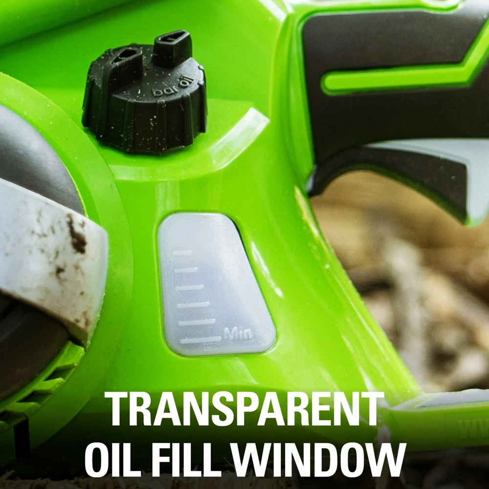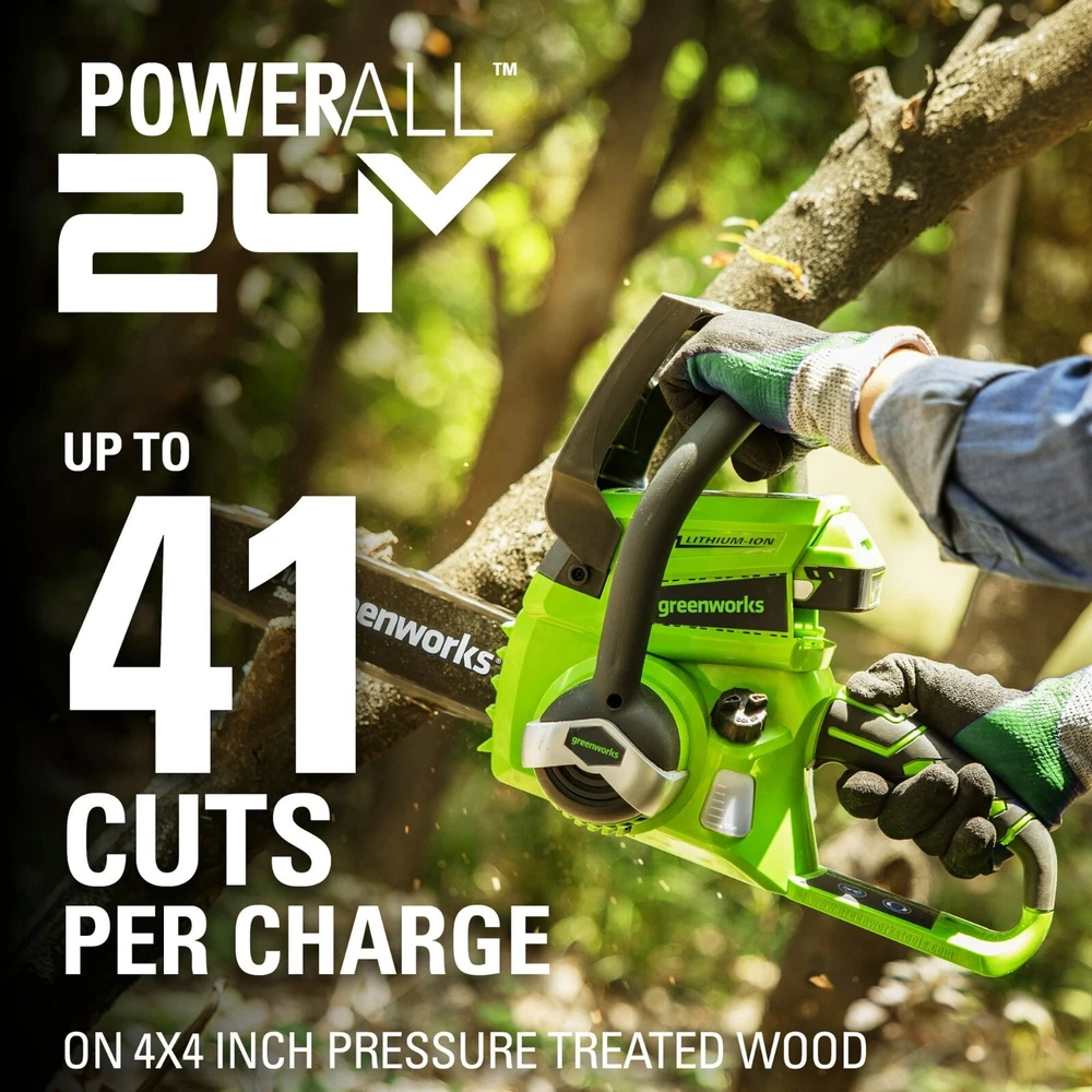 Greenworks 24V 10" Cordless Chainsaw: 24V lithium-Ion battery compatible with both indoor and outdoor tools 10" bar and chain suitable for cutting branches and limbs Tool less chain tensioning for quick adjustments so you can get back to the task at hand 2AH battery included