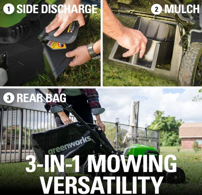 Greenworks 40V 21" Brushless Cordless (Self-Propelled) Lawn Mower (75+ Compatible Tools), 5.0Ah Battery and Charger Included Brand Greenworks Power Source Battery Powered Material Alloy Steel Color Lmf403 Style Mower Item Weight 21.7 Pounds Cutting Width 21 Inches Number of Positions 5, 7 Operation Mode Automatic Product Dimensions 65.35"D x 21.65"W x 33.07"H See more About this item 40V 21” LAWN MOWER - Get more done, faster, with Greenworks electric lawn mowers. This 40V self-propelled lawn mower provides up to 45 minutes of run-time with fully charged 5.0Ah battery (varies based on grass condition and operator technique).Front wheels : 8 Inches BRUSHLESS MOTOR / DURABLE STEEL DECK - This electric mower features a durable 21" deck, and a highly efficient brushless motor that provides more torque, quiet operation, and longer life SINGLE LEVER HEIGHT ADJUST - 7 position height adjustment provides the best cut in all environments. 3-in-1 design offers rear bag, side discharge, and mulching capabilities SELF-PROPELLED - Rear wheel drive power increases traction to tackle the toughest backyard terrain VERTICAL STORAGE - Save 70% more space with vertical storage MAINTENANCE FREE - The walk behind lawn mower is virtually maintenance free, with no gas, no oil, and no emissions. It starts instantly, is quiet, and delivers the power you need