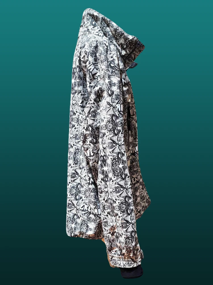 This Grenade Fatigue Project Y2K Full Zip Activewear Jacket is the perfect addition to any action-sports enthusiast's wardrobe. The jacket is made of softshell nylon fabric that is breathable and water/wind resistant, making it ideal for winter, fall, and spring seasons. The jacket features a stand-up collar which can also be turned down, 5 zipped pockets, and a limited edition design with the limited edition Grenade Army Membership product line. The jacket is designed with a full zip closure, snap accents, and underarm ventilation ports, technical cuffs and is available in men's size XL. It is machine washable and comes in mid-length with an all-over black and white pattern. This jacket is perfect for skiing, snowboarding, and skateboarding, and is a must-have for anyone who wants to look stylish while staying comfortable and protected from the wind and water. This jacket is an exclusive line from Grenade Gloves when you join their "Grenade Army" paying a membership. This jacket is similar to the collaboration with the band The Misfits and their jacket featuring black & white Misfit printing. Measurements: Shoulder to hem (front): 32.5" Shoulder to hem (back): 32.25" Shoulder to cuff: 35" Pit to pit: 27"
