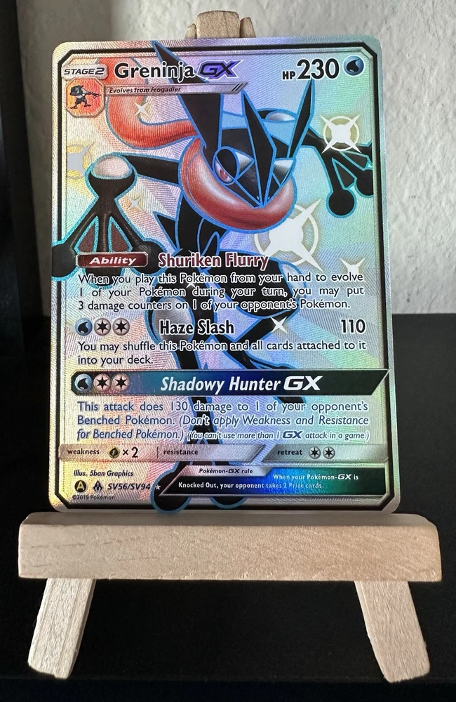 The product is a Greninja GX card from the Hidden Fates: Shiny Vault set of the Pokémon Trading Card Game. Released in 2019, this English-language card has 230 HP and is a Shiny Holo Rare. It is a Stage 2 Pokémon card with card number SV56/SV94, featuring a holographic finish.