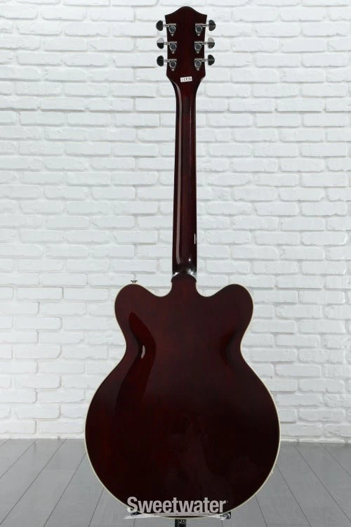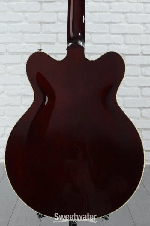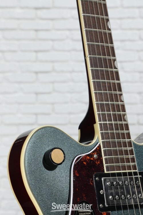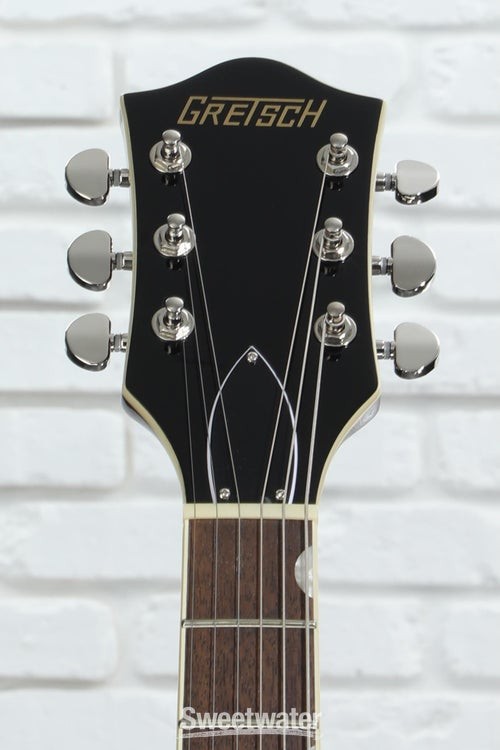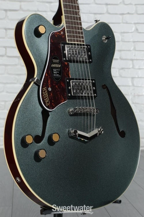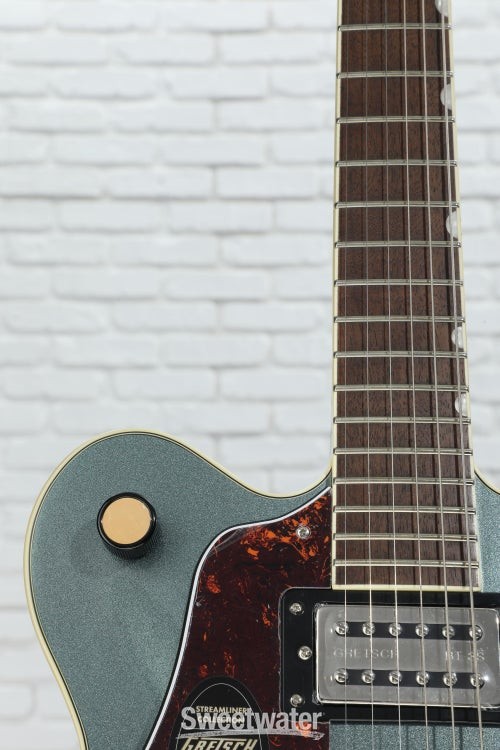 Rock Your World with a Gretsch Streamliner The G2622 Streamliner Center Block Double-Cut is here to make all of your Gretsch dreams come true without the burden of a pro price tag. This impeccably designed guitar packs in classic Gretsch appointments, a warm and resonant 16-inch-wide semi-hollow body, and a V-Stoptail that culminate in an endlessly playable instrument. Its body flaunts a laminated maple top, back, and sides for warm and bright natural tone. In addition, the nato neck and laurel fingerboard with soft C neck shape and 12-inch radius set you up for exceptional playing comfort every time you pick this 6-string up to play. Rounded out with a pair of bold and well-balanced Broad’Tron BT-3S humbucking pickups that can be coil-split by pulling the volume control, the versatile G2622 Streamliner is ready to record, jam, and take to every stage with confidence!5-ply maple body offers excellent definition Maple Sweetwater is an Authorized Gretsch Dealer Genuine Open Box Item Sweetwater's 2-year warranty and 55 point inspection Gretsch G2622LH Streamliner Center Block Double-Cut Left-handed Electric Guitar Left-handed Semi-hollowbody Electric Guitar with Laminated Maple Top, Back, and Sides, Nato Neck, Laurel Fingerboard, and 2 Humbucking Pickups - Gunmetal Rock Your World with a Gretsch Streamliner The G2622 Streamliner Center Block Double-Cut is here to make all of your Gretsch dreams come true without the burden of a pro price tag. This impeccably designed guitar packs in classic Gretsch appointments, a warm and resonant 16-inch-wide semi-hollow body, and a V-Stoptail that culminate in an endlessly playable instrument. Its body flaunts a laminated maple top, back, and sides for warm and bright natural tone. In addition, the nato neck and laurel fingerboard with soft C neck shape and 12-inch radius set you up for exceptional playing comfort every time you pick this 6-string up to play. Rounded out with a pair of bold and well-balanced Broad’Tron BT-3S humbucking pickups that can be coil-split by pulling the volume control, the versatile G2622 Streamliner is ready to record, jam, and take to every stage with confidence! 5-ply maple body offers excellent definition Maple is one of the most lively, bright, and colorful tonewoods out there, which is exactly why Gretsch decided to make their G2622 Streamliner Center Block Double-Cut almost entirely out of this wonderful wood. This semi-hollowbody’s 5-ply arched laminated body offers a full 16-inch width and yields a wonderfully snappy, open tone that, when combined with the balanced character of its Broad’Tron BT-3S pickups, cuts through a dense mix and sounds great in any situation. Feedback-free hollowbody tone You get a lot of tonal bang for your buck with the G2622 Streamliner, thanks to its long center block. Running the full length of the body, the center block allows the otherwise hollow body to resist resonant-frequency feedback. At Sweetwater, we’ve found that this weight-relieved center block lets us rock out louder, with more gain, without our amplifier squealing out of control. Exceptional sonic flexibility Pick up the G2622 Streamliner, and you'll quickly realize you can pull off some tonal tricks you may have figured weren’t within this 6-string's grasp. With a volume control for each pickup, you can create the perfect balance between warmth, bite, and brilliance when both pickups are engaged. The master tone control lets you fine-tune your sound once you’ve got the pickups dialed in. Use the master volume control to take your tube amp from clean to growling without changing the balance between your pickups. Or, simply pull up to enable single-coil tone tapping for even greater sonic range! Gretsch G2622LH Streamliner Center Block Double-Cut Features: Semi-hollowbody electric guitar with classic Gretsch styling 5-ply, 16-in.-wide maple body delivers an incredibly snappy, open tone Broad’Tron BT-3S humbuckers balance out your tone beautifully Weight-relieved center block yields feedback-free hollowbody tone Highly playable soft C-shaped nato neck with laurel fingerboard 3 volume controls and 1 tone control create exceptional sonic flexibility 3-way toggle switch to select pickup configuration Push-pull coil-splitting at the master volume control allows you to tap into single-coil tones Specification Detail Number of Strings 6 Left-/Right-handed Left-handed Body Type Semi-hollowbody Body Shape G2622 Streamliner Body Material Laminated Maple Top Material Laminated Maple Color Gunmetal Body Finish Gloss Neck Material Nato Neck Shape Soft C Neck Joint Set Neck Radius 12" Fingerboard Material Laurel Fingerboard Inlay Pearloid Neo-Classic Thumbnail Number of Frets 22 Scale Length 24.75" Nut Width 1.6875" Nut Material Bone Bridge/Tailpiece Anchored Adjusto-Matic Bridge with Gretsch V-Stoptail Tuners Die-cast, Closed Gear Neck Pickup Broad'Tron BT-3S Humbucker Bridge Pickup Broad'Tron BT-3S Humbucker Controls 2 x volume, 1 x master volume, 1 x master tone Switching 3-way toggle pickup switch Strings NPS, .010-.046 Case/Gig Bag Sold Separately RETURN INFORMATION We want you to be completely happy with your purchase from Sweetwater. If you are not satisfied with your product, you may return it for a refund of the purchase price within 30 days. If your purchase was eligible for Free Shipping, the shipping cost will be deducted from your credit or refund. Returns must be in the complete and original packaging with all accessories and complete documentation (Owner's Manual, warranty card, quick start guides, etc.), show no signs of wear or use, and include a Return Authorization number or be subject to a restocking fee.