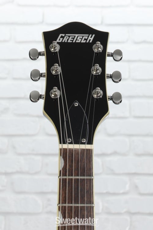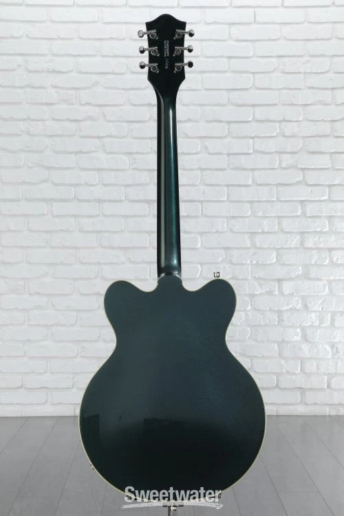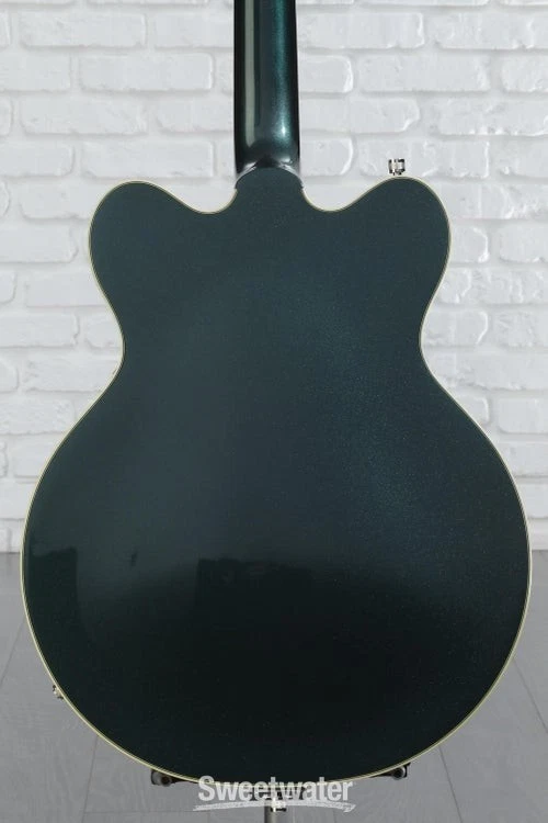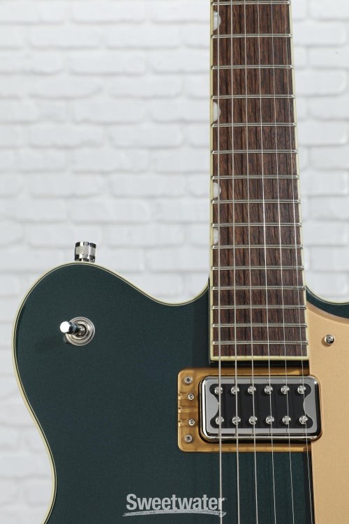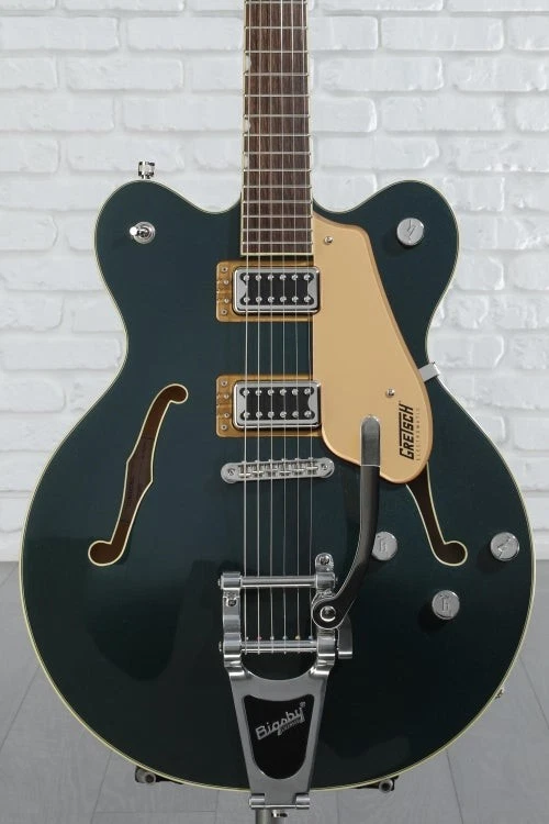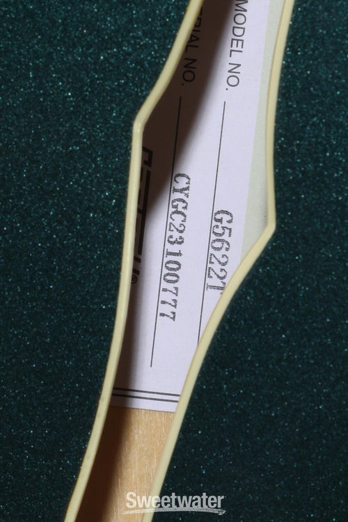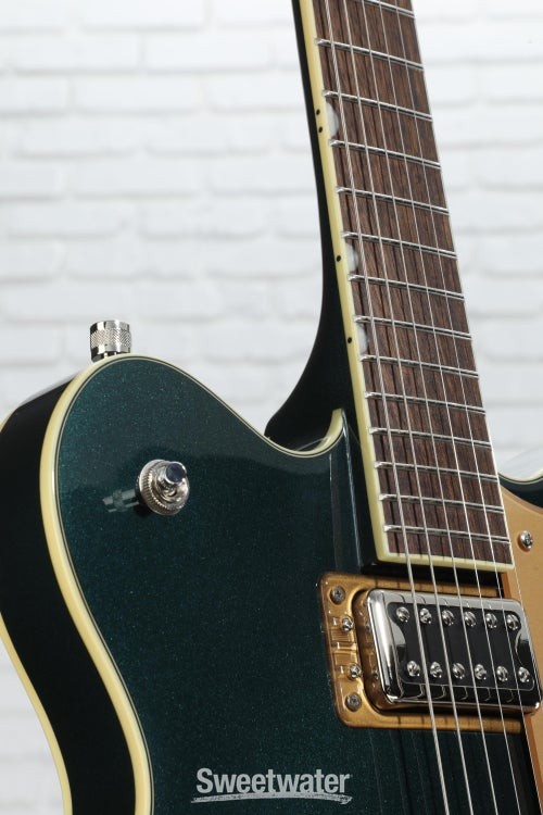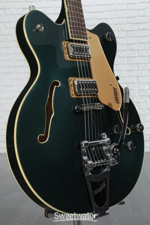 Classic Gretsch Tone and Attitude The Gretsch G5622T Electromatic Center Block semi-hollowbody electric guitar provides you with a wide range of tones fit for any genre. With a laminated maple body, this guitar produces a bright and resonant tone that’s perfect for playing live and in the studio. Thanks to the guitar’s center block, this axe can handle high levels of gain and produces tons of sustain. This axe comes loaded with two high-output Gretsch Broad'Tron pickups that pump out powerful mids, buttery lows, and crystalline highs. If you’re like us at Sweetwater and like thin necks, you’ll love the comfortable “Thin U”-shaped neck on this guitar. The Gretsch G5622T Electromatic Center Block semi-hollowbody lets you capture all of the Gretsch sound without all the feedback.Hot Broad'Tron pickups and classic controls The Gretsch G5622T pumps out more tone than you’d expect, courtesy of two Black top Broad'Tron pickups. These humbucking Sweetwater is an Authorized Gretsch Dealer Genuine Open Box Item Sweetwater's 2-year warranty and 55 point inspection Gretsch G5622T Electromatic Center Block Double-Cut with Bigsby - Cadillac Green Semi-hollowbody Electric Guitar with Laminated Maple Top, Back, and Sides, Maple Neck, Laurel Fingerboard, 2 Humbucking Pickups, and Bigsby B70 Tailpiece - Cadillac Green Classic Gretsch Tone and Attitude The Gretsch G5622T Electromatic Center Block semi-hollowbody electric guitar provides you with a wide range of tones fit for any genre. With a laminated maple body, this guitar produces a bright and resonant tone that’s perfect for playing live and in the studio. Thanks to the guitar’s center block, this axe can handle high levels of gain and produces tons of sustain. This axe comes loaded with two high-output Gretsch Broad'Tron pickups that pump out powerful mids, buttery lows, and crystalline highs. If you’re like us at Sweetwater and like thin necks, you’ll love the comfortable “Thin U”-shaped neck on this guitar. The Gretsch G5622T Electromatic Center Block semi-hollowbody lets you capture all of the Gretsch sound without all the feedback. Hot Broad'Tron pickups and classic controls The Gretsch G5622T pumps out more tone than you’d expect, courtesy of two Black top Broad'Tron pickups. These humbucking pickups were designed to create a hot signal with thick, powerful mids and exceptionally clear highs. These pickups are the perfect combination of raw power and shimmering cleans. You can explore the power of the Broad'Tron pickups via the master tone, master volume, and individual pickup volume controls. Semi-hollowbody construction resists feedback With the Gretsch G5622T, you’ll get tons of sustain without the feedback of hollowbody guitars. Thanks to the full-length center block, this guitar resists resonant frequency feedback. This allows you to dial up the gain without making your amp squeal. As an added bonus, the bridge and tailpiece are screwed directly into the center block in order to increase sustain and note clarity. Superb vibrato tailpiece For those who love mellow vibrato, you’ll adore the Bigsby B70 vibrato tailpiece that’s installed on the Gretsch G5622T. You can use this tremolo system to create smooth dipped chords and accented bends. The character and vintage vibe of the Bigsby doesn’t just sound great, it looks great too. The rugged construction of the vibrato ensures that you’ll be able to create subtle vibratos for years to come. Gretsch G5622T Electromatic Center Block Semi-hollowbody Electric Guitar Features: 2 Broad'Tron pickups pump out hot, powerful tones Laminated maple body construction provides a snappy, bright attack Laurel fingerboard adds warmth to the tone Neo-classic thumbnail inlays add to the classic Gretsch look Bigsby B70 tailpiece lets you perform smooth bends Double cutaway body helps add depth and focus to the sound Specification Detail Number of Strings 6 Left-/Right-handed Right-handed Body Type Semi-hollowbody Body Shape Electromatic Doublecut Body Material Laminated Maple Top Material Laminated Maple Color Cadillac Green Body Finish Gloss Neck Material Maple Neck Shape Thin U Neck Joint Set Neck Radius 12" Fingerboard Material Laurel Number of Frets 22, Medium Jumbo Scale Length 24.6" Nut Width 1.6875" Nut Material GraphTech NuBone Bridge/Tailpiece Adjusto-Matic, Bigsby Tremolo Tuners Die-cast Sealed Neck Pickup Gretsch Black Top Broad'Tron Humbucker Bridge Pickup Gretsch Black Top Broad'Tron Humbucker Controls 2 x volume, 1 x master volume, 1 x tone Strings Nickel Plated Steel, .010-.046 Case/Gig Bag Sold Separately RETURN INFORMATION We want you to be completely happy with your purchase from Sweetwater. If you are not satisfied with your product, you may return it for a refund of the purchase price within 30 days. If your purchase was eligible for Free Shipping, the shipping cost will be deducted from your credit or refund. Returns must be in the complete and original packaging with all accessories and complete documentation (Owner's Manual, warranty card, quick start guides, etc.), show no signs of wear or use, and include a Return Authorization number or be subject to a restocking fee.
