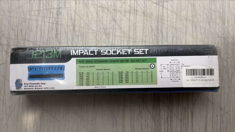 Features and Benefits: Redesigned chamfered drive means easy attachment to power tool Externally necked down design for maximum bolt clearance Individual sockets are covered under GP Lifetime Warranty Comes complete in a blow molded case 13-Piece 3/8 in. Drive Semi Deep 6-Point Metric Impact Socket Set