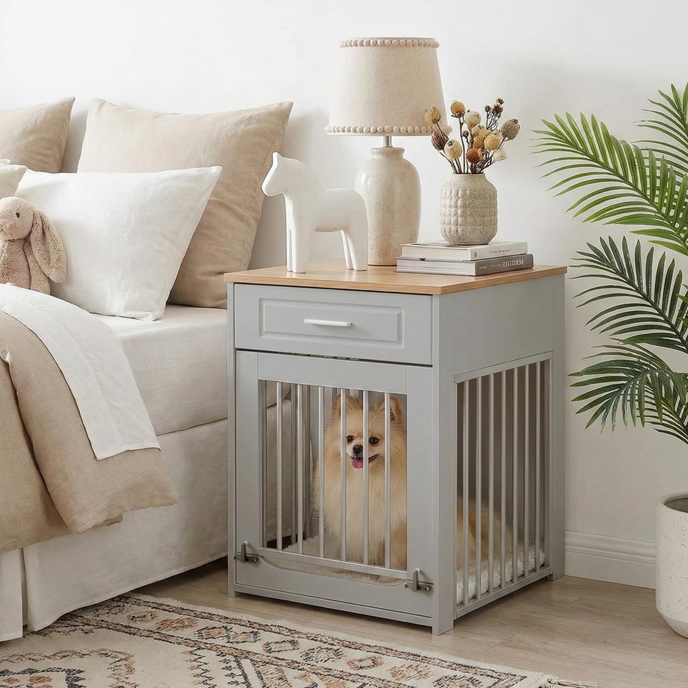 Grey Wooden Dog Crate Furniture Side Table Indoor Kennel Lockable Door Drawer đăStylish Multi-Functional Furniture ăMore than just a crate, this is a versatile home accent. With its elegant design, it effortlessly doubles as a chic side table or a practical bedside cabinet, providing a dedicated space for your pet while seamlessly blending into your home decor. âăSpace-Saving Flip-Up DoorăThe innovative flip-up door tucks neatly away inside the crate with a simple upward push. This clever design saves significant space and allows for effortless cleaning and hassle-free access to your furry friend. đăSpacious Tabletop & Storage DrawerăBoasts a generous tabletop for your lamp, photo frames, or decor. The integrated drawer is ideal for organising all your pet's essentialsâfrom treats and toys to grooming suppliesâkeeping them neatly out of sight but always within reach. đ¶ăComfortable Den for DogsăExpertly crafted to be a safe and comfortable retreat for smaller breeds. The tubular door frame and three-sided ventilation ensure excellent airflow and a clear view, so your dog feels secure and you can easily keep an eye on them. đ©ăRobust & Secure ConstructionăEngineered for durability with robust 10mm metal tubes and strengthened wood panels. The added security of two reliable safety latches ensures it stays securely closed, giving you complete peace of mind for years to come. Tired of bulky, unsightly crates cluttering your home? Meet the modern pet owner's solution: a dog crate so stylish, it blends seamlessly into your living space. Designed with both aesthetics and functionality in mind, this piece doubles as elegant furniture while providing a secure, comfortable sanctuary for your small dog or puppy. Crafted from premium, solid materials, its robust construction ensures long-lasting durability for daily use. The ingenious flip-up door offers effortless accessâsimply lift to open and lower to secure, making it incredibly convenient for you while feeling safe and cozy for your furry friend. A standout feature is the built-in storage drawer at the base. Perfect for tucking away leashes, toys, treats, and grooming supplies, it keeps all your pet essentials organized and within reach, yet completely out of sight. More than just a crate, itâs a versatile pet habitat that combines a secure resting area with smart storage. Give your pet the comfort they deserve and your home the polished look you desire. A perfect harmony of form and function. I offer FREE postage on all UK orders! I post within 2 business days of payment, usually sooner. I use a selection of shipping services such as Royal Mail, Yodel, Evri, UPS etc. Local collection is not provided. Please visit my eBay store to check out other items for sale!