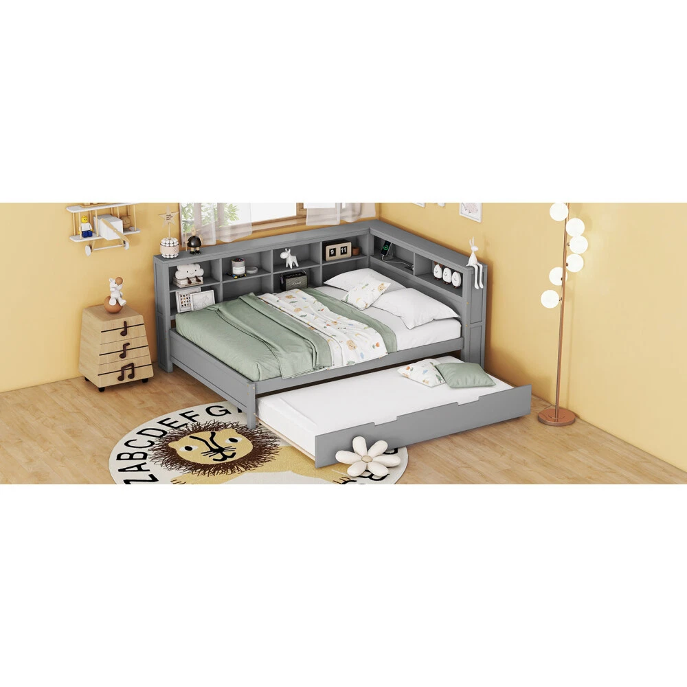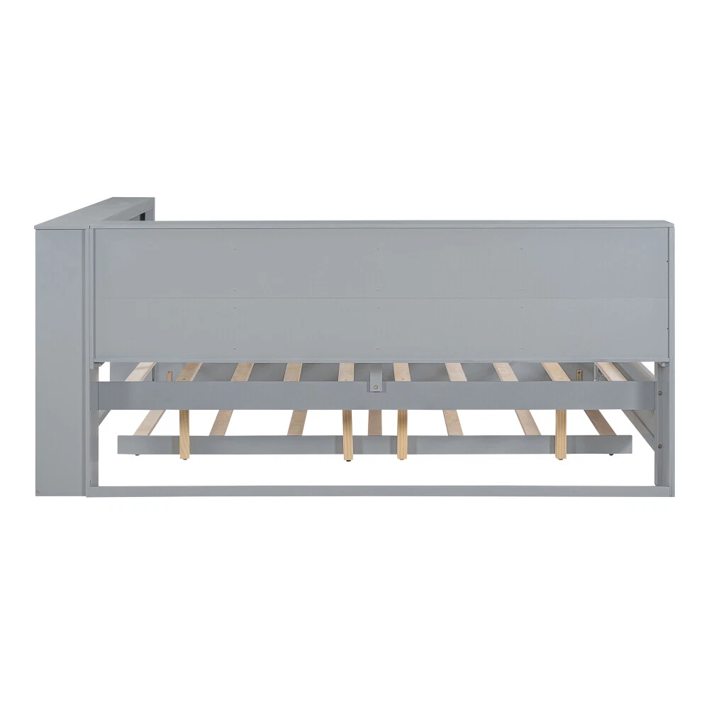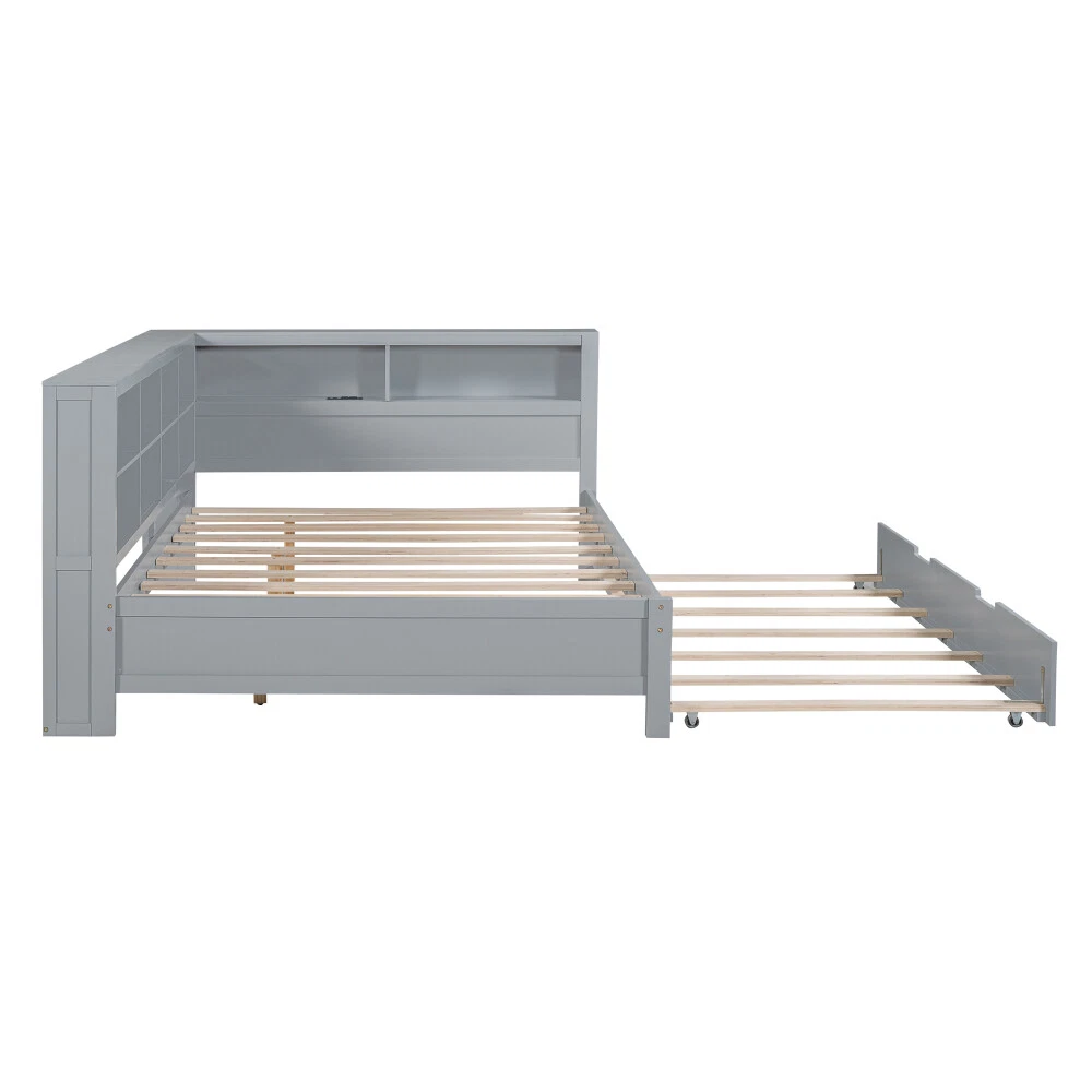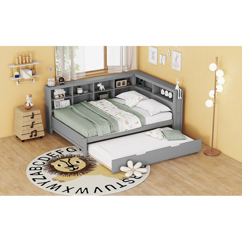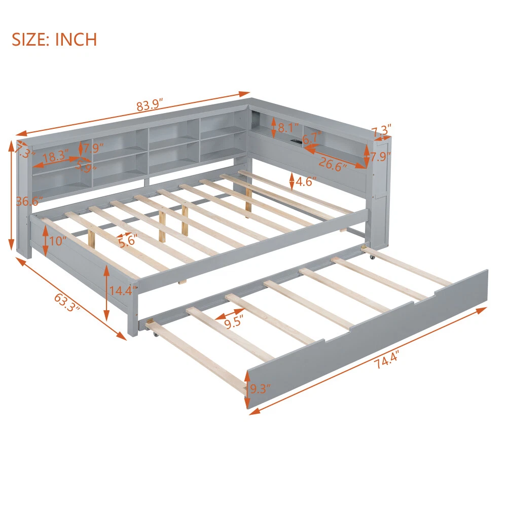 Elegant design: This daybed is designed with pine wood material, available in grey or white color. It is not only suitable for any home decoration, but also designed to last forever. Daybed Frame with Charging Station: This unique full size daybed frame is designed with a USB port charging station to allow you to charge or use electronic devices while you sleep, providing even more convenience and comfort. Space-saving:The daybed includes one trundle, which can be rolled out to provide extra sleeping space. This design is ideal for families with children or users who need to host guests frequently. There is a double-layer storage shelf next to the bed, where users can store bedding, toys and other items. Superior Quality: Made of high-quality MDF, the frame of this bed is not easy to be affected by humidity change and lead to crack. The strong legs, wide boards and 10 slats for bed,not only improve the weight capacity of the bed greatly but also ensure the stability. Product Dimension: Overall Product Dimension: 83.9"L X 63.3"W X 36.6"H. Bed suitable for Full size mattresses. Wooden Full Size DayBed with Trundle, DayBed with Storage Shelf and USB Charging Ports, Grey This daybed is designed with pine wood material, available in grey or white color. It comes with a double-layer shelf for convenient storage and one pull-out bed for extra sleeping space. In addition, it is equipped with a USB charging station for electronic devices. This design is not only practical but also stylish, making it an ideal choice for any modern bedroom. The solid pine wood frame ensures durability and stability, while the sleek and minimalist design adds a touch of elegance to any room.