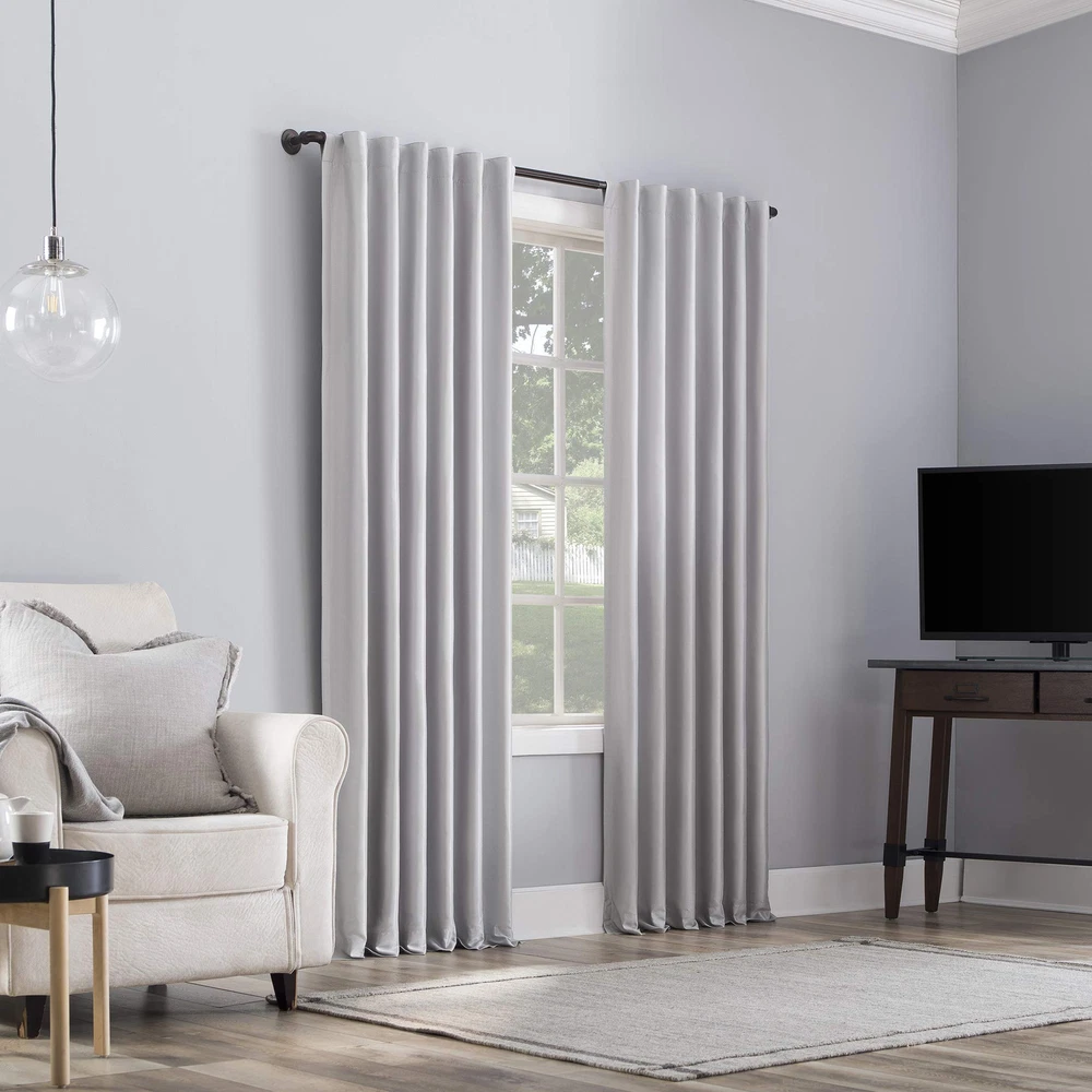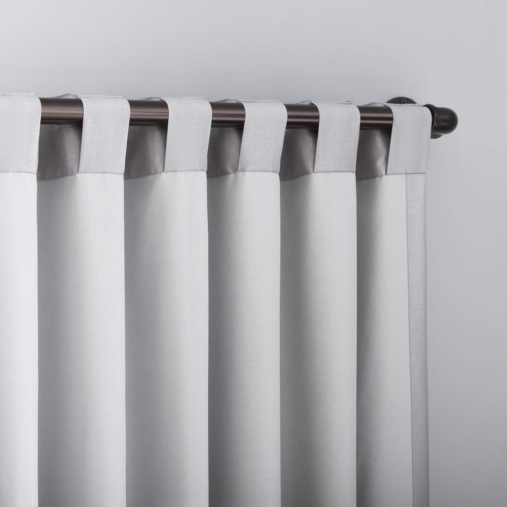 Featuring an elegant dupioni faux silk fabric with a raw slub texture, Greyson Faux Dupioni Silk Extreme 100% Blackout Back Tab Curtains provide the ultimate in light blocking technology to keep out even the harshest of light while adding opulent radiance to any room of your home. Extreme Blackout Thermal Lining is laboratory tested to block out 100% of light, reduce outside noise by up to 30%, and decrease energy lost through your windows by up to 40%. Comfort is optimized with thermal properties that help keep summer heat and winter chill out of your home. Built-in back tabs allow for easy slide-through installation on curtain rods up to 1.5" in diameter. Hang in your entertainment room to eliminate screen glare and reduce distracting outside noise, or in your bedroom for enhanced privacy and a sounder, more uninterrupted sleep. Sold as individual panels measuring 50" width by 84" length in color chrome gray. Measure carefully before selecting your desired size and quantity. Rod not included. Machine wash cold on gentle cycle. Use non-chlorine bleach when needed. Tumble dry on low heat, using a cool iron as needed. Elegant faux dupioni silk fabric with a raw slub texture imparts opulent radiance Extreme Blackout Thermal Lining blocks out 100% of outside light Energy Efficient design reduces energy lost through your windows by up to 40% Thermal properties help keep summer heat and winter chill out of your home Noise reduction by up to 30% helps you get a sounder, more uninterrupted sleep Back tabs fit curtain rods up to 1.5" in diameter