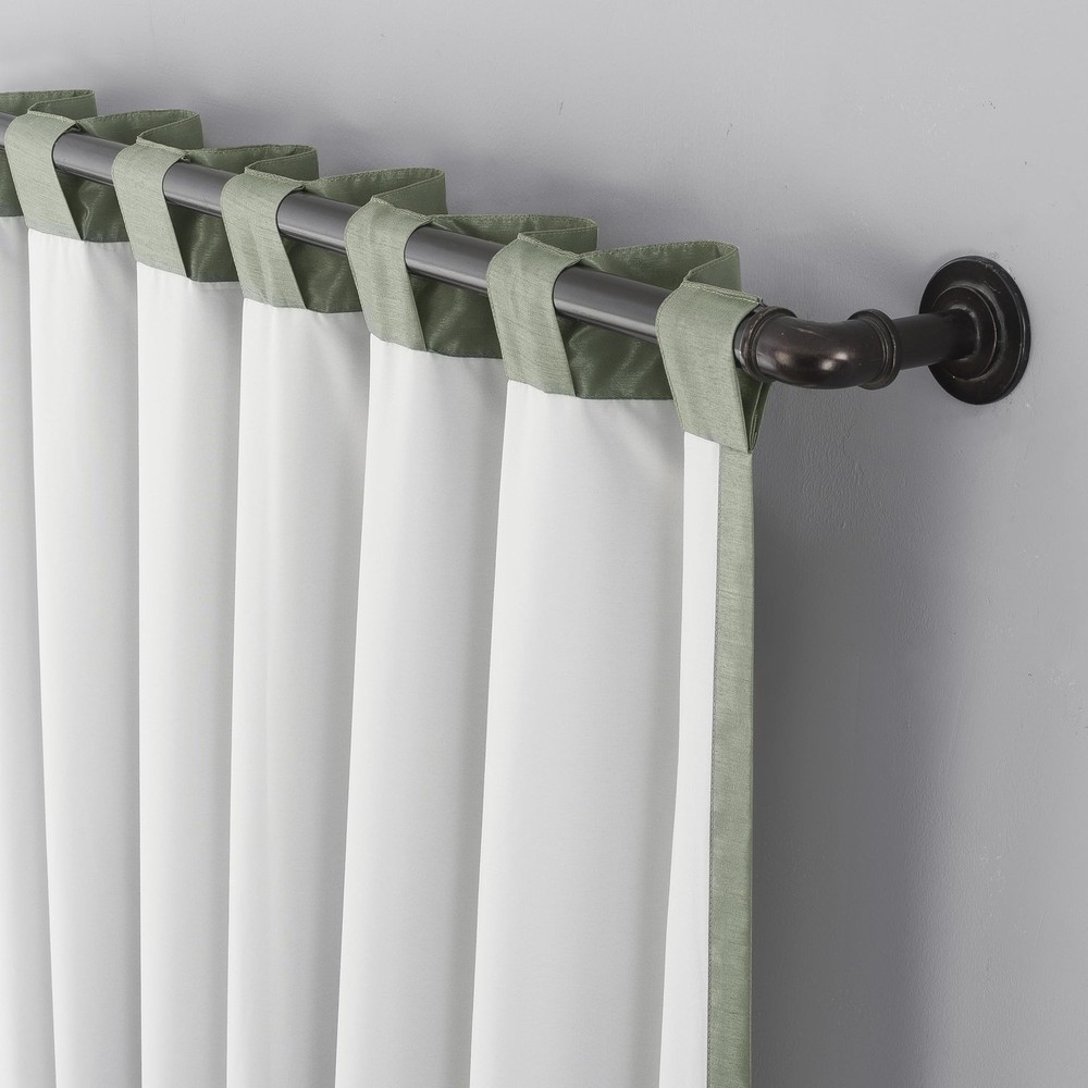 Featuring an elegant dupioni faux silk fabric with a raw slub texture, Greyson Faux Dupioni Silk Valances add a touch of glamour with ornately beaded tassels while providing the ultimate in light blocking technology to keep out even the harshest of light. Extreme Blackout Thermal Lining is laboratory tested to block out 100% of light where window is covered. Back tabs fit curtain rods up to 1.5" in diameter for easy slide-through installation. Hang with the matching Greyson Curtain on a double rod, or use as a standalone valance. Sold as individual valances measuring 50" width by 17" length in color moss green. Coordinating curtain panels are sold separately. Measure carefully before selecting your desired size and quantity. Rod not included. Machine wash cold on gentle cycle. Use non-chlorine bleach when needed. Tumble dry on low heat, using a cool iron as needed. Elegant faux dupioni silk valance with a raw slub texture imparts opulent radiance Tassels with ornate beaded detail add a touch of glamour Blocks out 100% of outside light where window is covered Coordinate with the matching curtains (sold separately) on a double rod, or use as a standalone valance Back tabs fit curtain rods up to 1.5" in diameter Valances sold individually (image features 2)