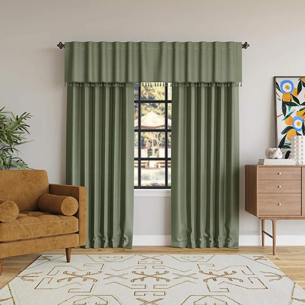 This valance is absolutely stunning! The faux silk fabric looks so luxurious, and the beaded tassels add the perfect elegant touch. It blocks out all light, just as promised, and the thermal lining keeps my room cozy. Installation was a breeze with the back tabs, and it pairs beautifully with matching curtains. Such a high-end look for a great price—love it!