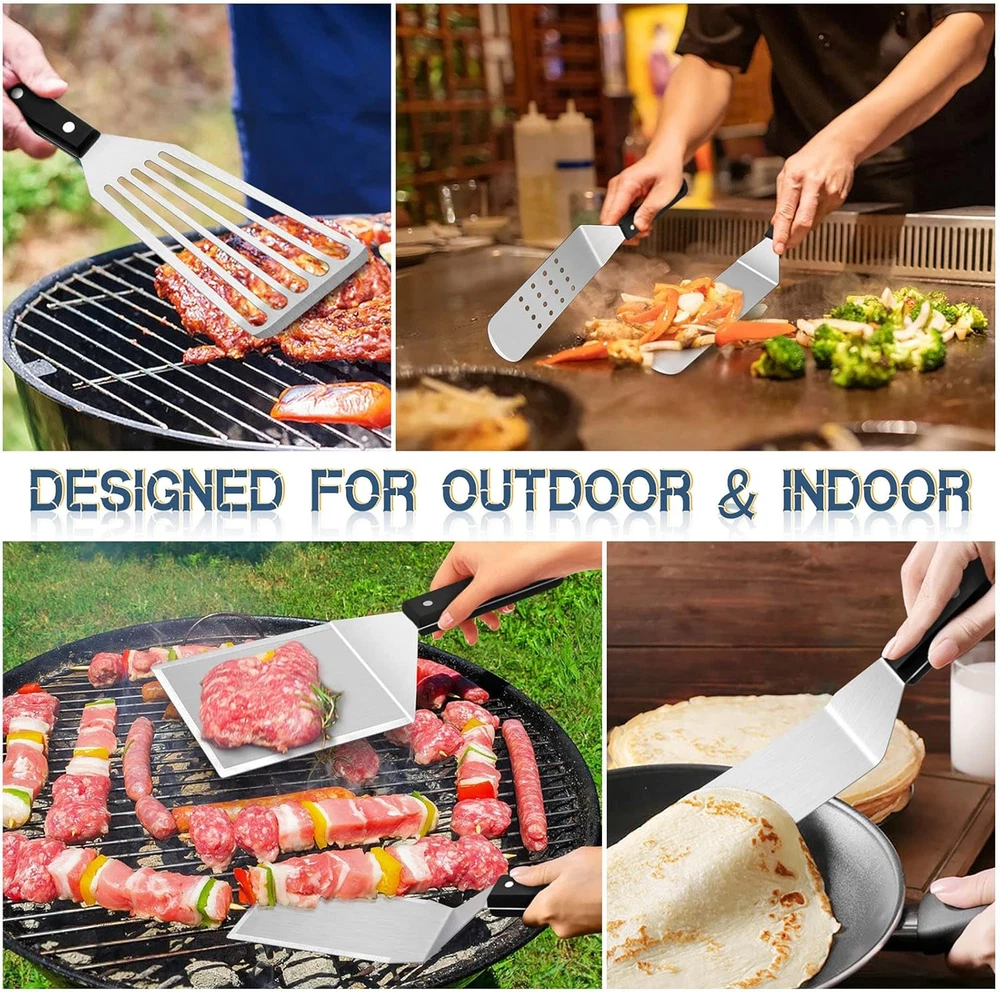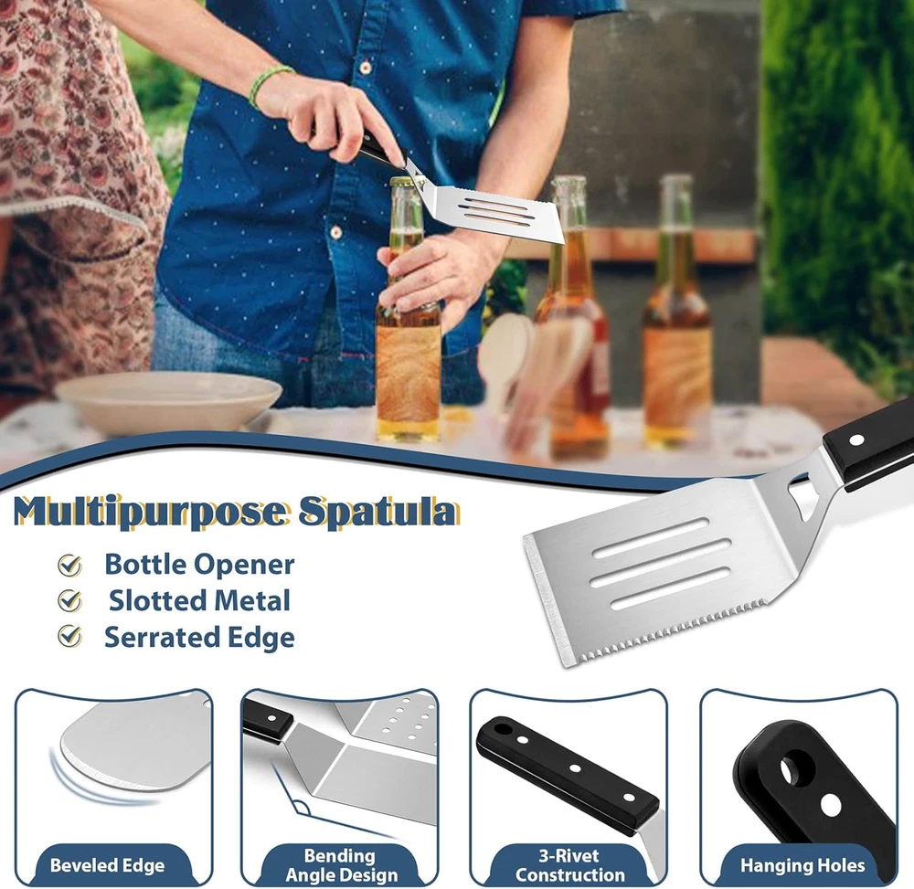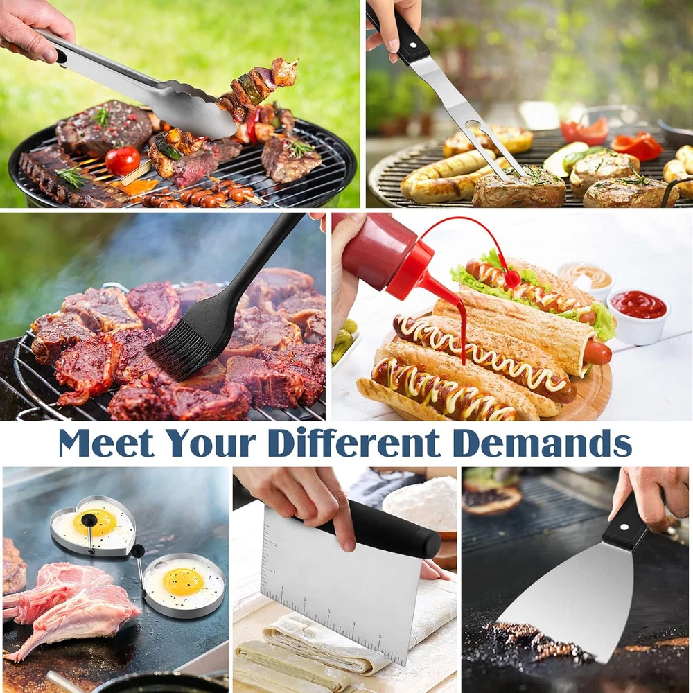 Griddle Accessories Kit Stainless Steel Flattop Grill Tools Set for Outdoor Camp 【VALUE GRIDDLE SET】 Package Included: 2 x Melting Dome ( 12”, 9” ), Long Griddle Spatula, Perforated Spatula, Multipurpose spatula, Burger Turner, Fish Turner, Griddle Spatula, Slant Edge Scraper, Bench Scraper, Narrow Turner, Cast Iron Griddle Press, Pigtail Food Flipper ( Right Handed ), Kitchen Tong, Grill Fork, Meat Tenderizer, 2 x Basting Brushes, 2 x Squeeze Bottles, 4 x Egg Rings, Storage Bag, Screwdriver 【PREMIUM & HEAVY DUTY】Our Grill Tools Set is made of high quality stainless steel, Which is food grade and heavy gauge, No worry any toxic materials into food, Dishwasher safe for less hassle, 1.5mm thick metal ensures holding heavy food without bending, Excellent heat resistant plastic handle, Effectively block the transfer of heat to keep your hands safe, 3-rivet construction increase the strength, Will not easy to fall off, Sturdy enough for long lasting use 【NECESSARY GRILL SPATULAS】 With 9 versatile spatulas, You will become the grill master on every BBQ party, Thin beveled edge sliding great under the food, 45° angled structure ensure a comfortable grip and help to flip food easily, Slotted design allows grease to drain for healthy diet, Holes on the handle are big enough to hang, Multi-Purpose Spatula has a serrated edge for cutting meat and also works as a bottle opener, Griddle Scraper with clear scale for precise measuring while using 【MELTING DOME & GRILL PRESS】 2Pcs Melting Dome help to avoid smells to be mixed together and reduce splatter, Retaining food moisture well to keep food juicy, Large cover is easy to deal with multiple steaks or large amount of vegetables, Small Lid is ideal for grilling patties or keeping food warm, Cast Iron Burger Press helps to retain and distribute heat perfectly, Pressing out excess fat or liquid from meats, Grooves texture will leave attractive grill marks on food 【THE EXTRA GRILLS TOOLS】 The Meat Flipper can pick up the foods without twisting, Won’t leave marks on the meats, Meat tenderizer has ultra-sharp needles, Help you quickly pierce the meat, Marinating it with condiments to taste more delicious, Grill Tong is strong enough to grip a large chunk of meat, Sharp Grill fork can grab meat while slicing meat, With a practical Carrying Bag, Convenient to take it anywhere Product Description Joyfair Griddle Accessories Kit is made of heavy duty stainless steel, allows these griddle tools maintaining a long service life. Suitable for most food, spatulas for flipping meat, sausages, cutting dough, basting cover for melting cheese, steaming vegetable, etc. 1 Melting Domes 2 More Details 3 Multipurpose 4 Easy to Use 1 Griddle Press 2 Pigtail Food Flipper 3 Meat Tenderizer 4 More Useful Tools Design for Outdoor & Indoor Item model number Griddle Accessories Set of 26 Item dimensions L x W x H 12 x 12 x 6 inches Material Type ABS Handles Product Dimensions 12 x 12 x 6 inches Material ABS Handles Country of Origin China Is Dishwasher Safe Yes Item Weight 4.71 Kilograms Handle Material Acrylonitrile Butadiene Styrene (ABS) Number of Pieces 26 Included Components Spatula Shipping Fast shipping is very important for us. Our expedited US shipping service is FREE. Your order will be shipped within 2 business days upon full payment received. Your order will be delivered within 2-3 business days after the handling time. Warranty & Returns 30-Day FREE Return Policy offered for unsatisfactory items. Options include: Refund or Exchange for another item. Contact us Customer satisfaction is our top priority. If you encounter any issues with our product, please don't hesitate to reach out to us. We are committed to ensuring your satisfaction and will go above and beyond to assist you. Your happiness is our goal! Thank you for shopping at our store.