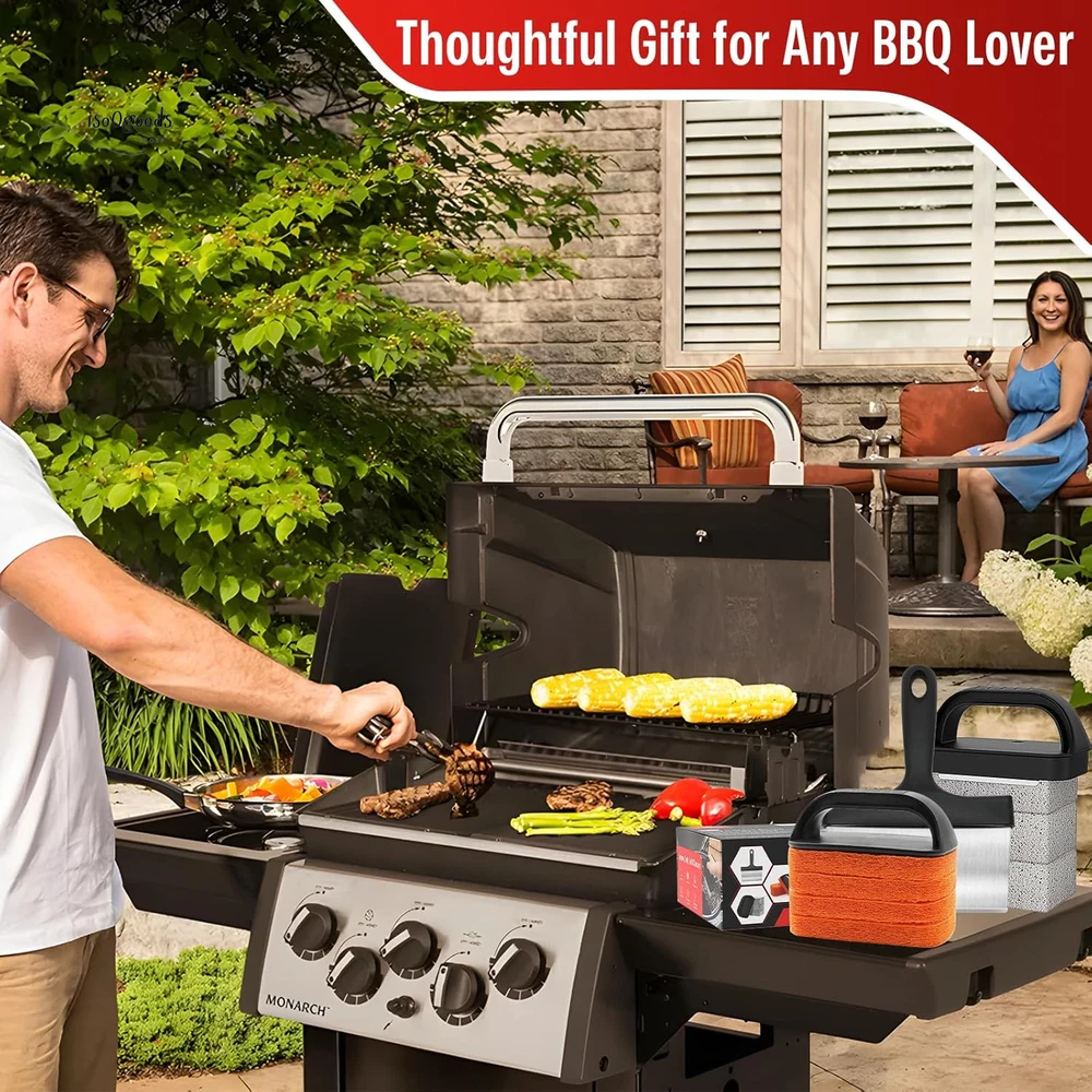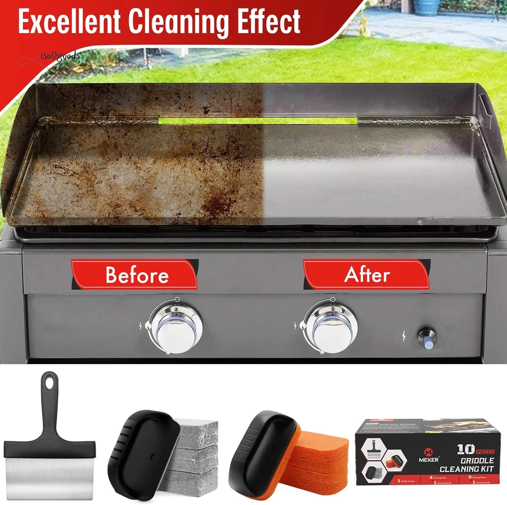Extend the Life of Your Griddle: Kickstart a healthy lifestyle with spotless kitchen tools! Use MEKER's griddle cleaning kit before and after cooking to prevent your griddle from flaking and damage. Proper re-seasoning ensures long-lasting use and optimal performance. Multipurpose Scraper: The versatile pan scraper is perfect for cleaning your skillet and griddle. Barbecue turners make flipping food a breeze, and the heavy-duty BBQ scraper can even chop food. Discover endless uses in your outdoor barbecue area—cleaning has never been this fun! Safe & Scald-Free: The flat top grill cleaning kit comes with scouring pads and an easy-to-install handle, perfect for use on hot or cold surfaces. Protect your hands from scalding and enjoy a hassle-free cleaning experience. Efficient Cleaning: A clean griddle surface is key to optimal cooking. Our BBQ Grill Bricks are made from 100% natural pumice stone, specifically designed for flat top grills. They won’t scratch ceramic tiles or metal surfaces, and they effortlessly remove residue, stains, and dirt. Effective on cast iron, pots, stainless steel griddles, and grills—say goodbye to stubborn residue! 10 Essential Tools: Looking for a thoughtful gift? This griddle cleaning kit is a must-have for any backyard kitchen. It complements griddles and grills like Weber, Charbroil, and Coleman. Treat yourself and your loved ones to the ultimate cleaning solution! Year-Round Use: The Griddle Cleaning Kit for Blackstone is perfect for both residential and commercial griddles. Whether you're a professional chef or a weekend grilling enthusiast, this kit ensures a clean and sanitary cooking surface. Product Description: Easy to Store All Purpose Ideal Gift Healthy Life
