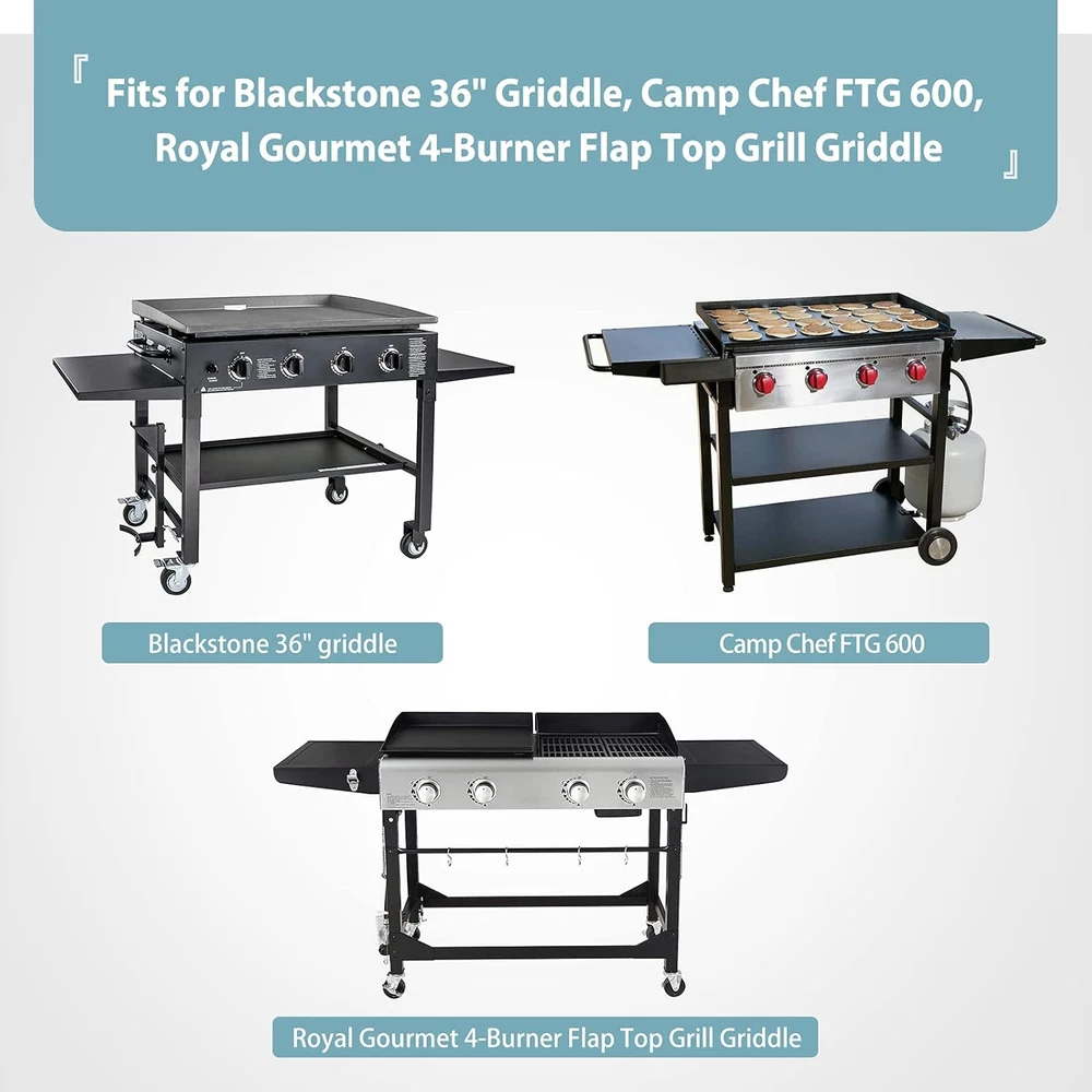 Griddle Cover Heavy Duty Waterproof for Blackstone 36" 4 Burner Flap Top Grill Better Protection: Add top vents on both sides, keep your grill dry on rainy days, and allow moisture to escape after rain Perfect Fit: Universal for Blackstone 36" griddle, Camp Chef FTG 600, Royal Gourmet 4-Burner Flap Top Grill Griddle, and More 4-Burner Griddle. NOT fit Blackstone 36” ProSeries Griddle Waterproof Design: With waterproof PVC coating, this cover provides powerful protection against any weather, preventing your grill from rusting Strong and Sturdy: Made of heavy-duty 600D fabric and with upgraded stitching, it will not crack easily and can be used for a long time Better Secure: Two straps are added on each side to secure the cover in place even in strong winds Product Description SHINESTAR Grill Cover Fits up to 66.5" W x 22.5" D x 26" H grills Fits for Blackstone 36" griddle Fits for Camp Chef FTG 600 Fits for Royal Gourmet 4-Burner Flap Top Grill Griddle and More 4-Burner Griddle NOT fit for Blackstone 36” Pro Series Griddle Item model number 00ABB232_AM01US09 Closure Type Buckle Color black Material Heavy Duty Material Type Heavy Duty Item Weight 3.47 pounds Is Discontinued By Manufacturer No Product Dimensions 66.5"L x 22.5"W x 26"H Shipping Fast shipping is very important for us. Our expedited US shipping service is FREE. Your order will be shipped within 2 business days upon full payment received. Your order will be delivered within 2-3 business days after the handling time. Warranty & Returns 30-Day FREE Return Policy offered for unsatisfactory items. Options include: Refund or Exchange for another item. Contact us Customer satisfaction is our top priority. If you encounter any issues with our product, please don't hesitate to reach out to us. We are committed to ensuring your satisfaction and will go above and beyond to assist you. Your happiness is our goal! Thank you for shopping at our store.