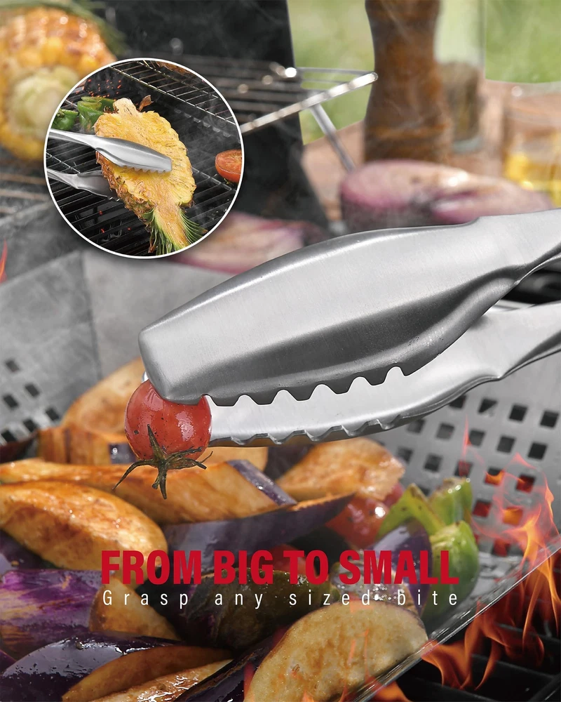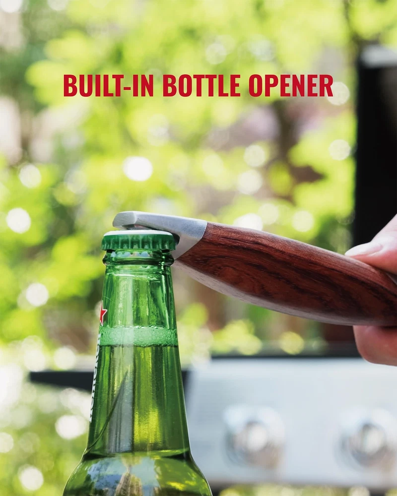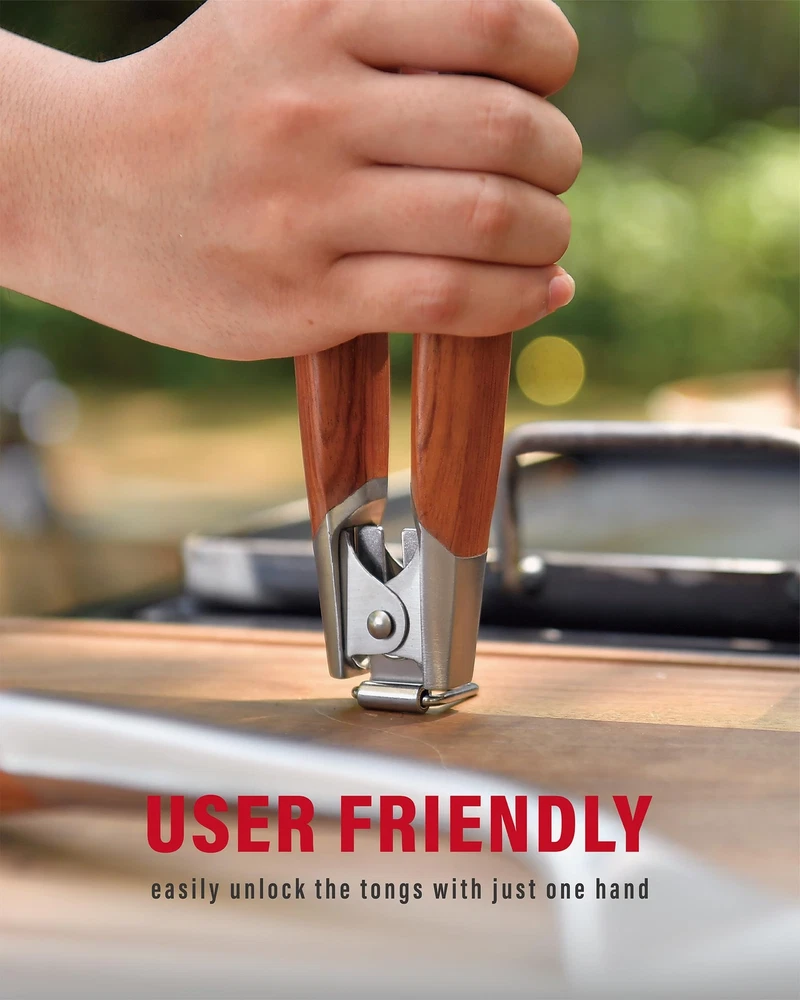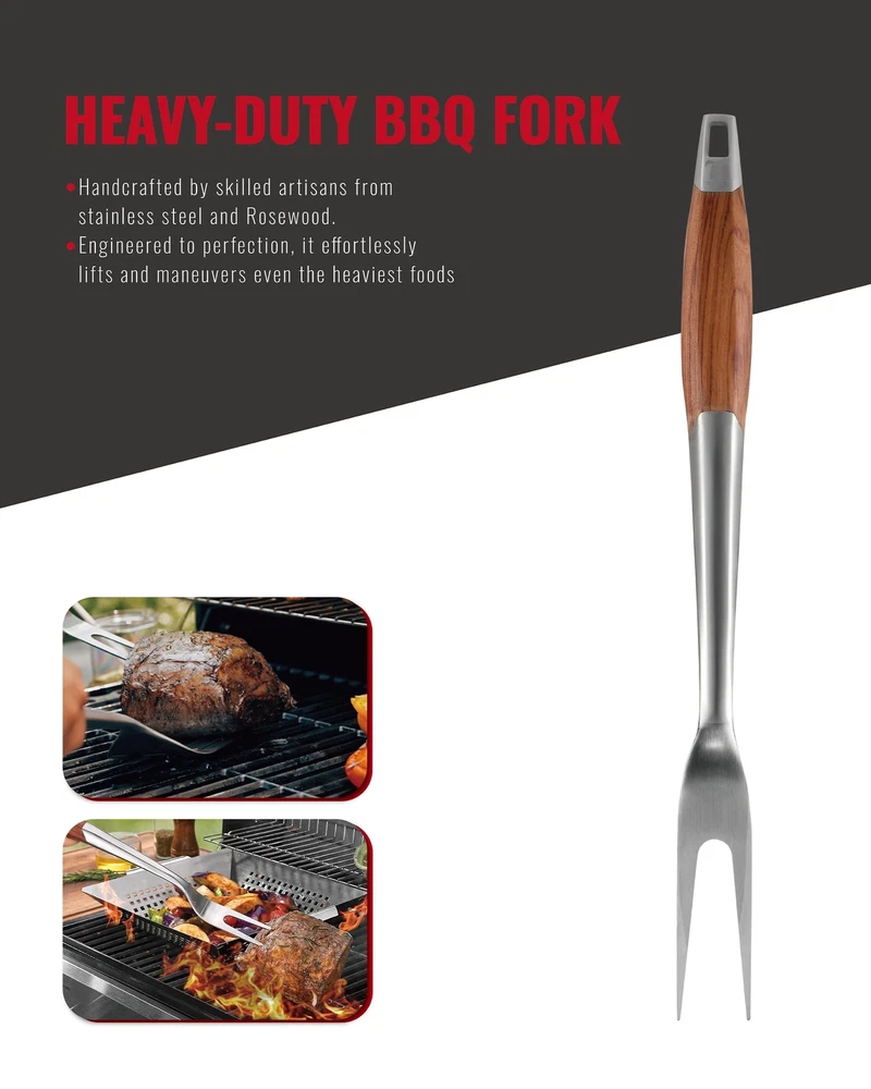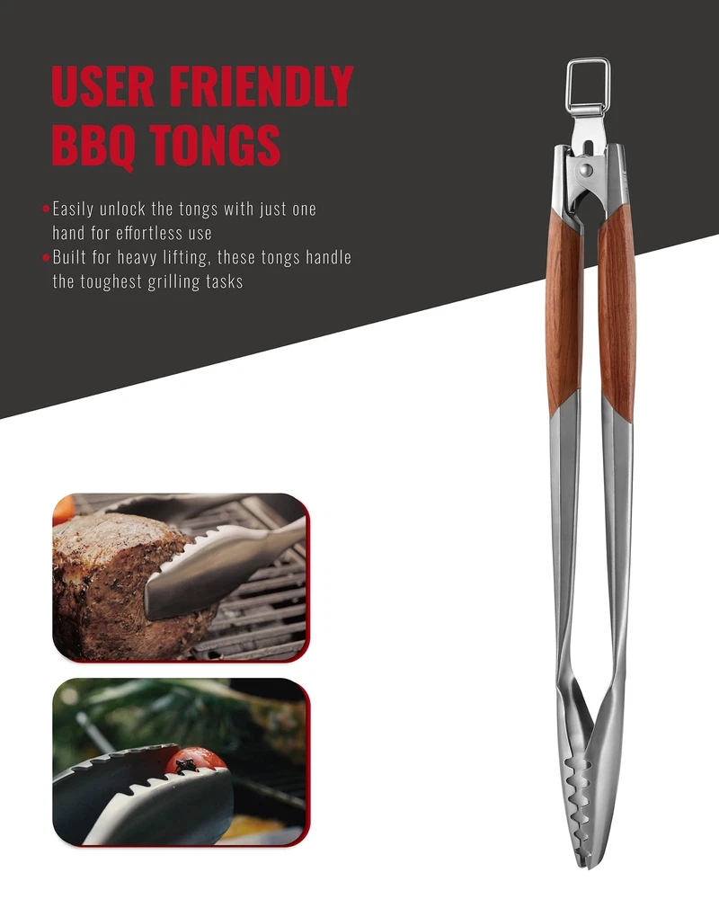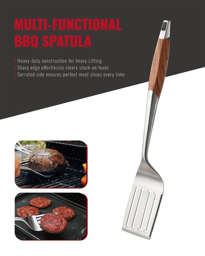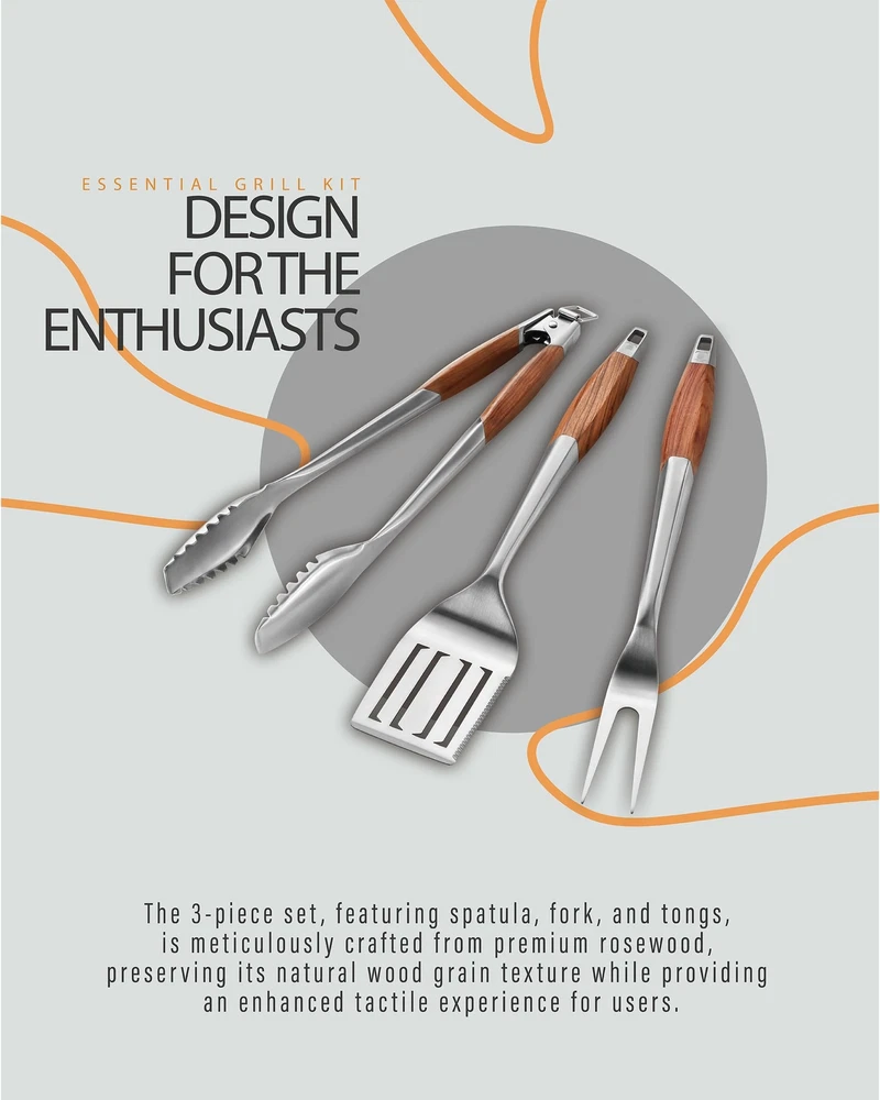 ๐๐ซ๐๐๐ญ๐๐ ๐๐ข๐ญ๐ก ๐๐ซ๐๐๐ข๐ฌ๐ข๐จ๐ง: our grilling set embodies top-tier quality, boasting meticulous workmanship. It includes a Spatula, Fork & Tongs forged from high-grade stainless steel and hand-polished rose wood for an exquisite finish. ๐๐ข๐ฆ๐๐ฅ๐๐ฌ๐ฌ ๐๐๐ฌ๐ข๐ ๐ง: Elevate your grilling experience with our set's sleek and sophisticated design, bringing a touch of elegance to every barbecue occasion. It's the ideal gift for grill aficionados, whether it's for your husband, father, or any barbecue enthusiast. ๐๐๐ซ๐ฌ๐๐ญ๐ข๐ฅ๐ ๐๐๐ซ๐๐จ๐ซ๐ฆ๐๐ง๐๐: Designed for culinary excellence, our multi-purpose spatula boasts a sharp bottom edge for effortless food flipping and a serrated side for precision slicing, while our Lockable Grill Tongs offer convenient storage and single-handed unlocking for seamless operation. ๐๐ง๐ซ๐ข๐ฏ๐๐ฅ๐๐ ๐๐ฎ๐ซ๐๐๐ข๐ฅ๐ข๐ญ๐ฒ Engineered to last, our grilling set combines strength and style, ensuring it stands up to the rigors of regular use and becomes your trusted companion for countless barbecue adventures. ๐๐จ๐ฆ๐ฉ๐ฅ๐๐ญ๐ ๐๐ซ๐ข๐ฅ๐ฅ ๐๐๐ฌ๐ญ๐๐ซ๐ฒ With its premium craftsmanship, timeless design, versatile performance, and unrivaled durability, our grilling set offers everything you need to master the art of grilling and become the envy of every backyard barbecue.