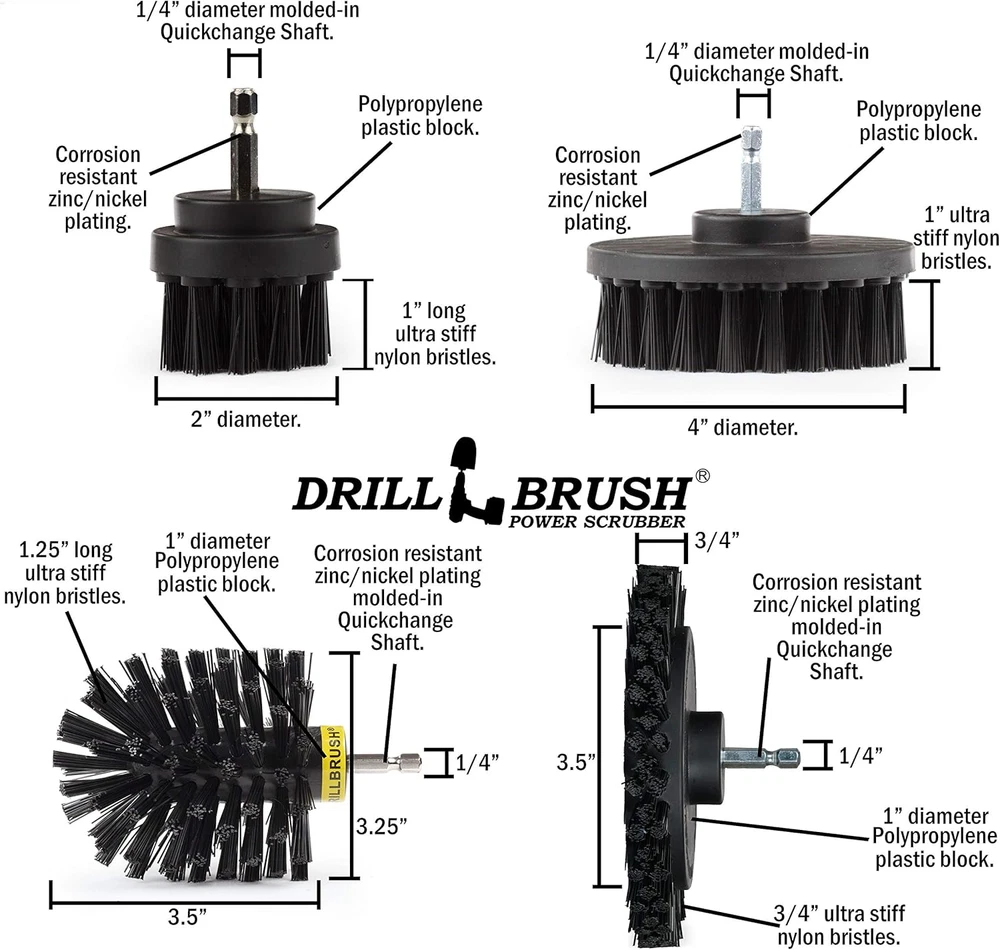 Grill Brush BBQ Cleaning Tool Set Scraper Stiff Bristles for Gas Electric Smoker Product Description Complete drill powered brush kit to clean BBQ grills and grates. Modernize your grilling game with these all nylon grill brushes from Drill Brush Power Scrubber by Useful Products. Steel wire fragments and food are not a good match. Why clean your grill, smoker, or grate with old fashioned wire brushes? Fragments of wire have been known to break off, contaminating the food and posing a serious health risk. These brushes are nylon, so always use their fearsome cleaning power on a COOL grill (brush will melt to a hot grill). Out camping and need a power cleaning solution for your cast iron skillet? The Black Original Drillbrush will return your cat iron cookware to like-new condition. The newly designed Ultra-stiff black nylon wheel brush has all the advantages of a tradition wire wheel brush without shedding loose or broken wires. Modernize your outdated rusty wire brushes that never get clean and tend to fray as well. Replace all your drill powered wire brushes with these aggressive, Ultra-stiff Black, all nylon, drill powered upgrades. No more broken and loose flying wires to deal with. All Drill Brush Attachments in this kit feature rugged steel, quarter-inch, quick-change shafts. Fits drills AND drivers. See our complete line of Drillbrush power scrubbing brush products by clicking on our brand. Cordless drill NOT included. Clean Faster Combine the spinning motion of your power drill with any of our brushes and start cleaning with speed and power used by professional cleaners everywhere. Clean Easier Drillbrush strives to make cleaning easier and more fun than ever before. We want to make cleaning less of a chore and give you more time to spend doing the things you love. Clean Better Drillbrush works hard to make sure you always have the right tool for the job. We are constantly listening to feedback and creating new products where we think we can help consumers start cleaning easier. Clean Anything Join the millions of happy Drillbrush customers and get that car, bathroom, kitchen, boat, garage, or grill looking brand new. Whatever the application may be Drillbrush has a cleaning kit for you. Unit Count 1 Count Number of Items 4 Color Black Product Dimensions 5 x 5 x 5 inches Material Nylon Handle Material Metal Item Firmness Description Stiff Item Weight 14 ounces Batteries required No Shape Round Specific Uses For Product function(f) {var _np=(window.P._namespace("DetailPageProductOverviewTemplatesJava"));if(_np.guardFatal){_np.guardFatal(f)(_np);}else{f(_np);}}(function(P) { P.when('A').execute(function(A){ A.on('a:truncate:po-attribute-truncate-3:updated', function(data) { var isTruncated = !data.truncateInstance.getIfTextFits(); var seeMoreElement = document.getElementById('po-attribute-see-more-id-3'); if(seeMoreElement) { seeMoreElement.style.display = isTruncated ? '' : 'none'; } }) }); })); Grill, Smoker, Oven, Charcoal Grates, Brick and Mortar, Stone Walls, Metal Surfaces, Concrete, Vehicle, Golf Club, Furniture, Patio, Deck See more Surface Recommendation Metal, Stone Global Trade Identification Number 00810003602558 Included Components Attachment Special Feature Bristle-Free Shipping Fast shipping is very important for us. Our expedited US shipping service is FREE. Your order will be shipped within 2 business days upon full payment received. Your order will be delivered within 2-3 business days after the handling time. Warranty & Returns 30-Day FREE Return Policy offered for unsatisfactory items. Options include: Refund or Exchange for another item. Contact us Customer satisfaction is our top priority. If you encounter any issues with our product, please don't hesitate to reach out to us. We are committed to ensuring your satisfaction and will go above and beyond to assist you. Your happiness is our goal! Thank you for shopping at our store.
