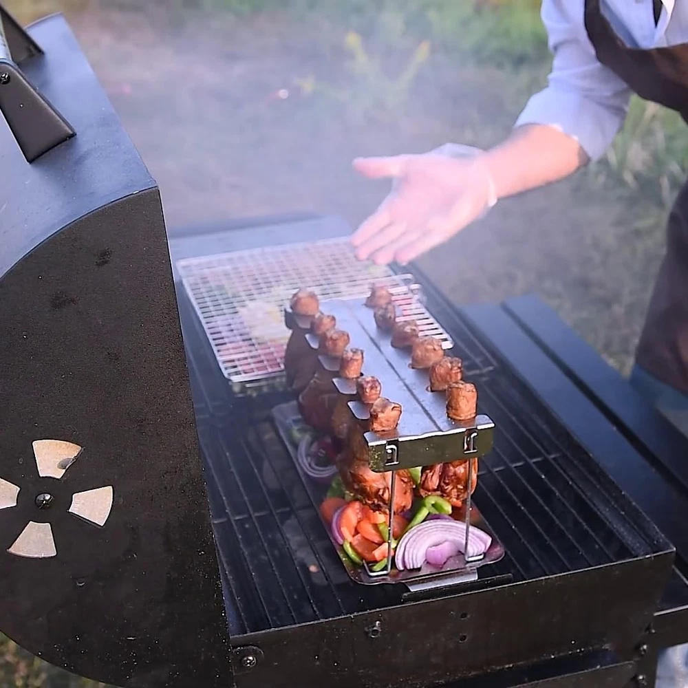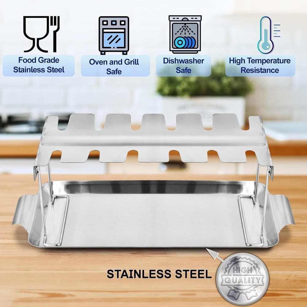 DURABLE AND LONG-LASTING This chicken leg rack for grill is crafted from premium quality stainless steel and thick metal to withstand high temperatures. Fade-resistant and non-corrosive, this chicken drumstick holder ensures long-term use for all your grilling, smoking, and oven needs. Plus, it’s food-safe, making it a reliable choice for your cooking. INCLUDES DRIP TRAY Designed with a drip tray that fits neatly under the chicken leg rack, it catches drips to prevent flare-ups on the grill and minimize mess. This chicken rack also allows you to use the flavorful drippings to enhance sauces or gravies for a delicious finish. Chicken Drumstick Holder for Grill Simply hang your drumsticks or wings in all 12 slots of this chicken lollipop rack and let them cook evenly without flipping! Not only does this chicken rack for grilling reduce cooking effort, but it also achieves perfect tenderness and juiciness on all sides, making your meal flavorful every time. Chicken Leg Rack for Grill with Drip Tray - 12 Slots Drumstick Rack