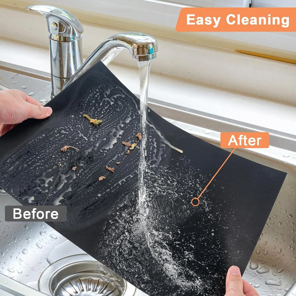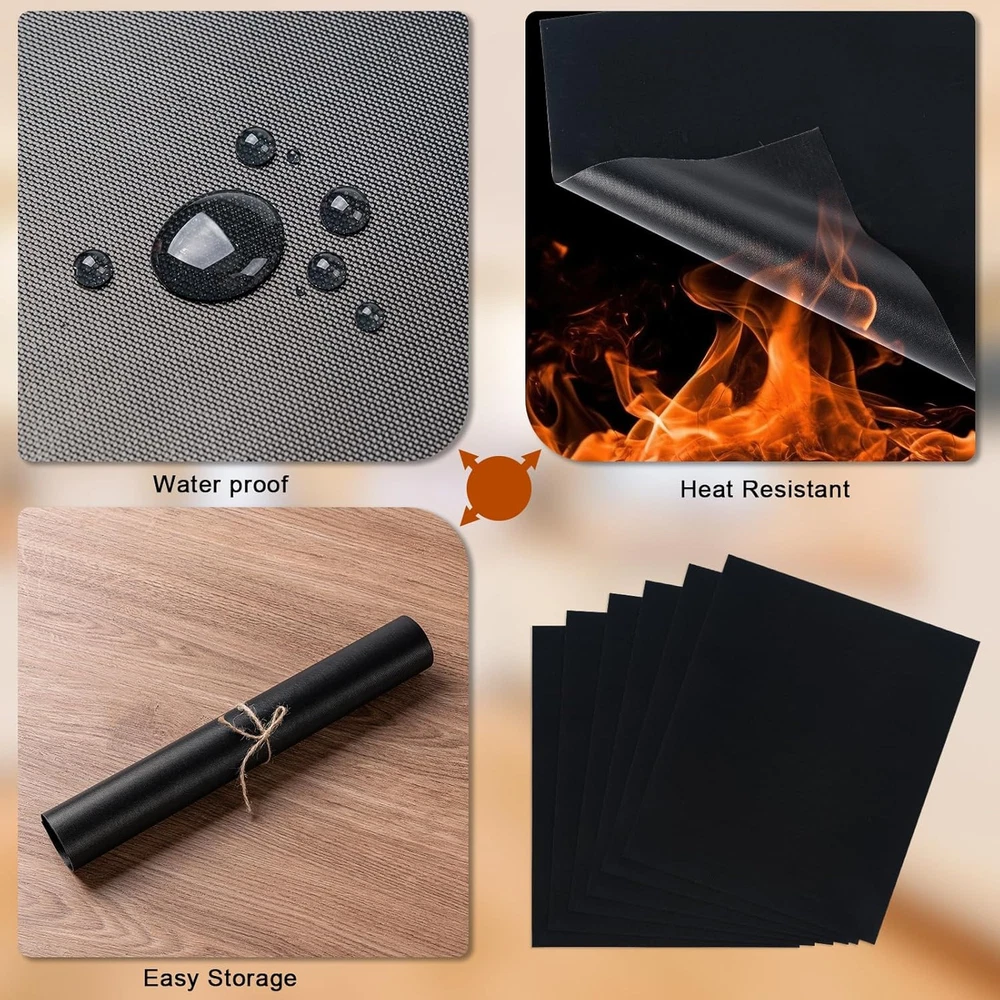 Grill Mats for Outdoor Grill, Set of 6 Reusable Baking 15.75 x 13 Inch, Black Product Details Material: Fiberglass Size: 15.75 x 13 Inch Color: Black Brand: Eisinly Product Dimensions: 15.75"L x 13"W Shape: Rectangular Is Dishwasher Safe: No Manufacturer: Eisinly Item Weight: 9.1 ounces Item model number: Grillmat-6PC Green Materials - Eisinly grill mat for outdoor grilling is made of Teflon and high glass fibers coating, no other harmful chemicals, you can cook healthier food and fully protect the health of your family and friends. Non-Stick - The black grill mats won't stick to anything on the grill, use these grilling accessories to grill vegetables, meat, fish, shrimp and even fried eggs, bacon and pancakes to get more out of your grill. We can enjoy healthier diet Heat Resistant - Our grilling mats can withstand up to 240 degrees without burning or contracting. It locks in moisture well and retains the flavor of the grill. When grilling, the mat is very hot, so please do not touch your skin directly Reusable - The bbq mats for grilling are reusable on both sides and lay flat on the grill to keep grease and grime from sticking to the grill, ready for the next barbecue Multipurpose - Can be widely used as BBQ mats, oven bottom liners, baking mats, cooking pads. Ideal for campground or park barbecues, they are the perfect grilling companion Easy to Clean - Simply wash or wipe clean after use, no odor left behind after cleaning. So you don't have to clean dirty grills anymore, perfect for protecting your oven and grill