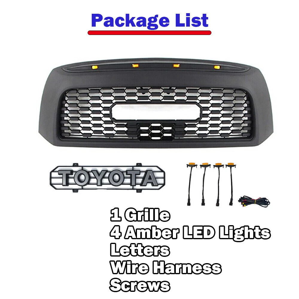 Product Description Grille For 2007 2008 2009 Toyota Tundra Honeycomb Grill Matte Black W/Letter ABS *NOTE: NOT FIT FOR THE TRUCK WITH FRONT CAMERA!!! Specification: Item Type: Front Grille Color : Matte Black Material: High quality ABS Features: *100% brand new *Made of high quality ABS Plastic. High strength, good toughness, corrosion resistant and not easily bent or cracked. *Lightweight Design:Reduce the weight of the car to reduce fuel consumption. *Easy to install. Plug and play, can directly replace the grille without any cutting or drilling. *Unique design improves stylish and sport appearance. Contains excellent impact resistance as well as durability, withstand heat and protect your truck from road debris. Package includes: 1x Front Grill with letters 4x Amber Lights & Wiring Harness Screws included About Us Payment Shipping Returns Contact Us Welcome to FunKit ,this is a professional shop selling Auto parts, with high-quality and affordable products.You can choose the products suitable for your car, we provide you with the best price and high quality products. Thank you for your business.If you have any questions, please contact us. Please leave us with positive feedback if you are satisfied with our products and services,if not, please contact us before leave any neutral or negative feedback,we'll try our best to satisfy with you. Thank you! We only accept PayPal payment. IMPORTANT NOTICE: We ship our products via FedEX or USPS. In some cases,your purchase will be shipped in two packages(e.g. Grille is in a package,letters,LED lights are in another packge),so please be patience if you recieve one of them first. -We do not offer expedited shipping. -We only ship to the Lower 48 states, and we do not ship to FPO, APO or PO Box addresses. And we are not responsible for wrong or undeliverable address. Please provide us your full address with Telephone number and make sure your shipping address is correct and deliverable. If you need to change your address,please change it in PayPal first before you pay. -Package handling only takes 1 business day at our warehouse, so please make sure entering correct payment and shipping information before checking out. -We are not responsible for any changed of address after item has been shipped. Return: We offer a 30-Day Limited Warranty. If you are not satisfied with your purchase, we are more than happy to offer an exchange or refund within 30 days. !!! No returns are accepted after installation/used. ***Received Incorrect / Damaged / Missing Item: Please take some photos of everything you have received in the package, along with a picture of the invoice and shipping label and send it to our email. We will take care of everything. Please inspect the items upon receiving any damages or missing contents. Please contact us within 7 days of delivery via email. If you change your mind / don't like it / buy it by mistake. Please repack the items carefully. Items to be returned must be in resalable condition. Returned items will be tested and if found defective / incorrect / damaged / missing parts,we will deduct the refund based on the condition of the item. The product must in brand NEW conditions and in original packaging. Installations: It is imperative that buyers understand the items are vehicle-related and require installation and vehicle knowledge. Some of our parts are direct from EUROPE or ASIA which may require modification to complete the installation. Most of the items do not have installation instructions. We highly recommend professional installation if you are not familiar with the installation. If you have any question regarding this listing, Please send us a message. Before leaving us neutral or negative feedback, please contact us first. We will do everything we can to give you a satisfying solution. We do our best to resolve any issue. Leaving negative feedbacks and low ratings doesn't get things solved. So please talk with us and we will not let you down. Business hours: Monday to Friday (exclude Holidays) 9:00 A.M. – 6:00 P.M. Pacific Standard Time ***We do not answer any emails over the weekends and holidays. All emails will be replied in the order it was received on the following business day. About Us Welcome to FunKit ,this is a professional shop selling Auto parts, with high-quality and affordable products.You can choose the products suitable for your car, we provide you with the best price and high quality products. Thank you for your business.If you have any questions, please contact us. Please leave us with positive feedback if you are satisfied with our products and services,if not, please contact us before leave any neutral or negative feedback,we'll try our best to satisfy with you. Thank you! Payment We only accept PayPal payment. Shipping IMPORTANT NOTICE: We ship our products via FedEX or USPS. In some cases,your purchase will be shipped in two packages(e.g. Grille is in a package,letters,LED lights are in another packge),so please be patience if you recieve one of them first. -We do not offer expedited shipping. -We only ship to the Lower 48 states, and we do not ship to FPO, APO or PO Box addresses. And we are not responsible for wrong or undeliverable address. Please provide us your full address with Telephone number and make sure your shipping address is correct and deliverable. If you need to change your address,please change it in PayPal first before you pay. -Package handling only takes 1 business day at our warehouse, so please make sure entering correct payment and shipping information before checking out. -We are not responsible for any changed of address after item has been shipped. Returns Return: We offer a 30-Day Limited Warranty. If you are not satisfied with your purchase, we are more than happy to offer an exchange or refund within 30 days. !!! No returns are accepted after installation/used. ***Received Incorrect / Damaged / Missing Item: Please take some photos of everything you have received