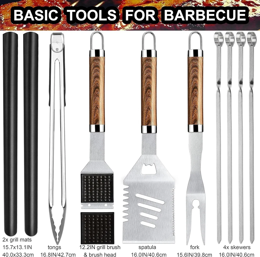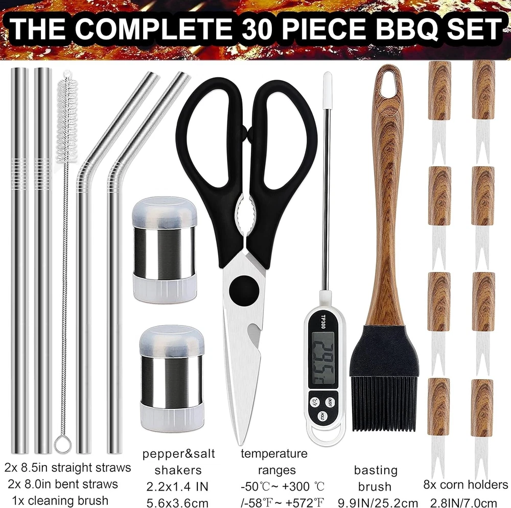 Grilljoy 31PC Heavy Duty BBQ Grilling Accessories Grill Tool Set - Stainless Steel Grilling Kit with Storage Bag for Camping, Tailgating - Perfect Barbecue Utensil Gift for Men Women--Paper package box might vary from image shown · Unlike many other grill utensil set that are flimsy, rust, or break after a few uses, our 31-piece premium BBQ set boasting the variety of grill accessories is crafted with high-quality stainless steel for ensuring its feature of durable and long lasting, so you won?t constantly replacing your grill accessories and always have the right BBQ tool at hand. · Suited to any grills, GRILLJOY barbecue kit set is the best grill utensil set you could ask for. With spatula, tongs, fork, basting brush, cleaning brush, extra brush head, glove, thermometer, grill mats, skewers, corn holders, salt & pepper shakers, scissors & straws set, you have everything you need to grill masterful meals and all the grill gadgets will last for years. · Bring out your inner grill master with this complete BBQ tool kit. From slotted spatula to grill gadgets, it?s necessary to have the versatile grill tools to keep your grill running smoothly. All long-handled BBQ accessories make it safer to grill over high heat, while a 4-1 massive spatula helps prevent scalding food drippings from splashing on unsuspecting grills, and the fork with curved tines let you grab large meat with ease. · Additionally, dependable grill cleaning tools for extending your grill life and keep it looking like new; Kitchen scissors crafted to assist with daily food preparation; Updated thermometer is the ultimate grilling tool for achieving grilling perfection. You are a better chef than you imagine but needed the right grill tools to prove it! Now you have them. · Also, the superb quality grilling accessories all fit perfectly in the storage carrying bag, which is a great grill gift for any grilling enthusiast on Birthday, father?s day& any holidays! Whether you are grilling in your backyard, tailgating at the game or grilling up at the campsite, this compact carrying bag makes it easy to carry these BBQ tools anywhere you light up your grill.