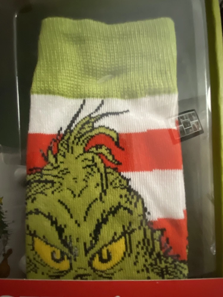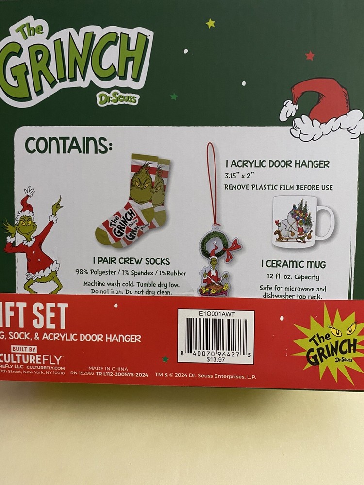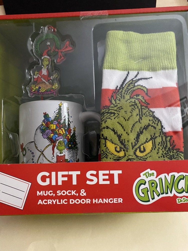 New The Grinch Dr Seuss Gift Set 12 Oz Ceramic Mug,Crew Socks,Acrylic Door Hanger The Grinch Dr. Seuss Gift Set includes a 12 oz ceramic mug, crew socks, and an acrylic door hanger. The set features an animated Grinch character in green, yellow, and red colors, perfect for a Christmas occasion. This licensed reproduction from Culturefly is part of the Dr. Seuss collection and is ideal for fans of The Grinch. New unused condition in original packaging, thanks for looking.