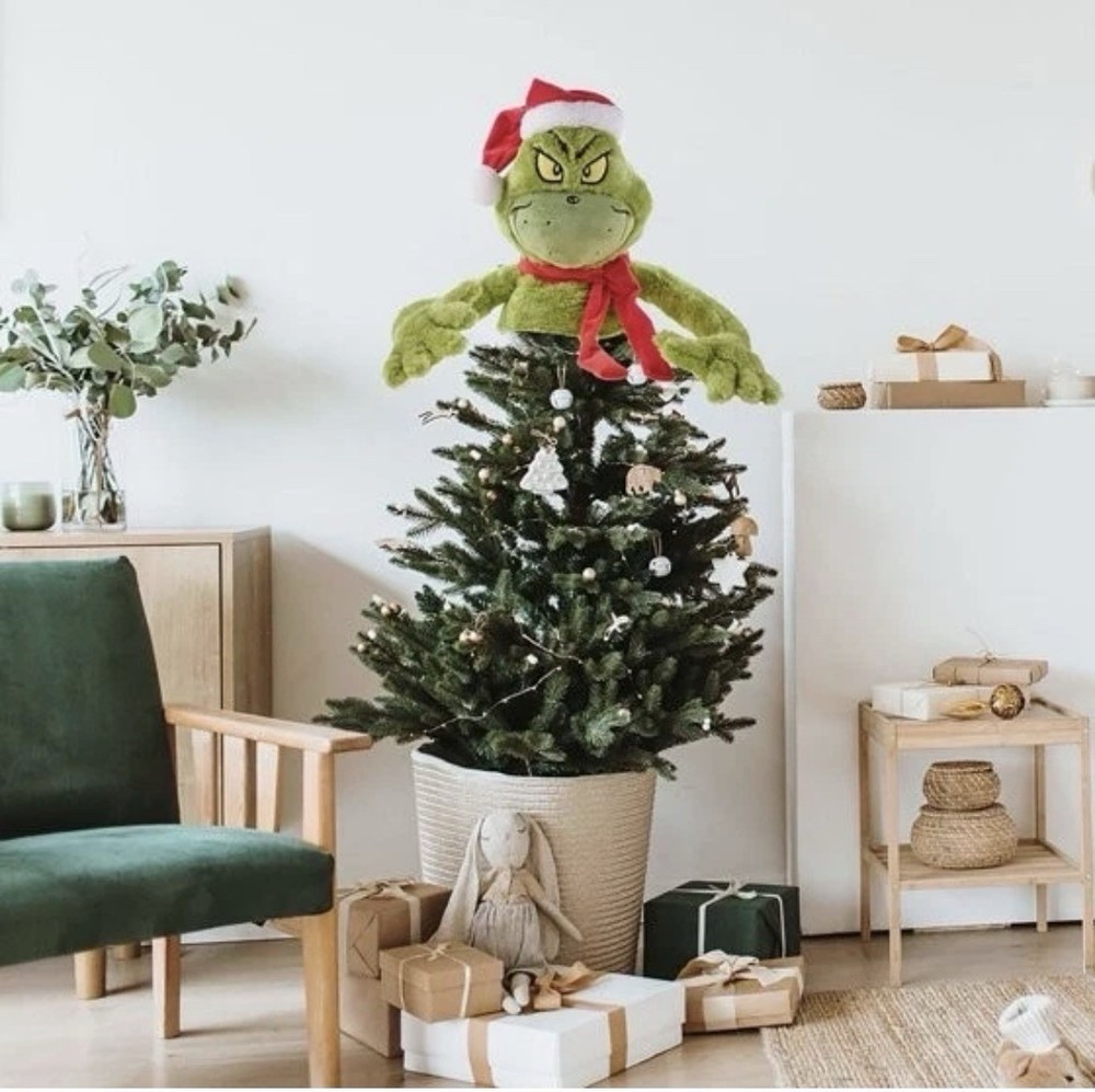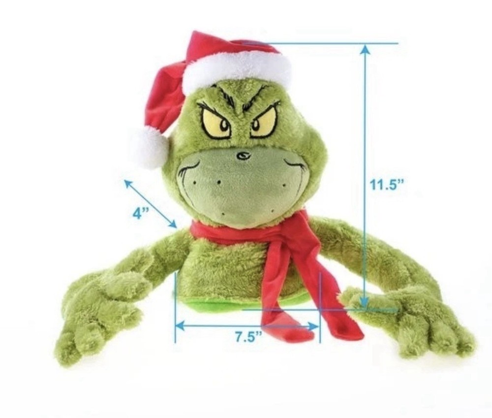 The Grinch Tree Hugger Topper Plush Christmas Decor is a 12-inch green ornament featuring the iconic character from Dr. Seuss' "How the Grinch Stole Christmas." Made of polyester, this licensed reproduction from 2021 is perfect for collectors and fans of the holiday classic. This posable ornament is an ideal addition to any Christmas tree, bringing a touch of whimsy and nostalgia to the festive season for families to enjoy.
