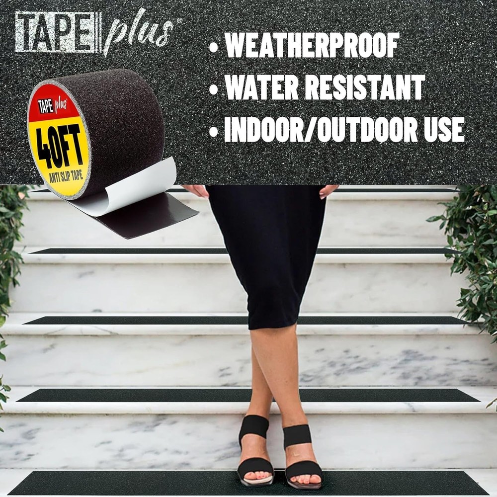 Grip Tape for Stairs - 4 in x 40 ft, Black - 80-Grit Waterproof Traction Tape for Indoor & Outdoor Steps - Tread & Traction Strips for Steps Enhanced Traction Safety: Tape Plus Grip Tape for Stairs features a robust 80-grit texture, ensuring superior stair traction for both indoor and outdoor stair treads. Its durable waterproof design offers reliable safety on ramps and wooden steps throughout the Versatile Surface Application: This anti slip tape is ideal for a variety of surfaces, including decks, boats, and skateboards. Whether for outdoor stair treads or grit strips for outdoor stairs, it provides a secure grip wherever applied Effortless Installation: Enjoy the simplicity of applying our stair traction strips by preparing the surface, measuring, cutting, and adhering the tape smoothly. Achieve optimal effectiveness with minimal effort for enhanced safety Durable All-Weather Design: Built to withstand various environmental conditions, this outdoor stair tread tape maintains its peel-resistant and durable properties. Rely on its ability to deliver consistent grip for outdoor stair treads and steps Commitment to Quality: With high-quality materials, Tape Plus ensures each roll of grit tape for ramps meets rigorous standards. Our dedication to excellence supports your needs for dependable stair traction strips and ramp grip solutions