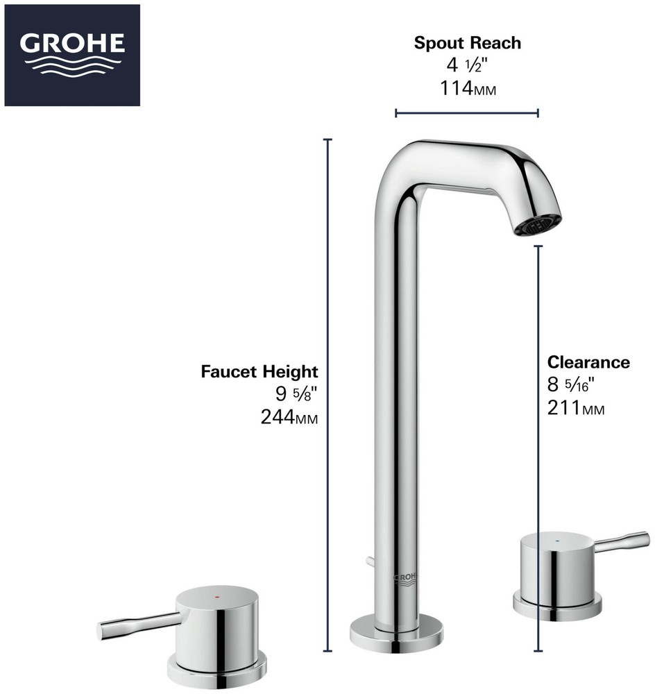 Item Length: in MPN: 2029700A California Prop 65 Warning: No Model: 20 297 A Number of Faucet Handles: 2 Spout Reach: 5.25 Color: Chrome Installation: Deck Mounted Type: Bathroom Sink Faucet Spout Height: 6.3125 Country of Origin: Mexico Material: Metal Number of Faucet Holes: 3 Faucet Mounting Type: Wide-Spread Item Height: 8 in UPC: 4005176406966 Features: Grohe 20 297 A Essence 1.2 GPM Widespread Bathroom Brand: Grohe Item Width: in gtin13: 4005176406966 Finish: Chrome Collection: Essence Flow Rate (GPM): 1.2