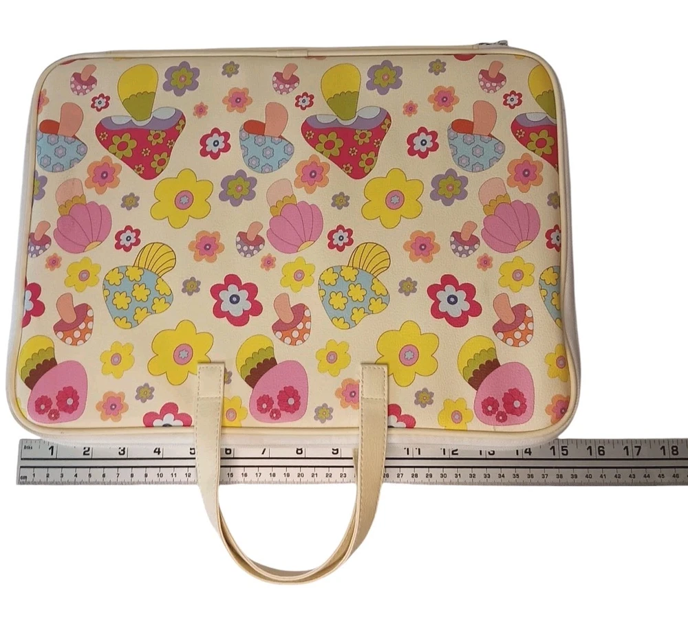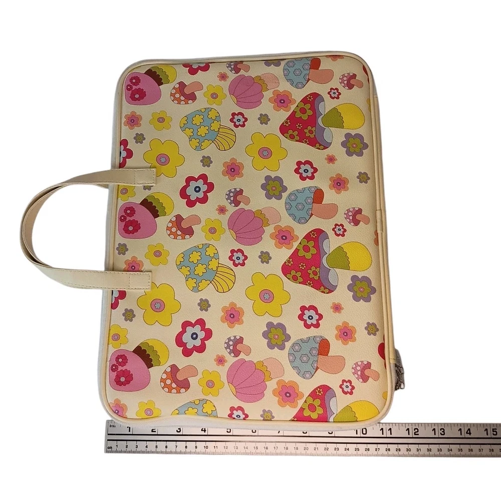 Type: Cushion Features: Foldable, Padded Item Length: 11 in Brand: Wildflower Compatible Laptop Size: 14 in Laptop Pattern: Mushrooms and flowers Item Width: 15 in Material: Nylon Color: Pink, Yellow, Red, Blue