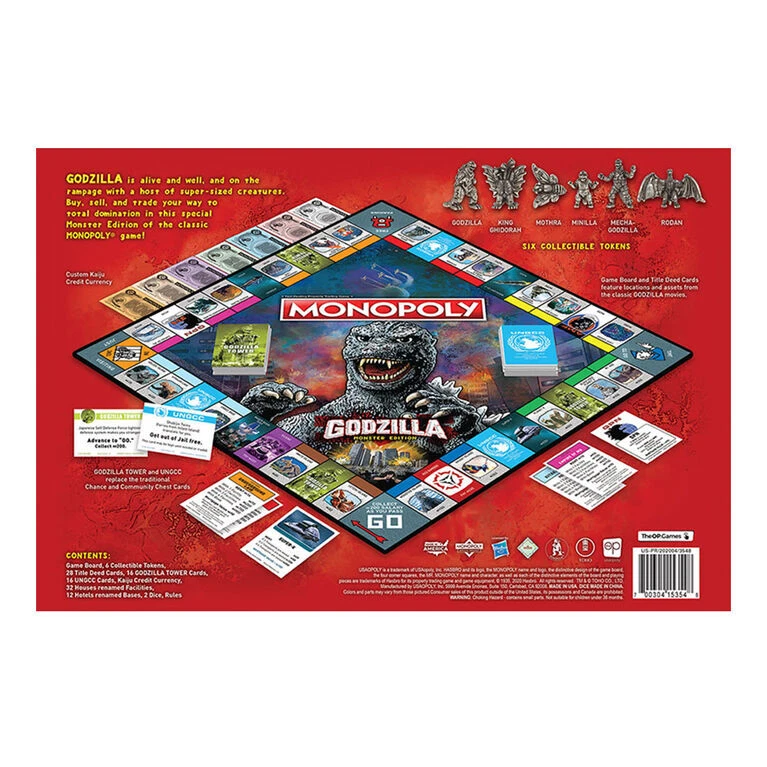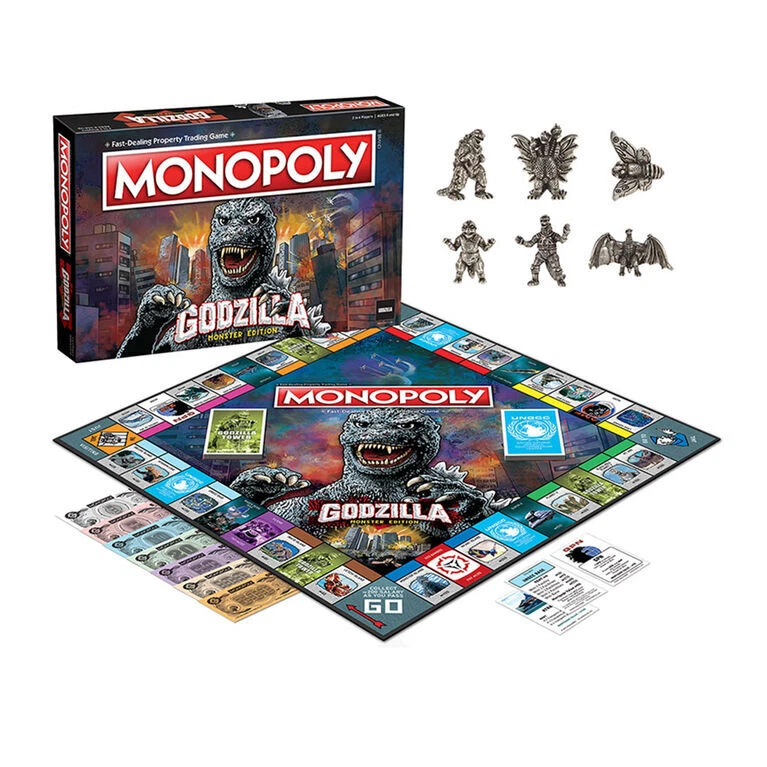 Demolish the competition in a city-terrorizing twist on the classic board game with MONOPOLY: Godzilla. Begin the invasion by buying, selling and trading locations like Monster Island, Goro's Workshop, and Kitakami Lake and take over the board with Facilities and Bases. Custom sculpted tokens of giants such as Mothra, Godzilla, King Ghidorah, and Mechagodzilla easily impose on anything in their path! AGE: 8+ 2-6 Players 60+ Minutes Expanded assortment available online. This item not carried in store. ||DPSP-TO94B13AA7 Our Store We have more items available. Please check them out. Shipping & Handling Flat shipping rate, if specified, does not apply to Canadian territories and remote areas. For U.S., flat shipping rate only applies to lower 48 states. Please contact us for shipping rate if flat shipping rate does not apply to you. Upon receipt of payment, item will ship via Canada Post surface or UPS, Fedex Ground service or another economic service within the timeline specified in item listing. If possible, we will combine shipping for multiple items. International Orders Import duties, taxes, customs fees and charges are not included in the item price or shipping charges. These charges are normally collected when you pick up the package. Please check with your country's customs office on what these additional charges will be prior to buying the item(s). International buyers are responsible for these charges. Please note that package shipped from outside your country can be held up in customs and it can cause delay in shipping time. This is beyond our control and there is nothing we can do to speed up the process. Sales Tax For the Canadian buyer, applicable retail sales tax will be charged. Taxes are charged on both Item Price and Shipping & Handling charges if applicable. Store Policy Sales Agreement Upon purchase, you have entered a binding contract under the terms of the listing. If an item is out of stock or on backorder , you will be notified and given the option to wait for the item to become available, choose another item, or a full refund. Backordered items are shipped as they become available. Return and Refund Unless specified otherwise, every item purchase (except health, hygienic, food products and items with No Return Accepted specified in the listing) comes with unconditional money back guarantee minus shipping & handling charge and 20% restocking fee . Before returning, please contact us for a RMA number. All returns must come with a RMA number. Return without a RMA number will NOT be accepted. Buyer is responsible for the shipping cost of returning the item(s) to us and all original shipping, handling, insurance, and other fee associated with the returned item(s) are not refundable. For free shipping item(s), we still pay for shipping when sending item(s). The shipping cost associated with free shipping item(s) is not refundable. All merchandise returned must be in its original states with tag intact, undamaged, clean and unused. Any return must be made within 30 days of receipt. Upon receipt and careful examination of the returned merchandise, refund will be issued and you will be notified after the refund is processed. Please allow 5 business days from the time we receive your returned item(s) for your refund to be issued. Communication All communication must be conducted via online message. We do not offer customer service over the phone. We answer all messages promptly, usually within 1-2 days. As a general note, if you do encounter a problem with your item(s), please contact us as soon as possible before leaving a negative feedback. We will do our best to help you. Contact Us For local pickup, special requests and special offers, please contact us.